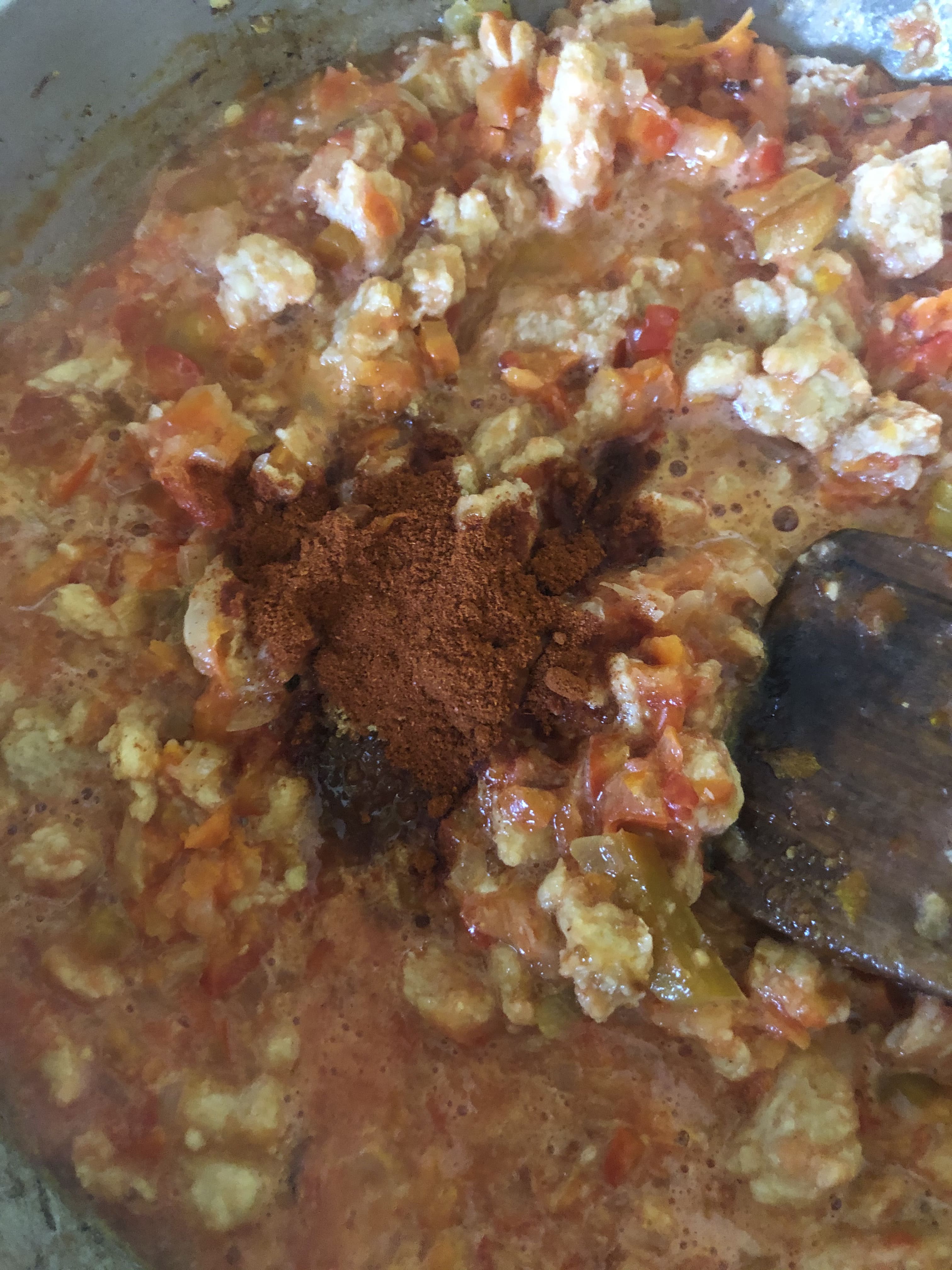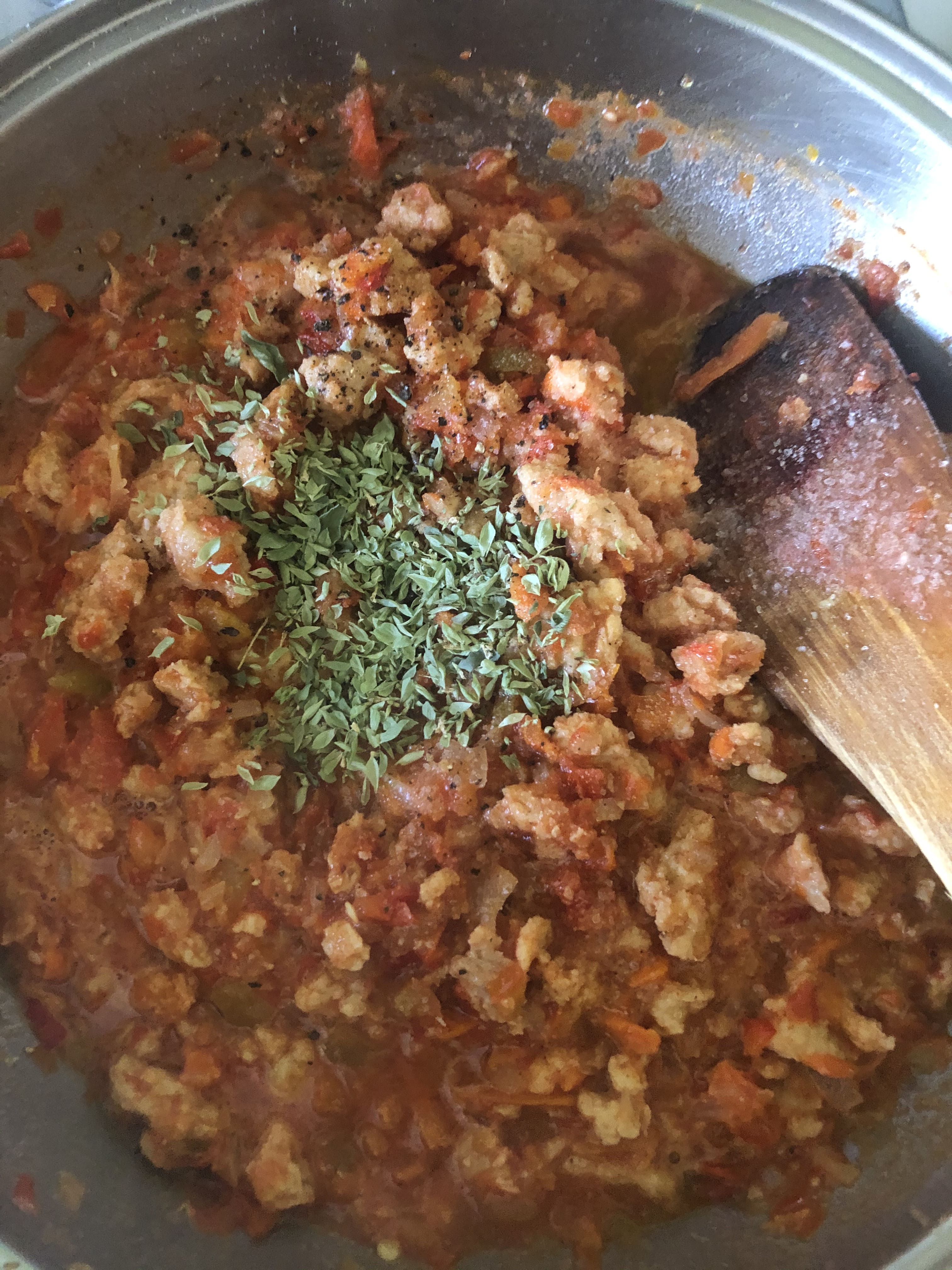 Agrega el tomate triturado, el azúcar y el pimentón (para reducir la acidez) y el orégano. Cuando empiece a hervir, baja el fuego, cubre con una tapadera y deja que se cocine por unos 30 minutos removiendo de vez en cuando (yo lo tuvo unos 50 minutos porque tenía tiempo y quería un sabor intenso 🙂 ).