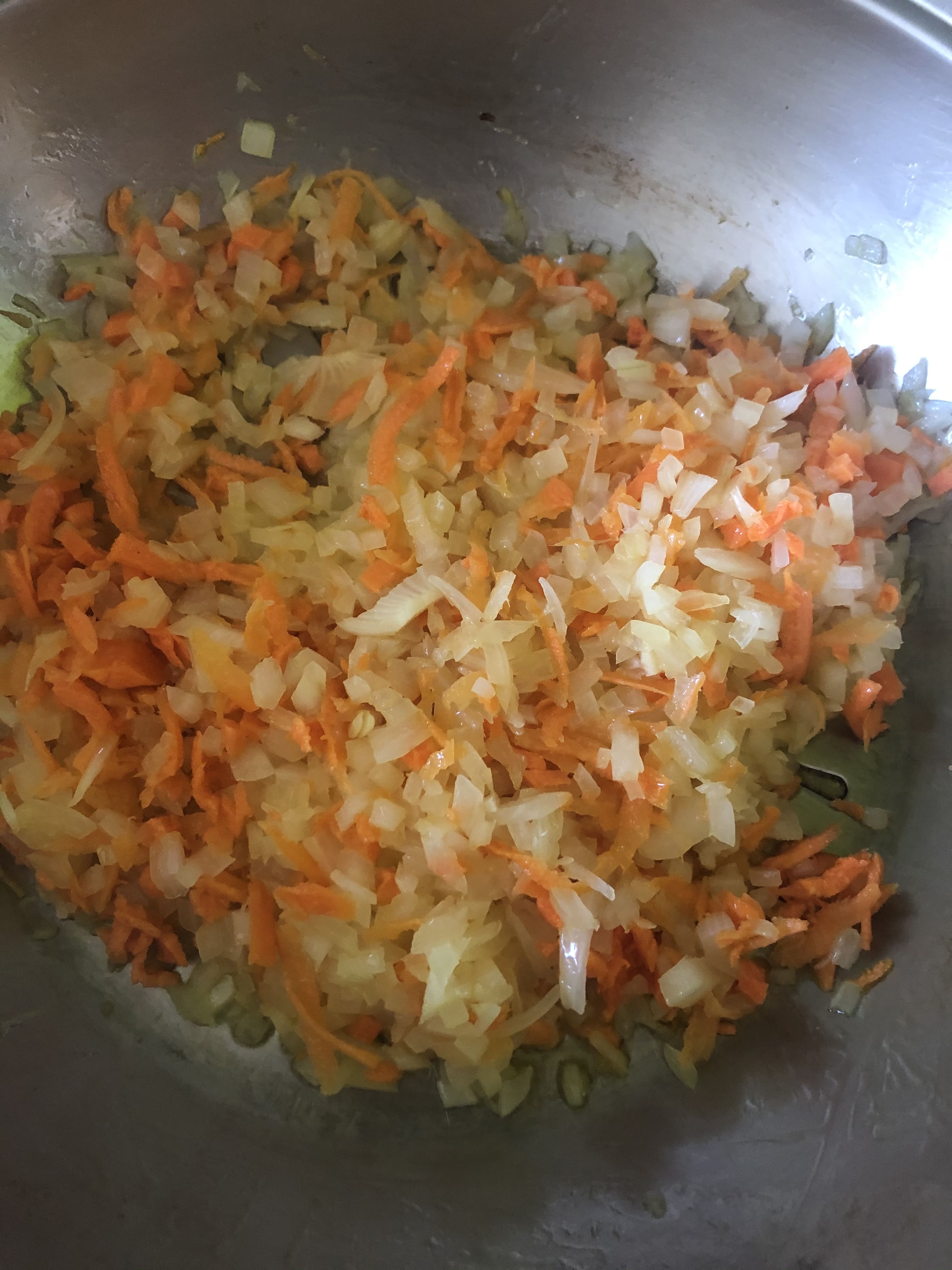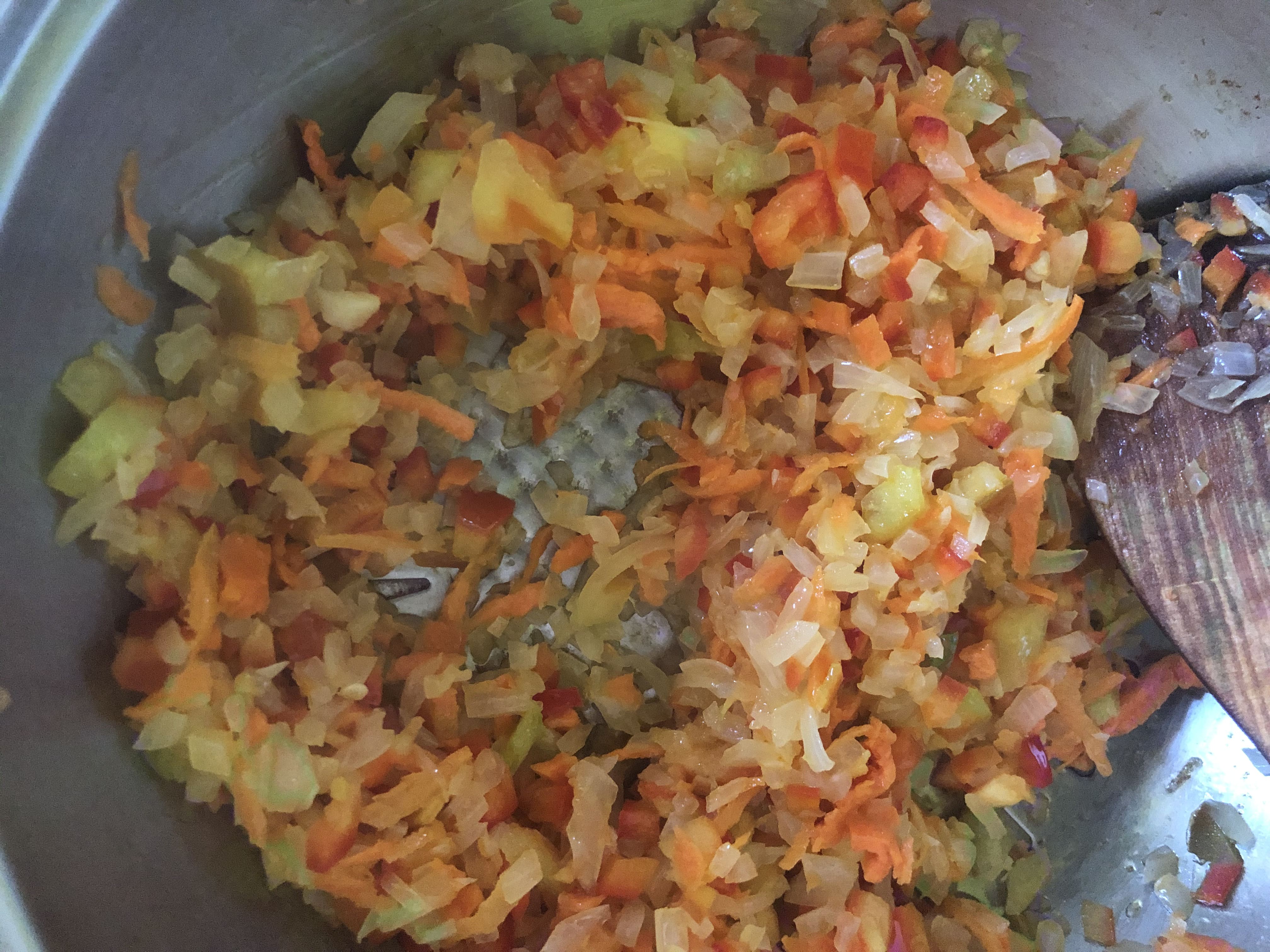 En una cazuela o sartén honda añade un chorro de aceite (no demasiado). Añade la cebolla y rehoga a fuego medio, removiendo frecuentemente. Cuando empiece a transparentar agrega la zanahoria y pasados unos minutos el pimiento. Remueve todo junto hasta que esté blandito. Añade la soja, el laurel y el ron e integra para que se mezcle todo bien.