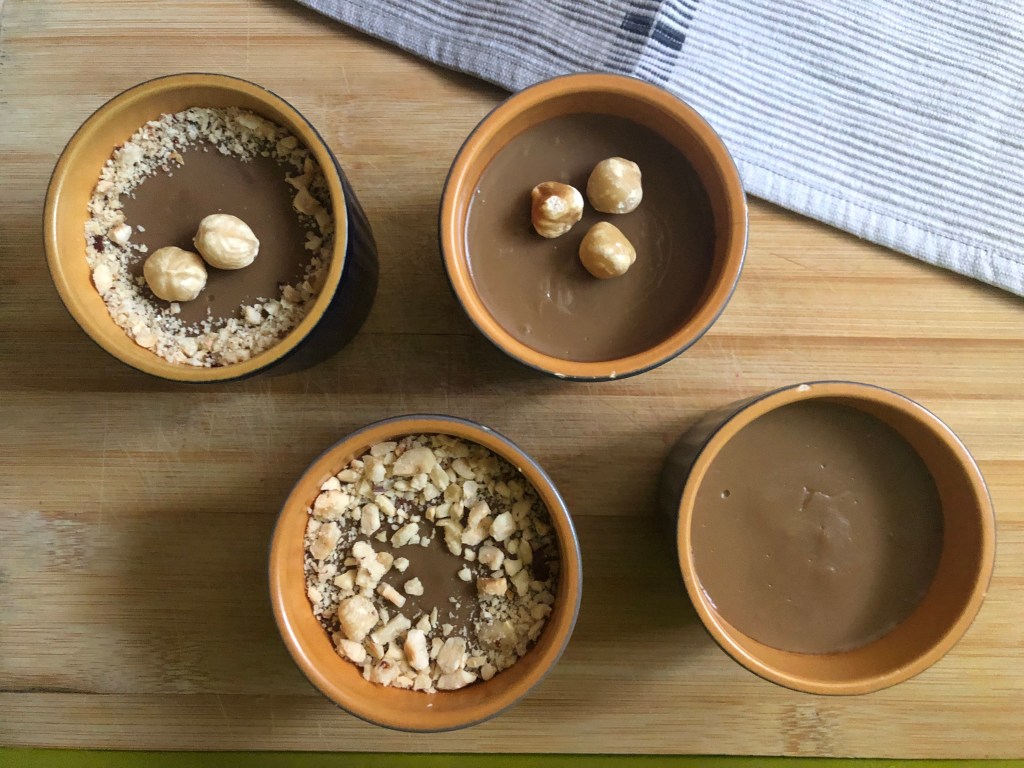 Sirve en moldes individuales y deja enfriar. Lleva al frigo durante unas 4 horas (mejor de un día para otro). Decora con crocanti de avellanas.
