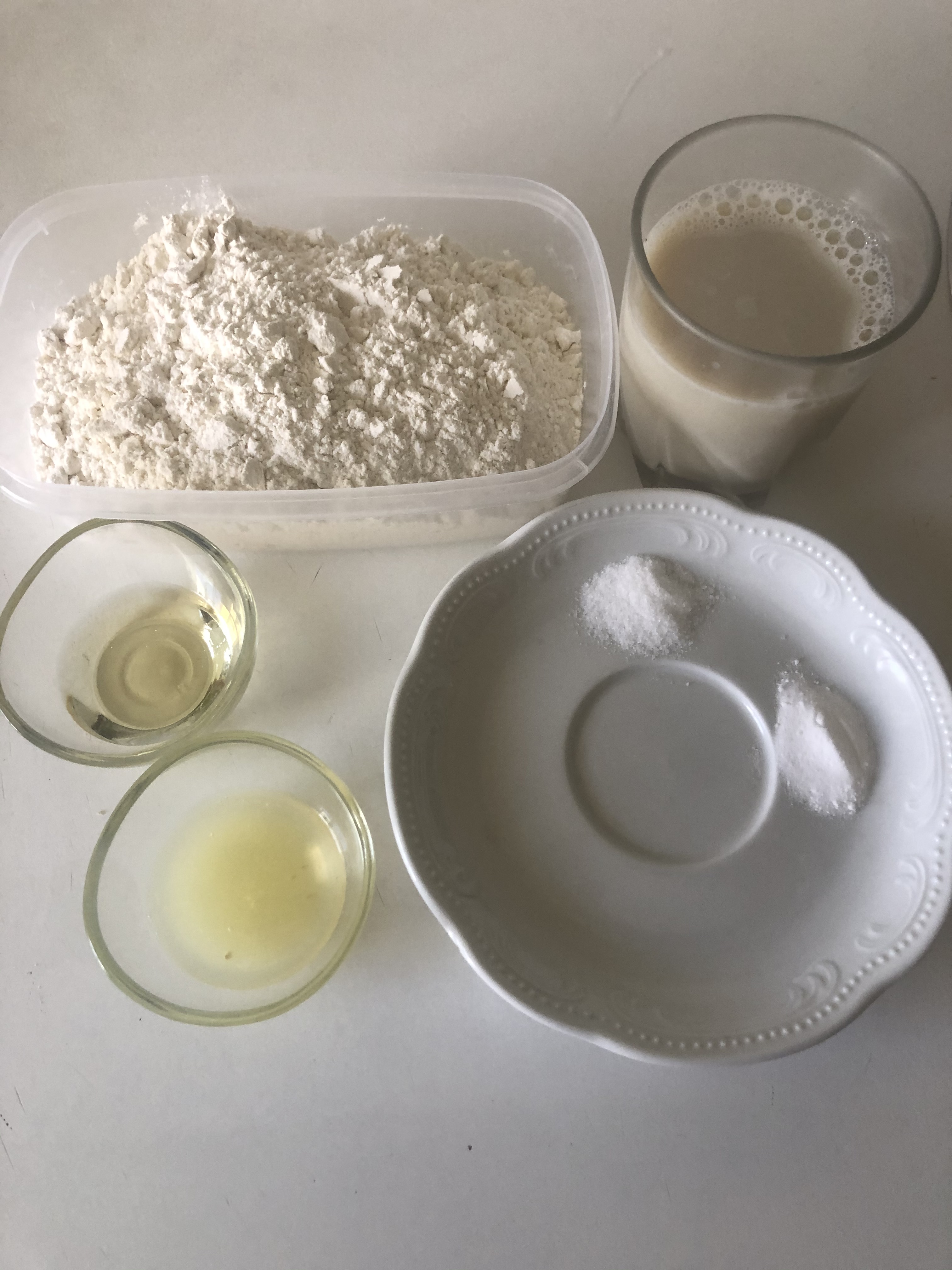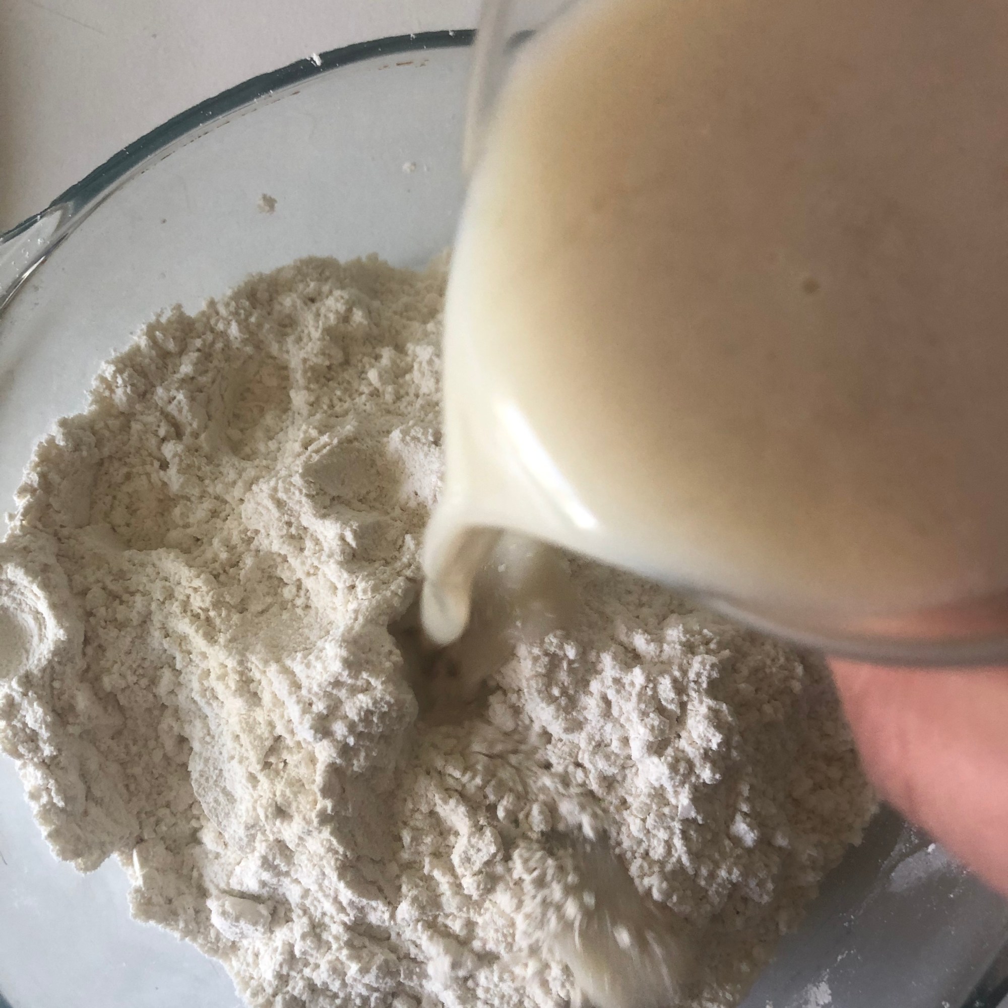 Para elaborar este pan, se prepara un buttermilk o suero de mantequilla, mezclando la leche con zumo de limón. Se producirá una mezcla cortada (en las leches vegetales no pasa eso), que confiere una mayor esponjosidad a la masa.
