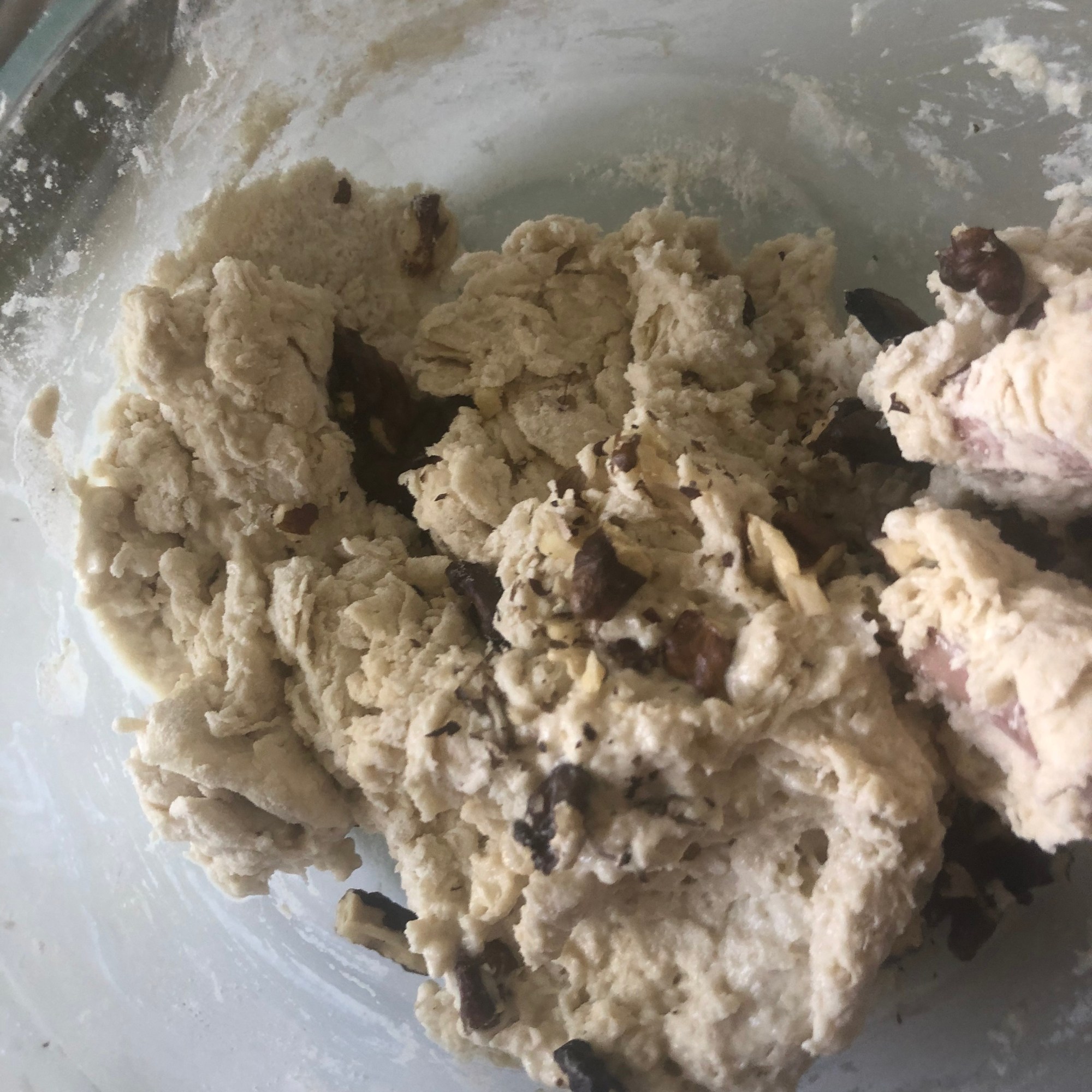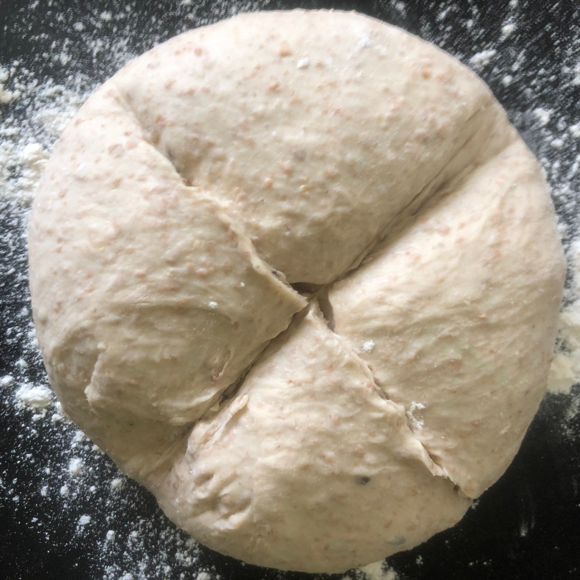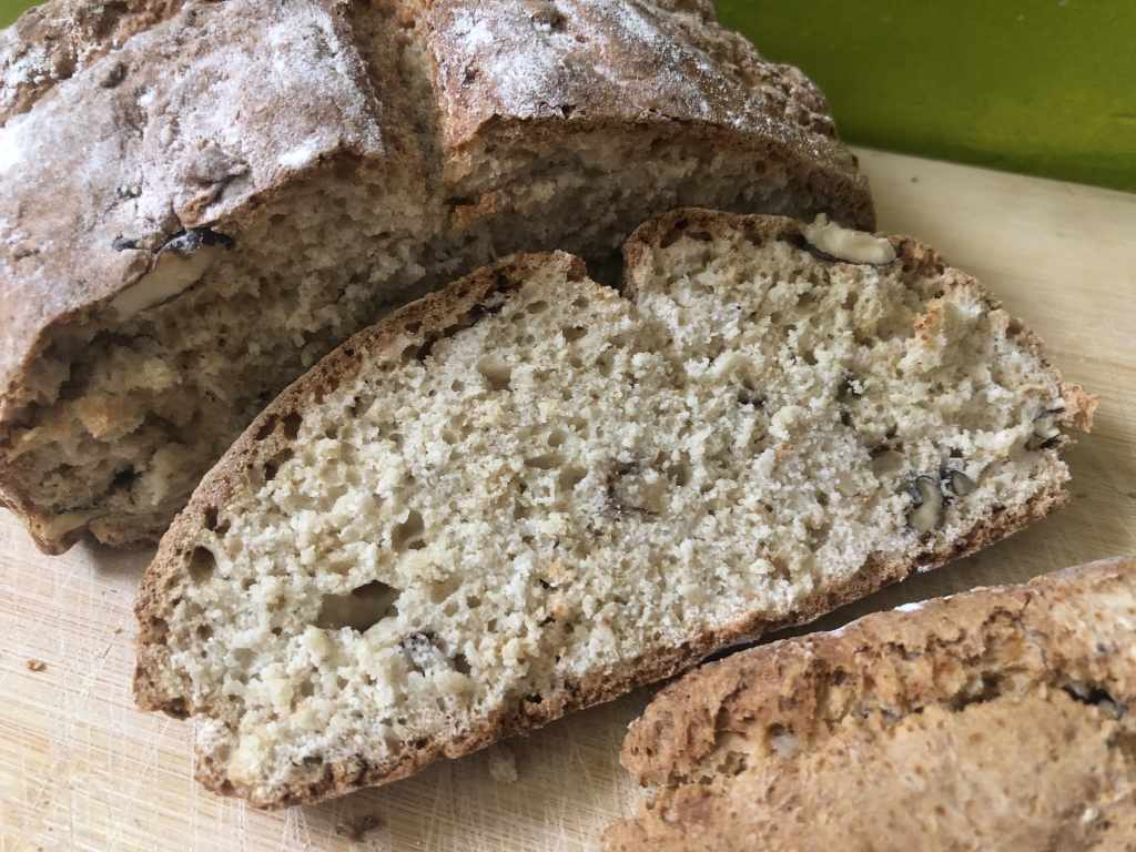 Añade las nueces picadas y la leche poco a poco. Mezcla con la mano como si fuera una batidora. Cuando notes que has integrado toda la harina, no sigas añadiendo leche. Espolvorea harina en la superficie de trabajo, vuelca la masa y no amases, sólo integra todos los ingredientes haciendo una bola. Coloca un poco de harina sobre la bandeja de horno o papel vegetal y encima la masa. Haz un par de cortes transversales en el centro, espolvorea un poco más de harina y hornea 30 minutos.