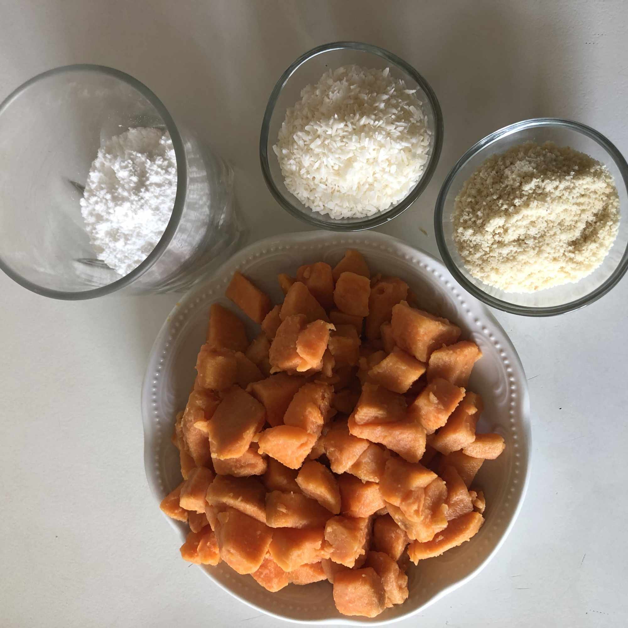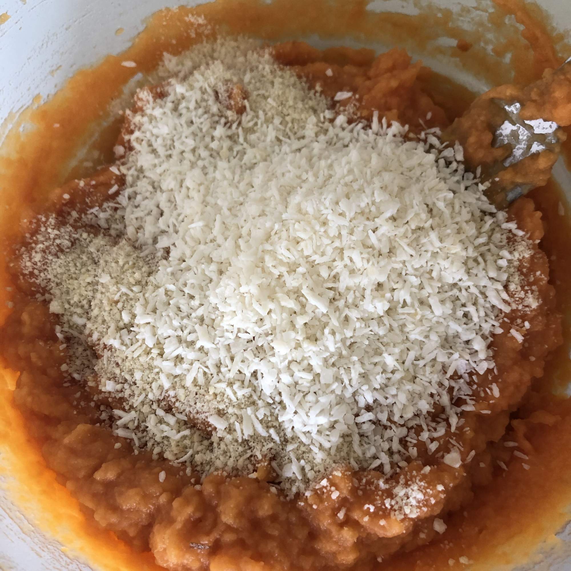 Retira las especias y tritura la batata con un tenedor hasta obtener un puré. Añade el azúcar, el coco y las almendras y mezcla todo bien. Cubre con papel film y lleva a la nevera durante 30 minutos para que coja consistencia.