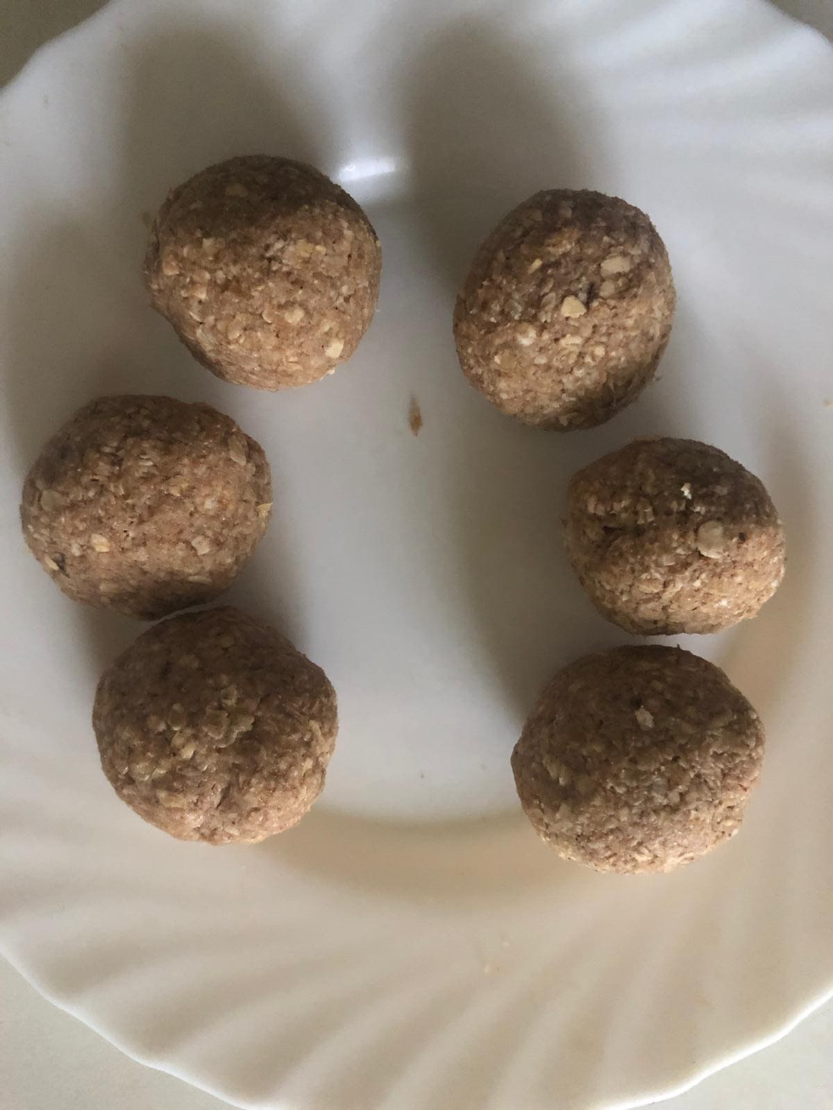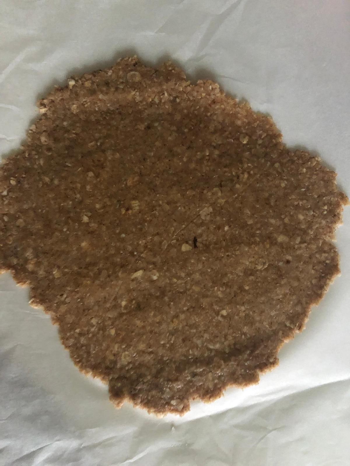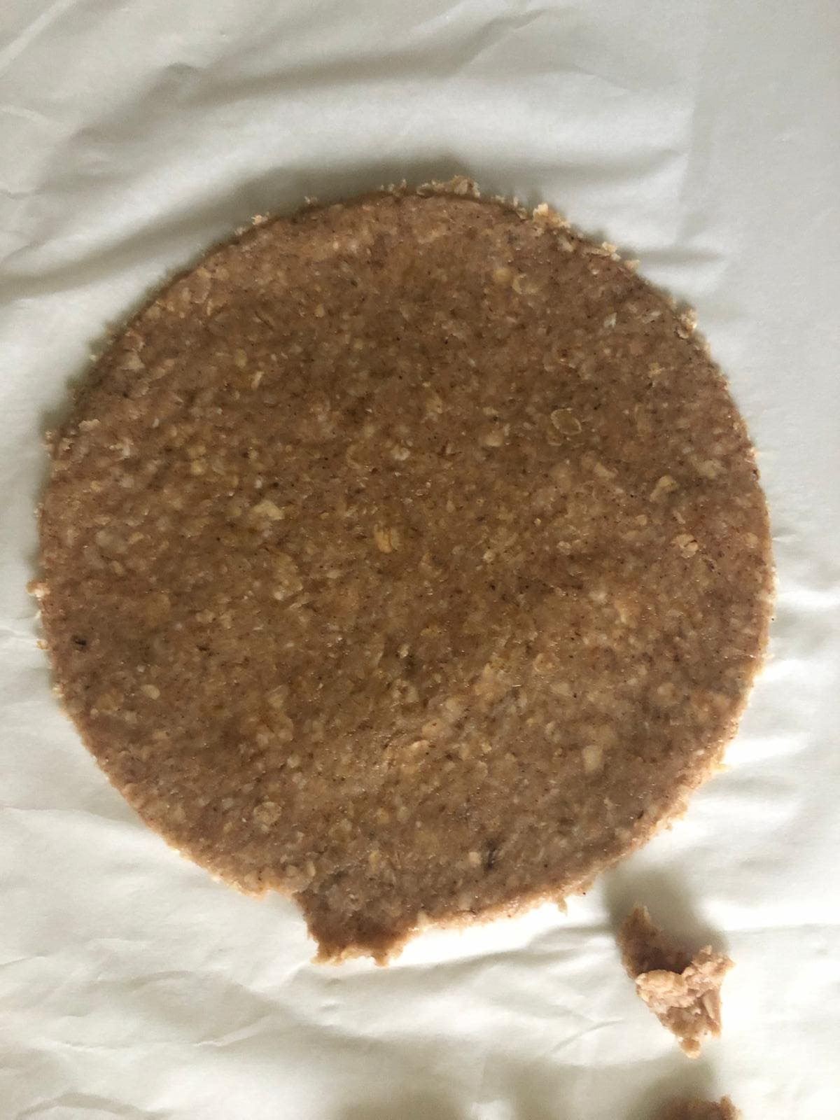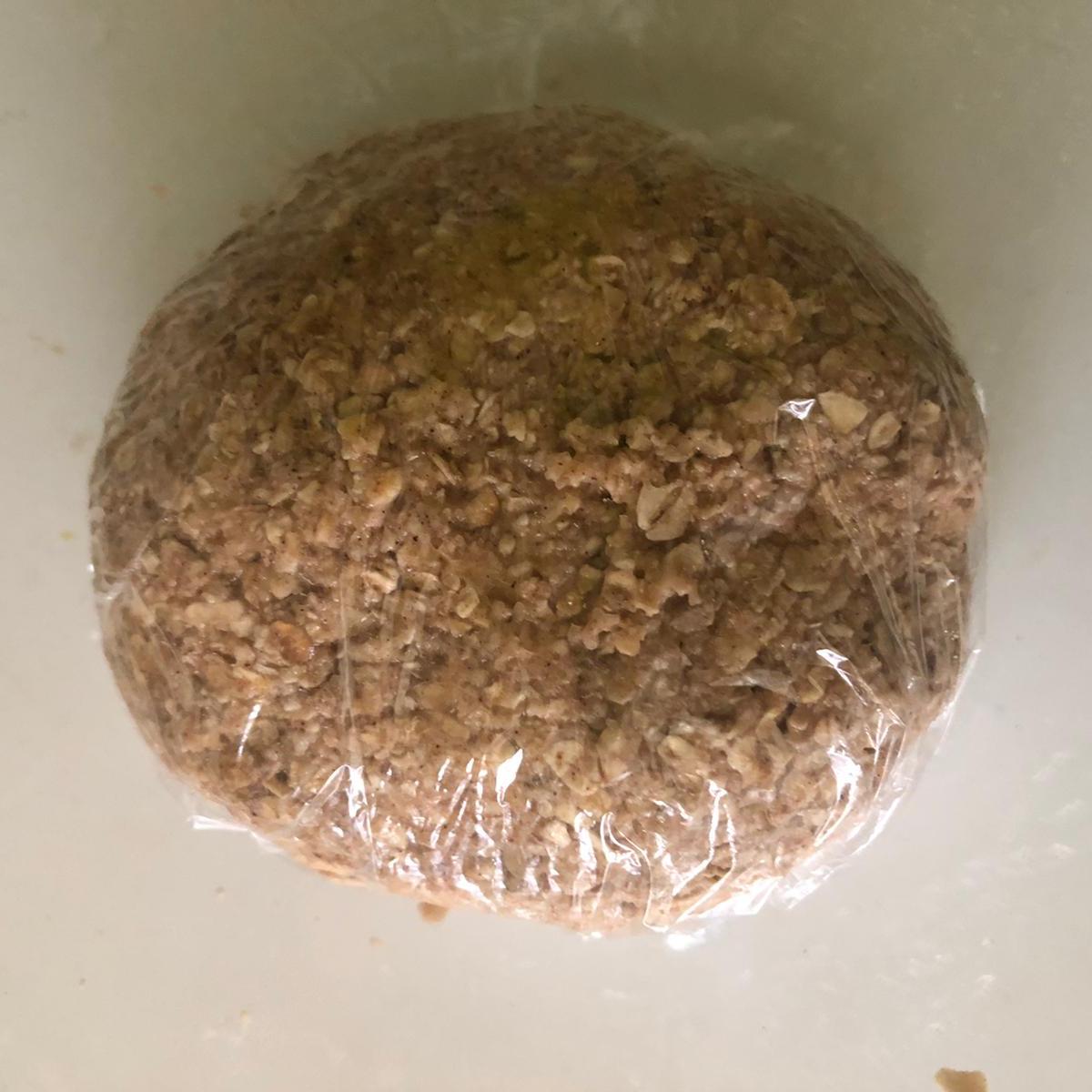 Tritura el plátano con un tenedor. En un bol, mezcla el plátano con el aceite. Añade esta mezcla a los ingredientes secos y haz una bola. Cúbrela con papel film y deja reposar en la nevera durante 10 minutos.