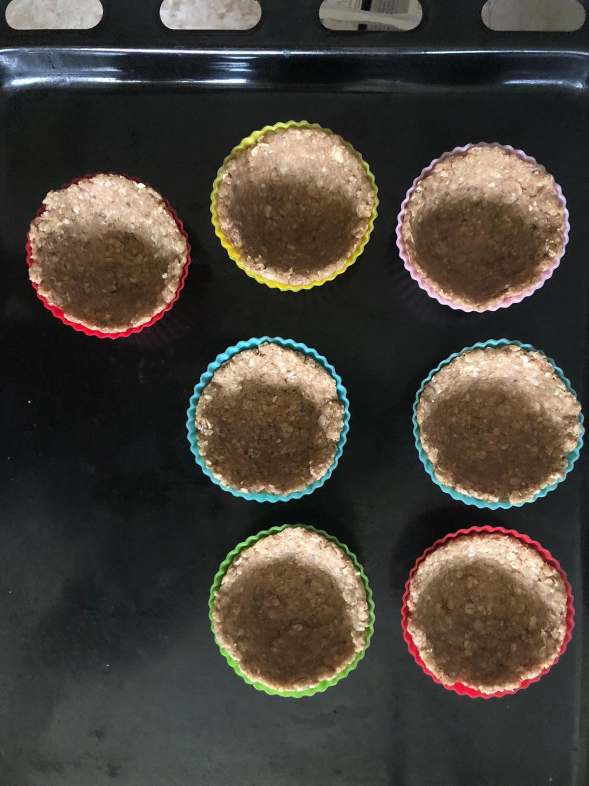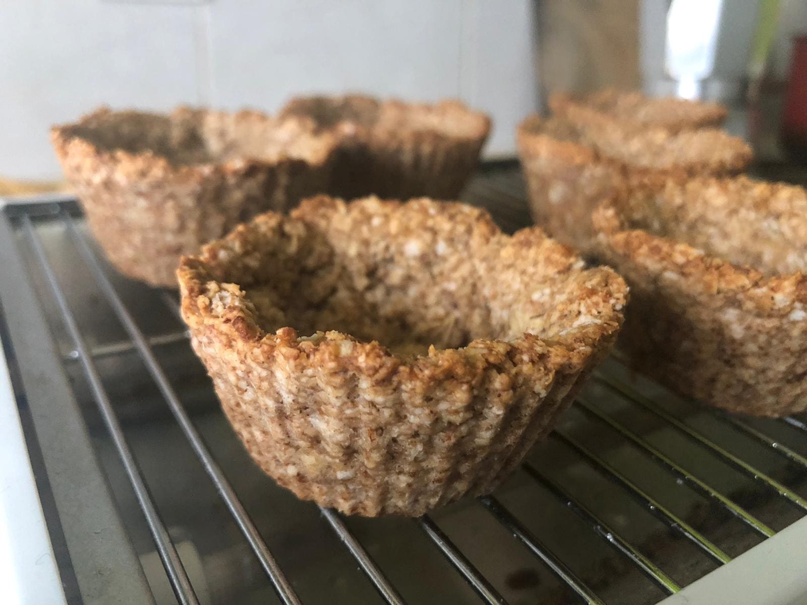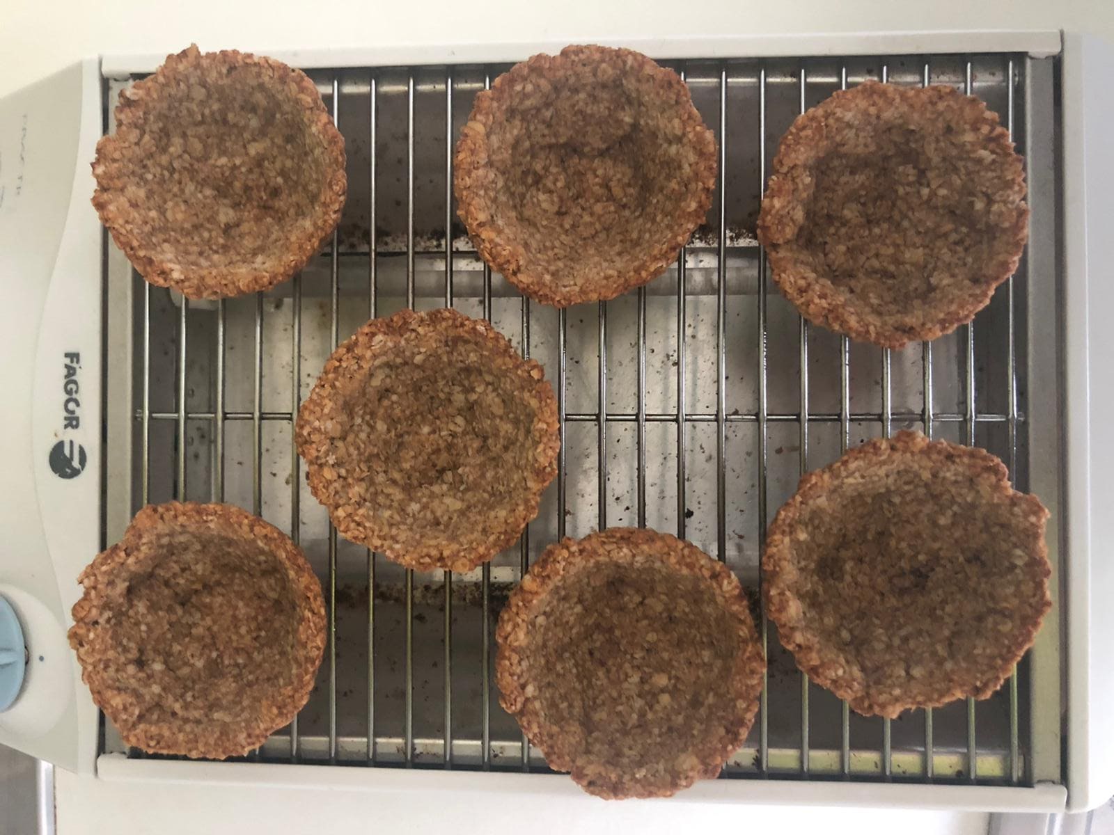 Unta los moldes que vayas a utilizar con un poco de aceite y coloca la masa dentro, presionando con los dedos. Hornea unos 25 minutos o hasta que empiece a dorarse por dentro. Deja enfriar sobre una rejilla. Por último, coloca la crema en una manga pastelera y rellena las bases de avena y plátano.