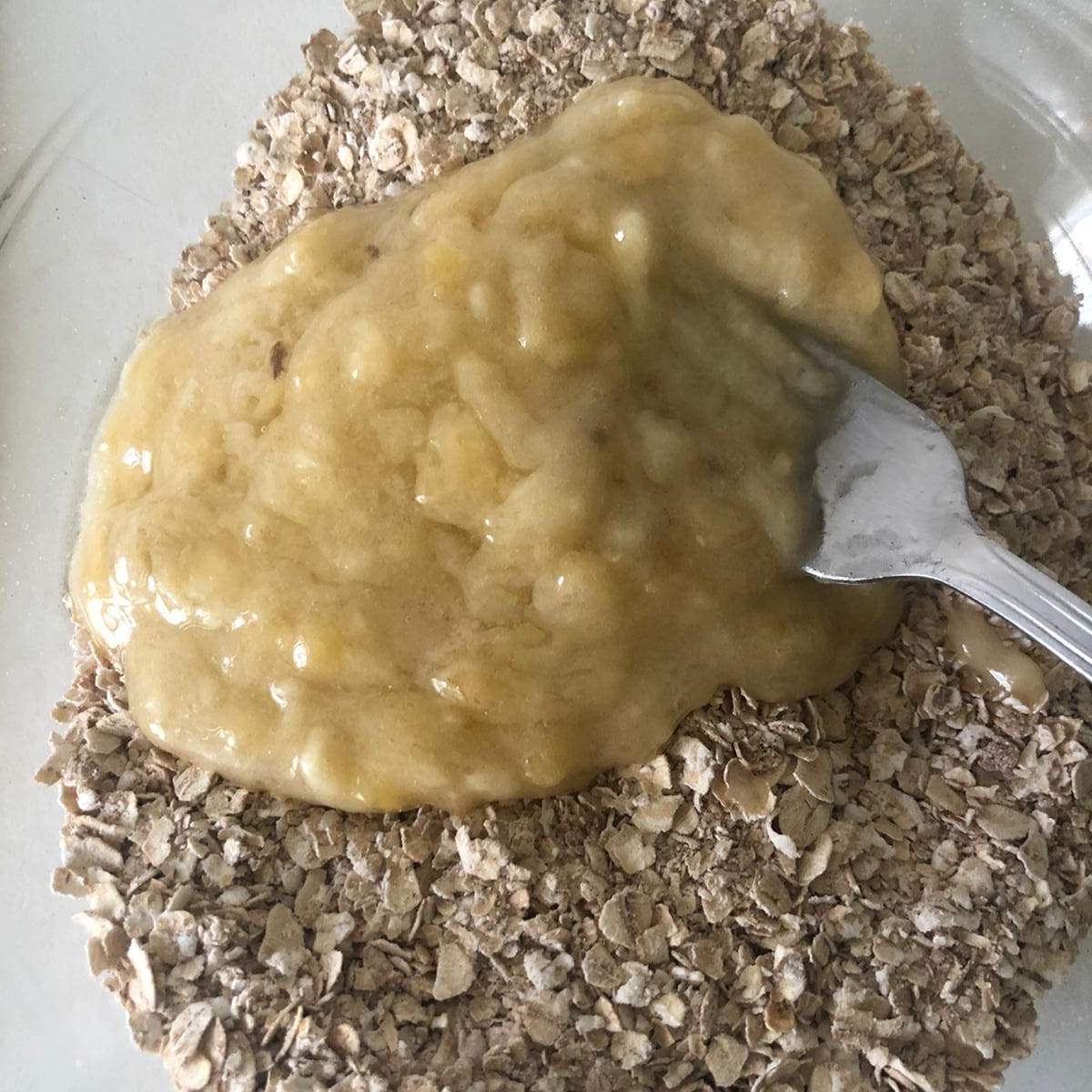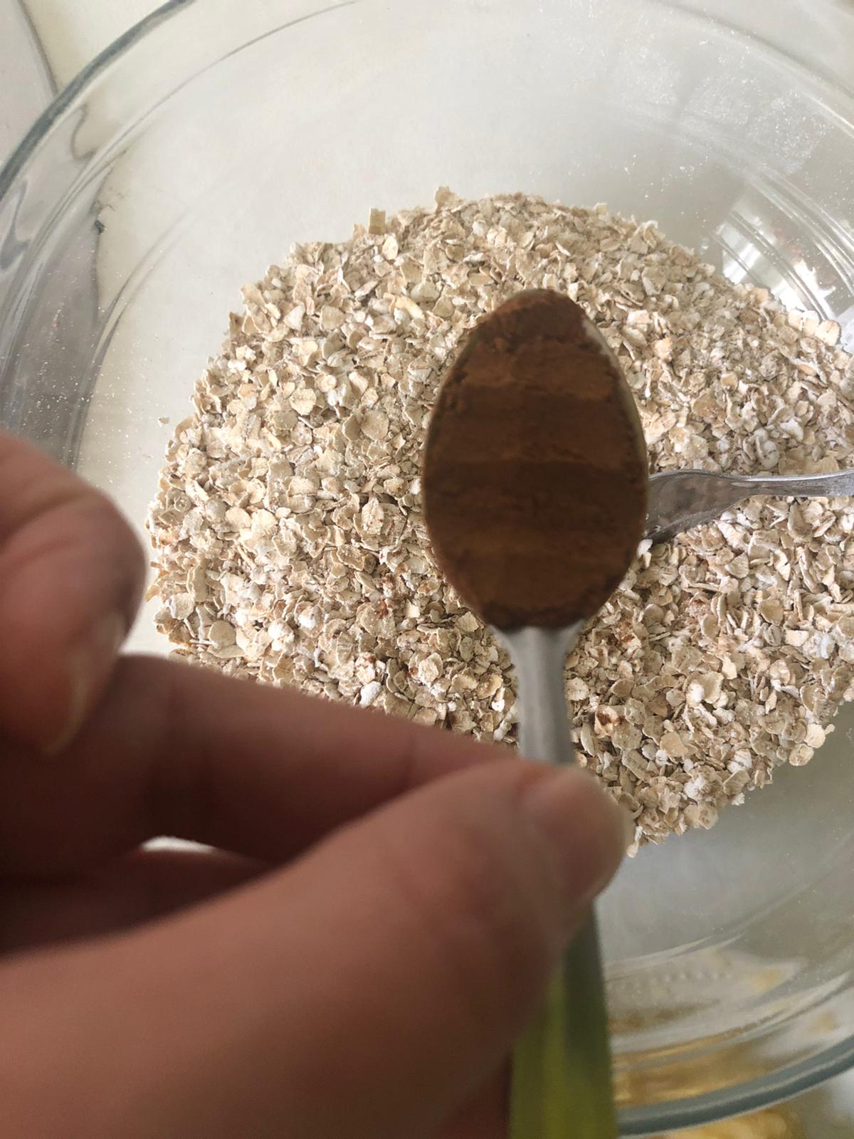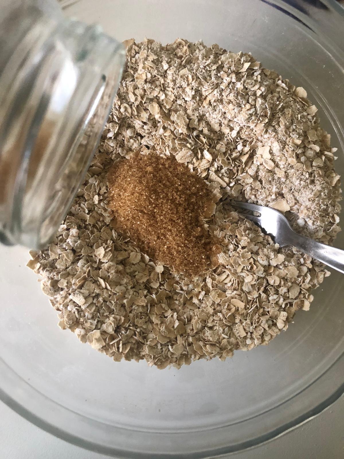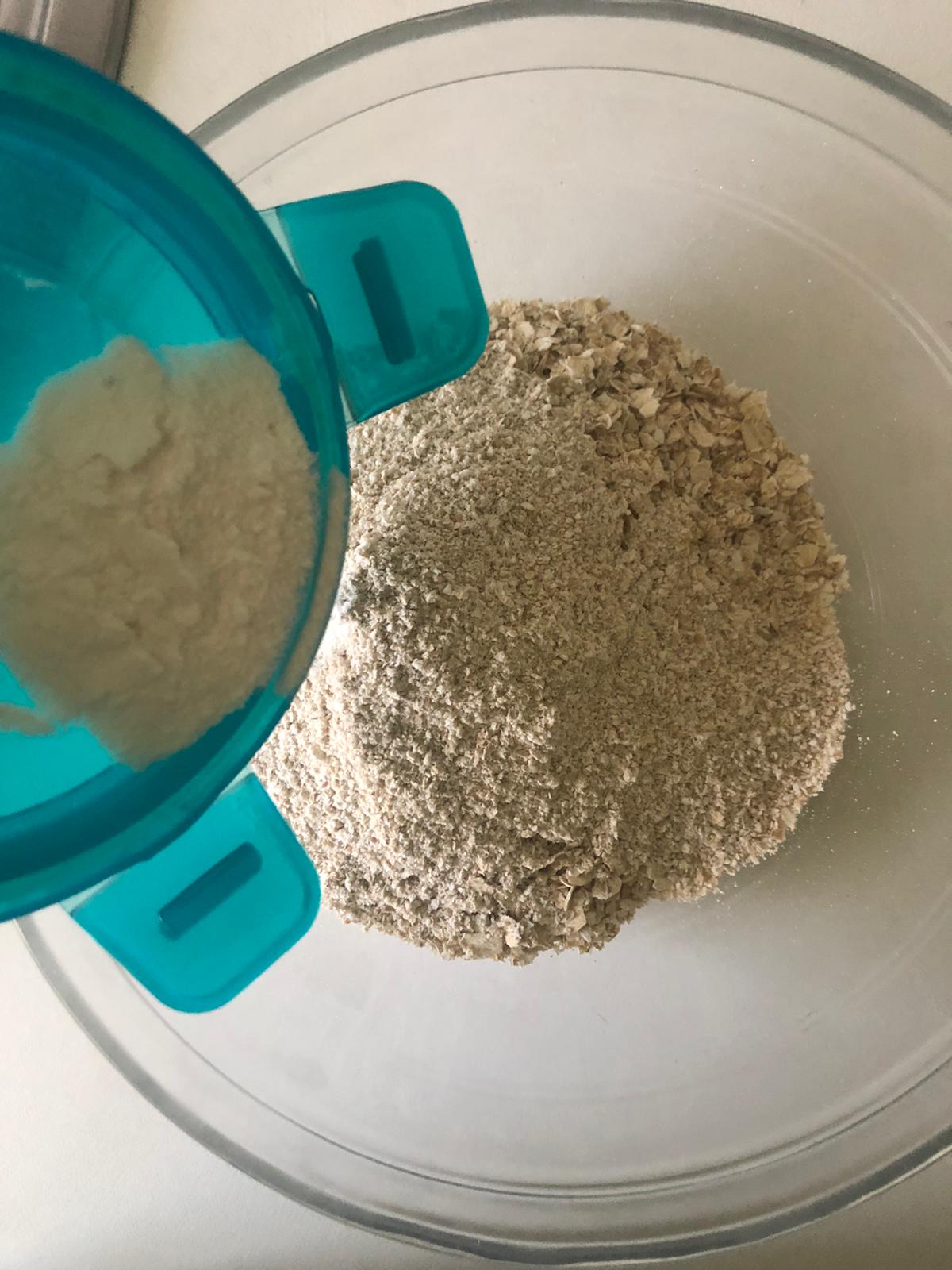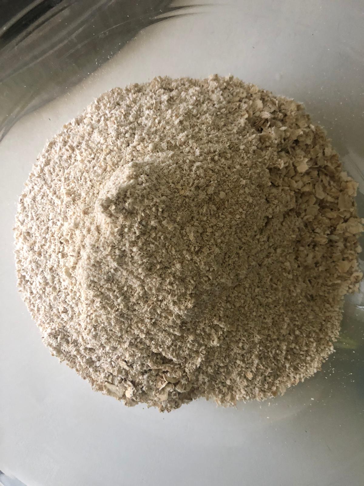 Precalienta el horno a 150ºC. En un recipiente, mezcla los copos de avena con la harina de avena.