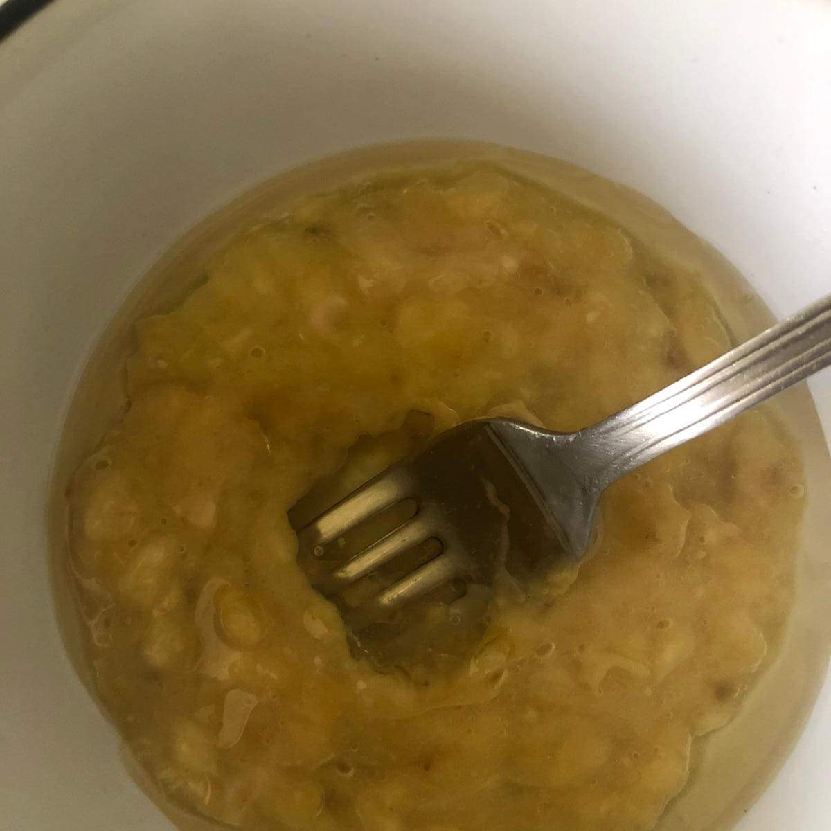 Añade el polvo de hornear y la sal (añade el azúcar también, aunque si el plátano está muy maduro no va a hacer falta) y la cucharadita de canela.