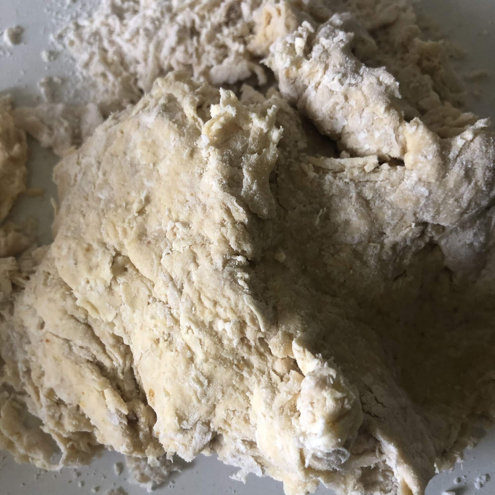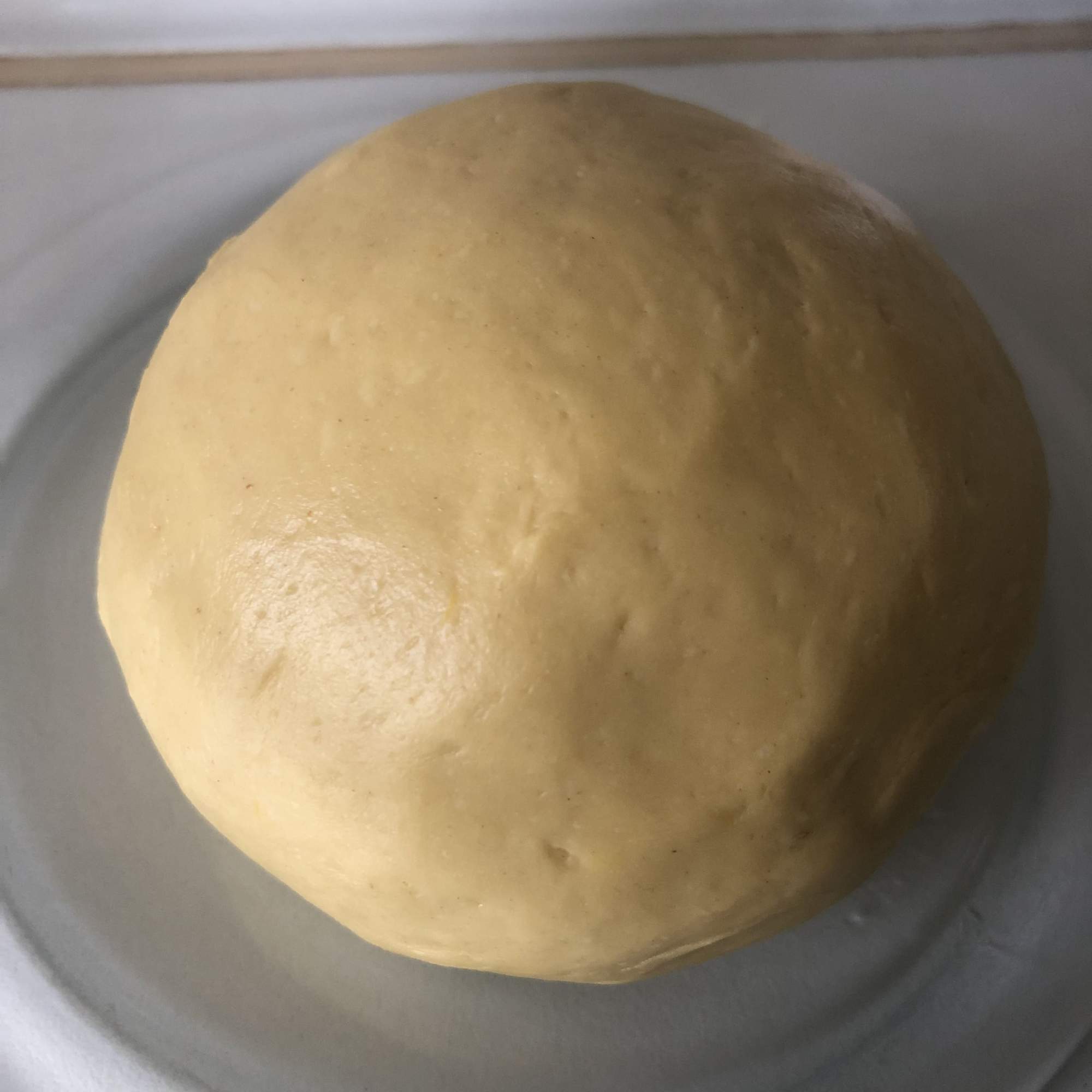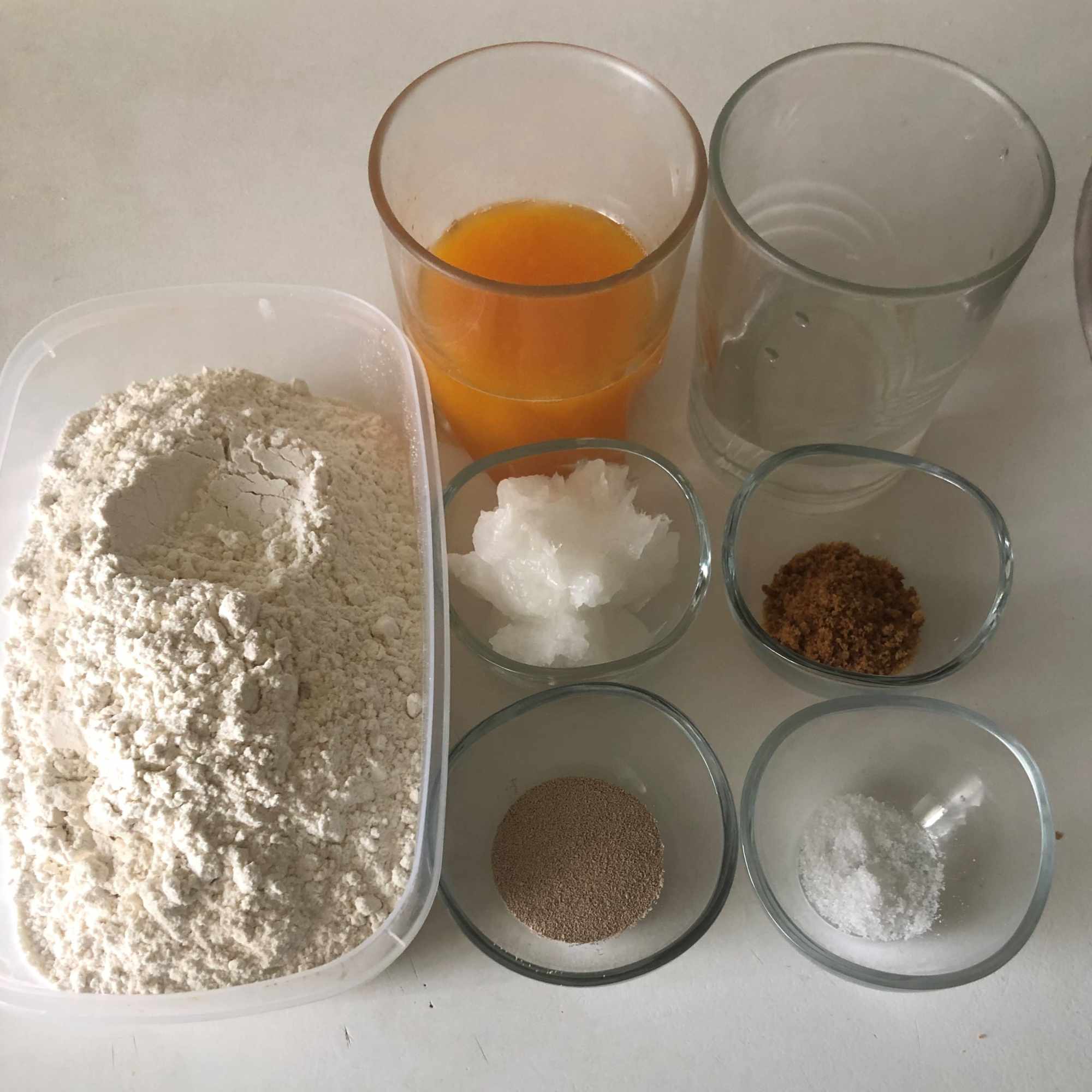 Disuelve la levadura en el agua tibia y reposa 10 minutos. Tamiza la harina y mezcla con la sal, el azúcar, el zumo de naranja y la levadura disuelta. Amasa 10 minutos y reposa otros 10.