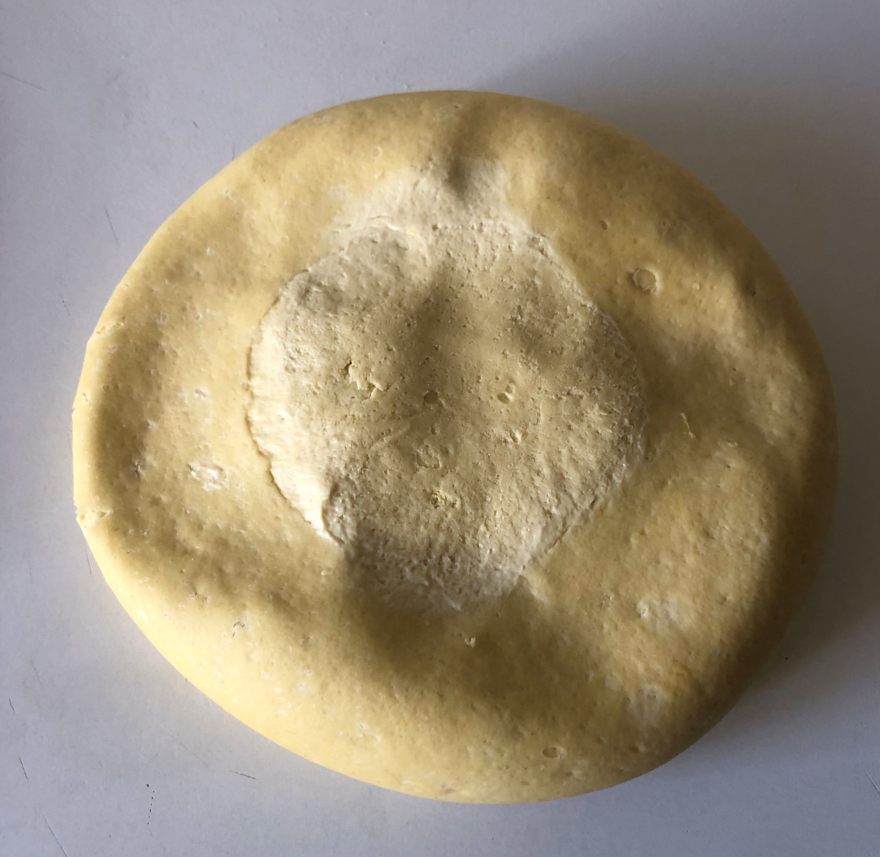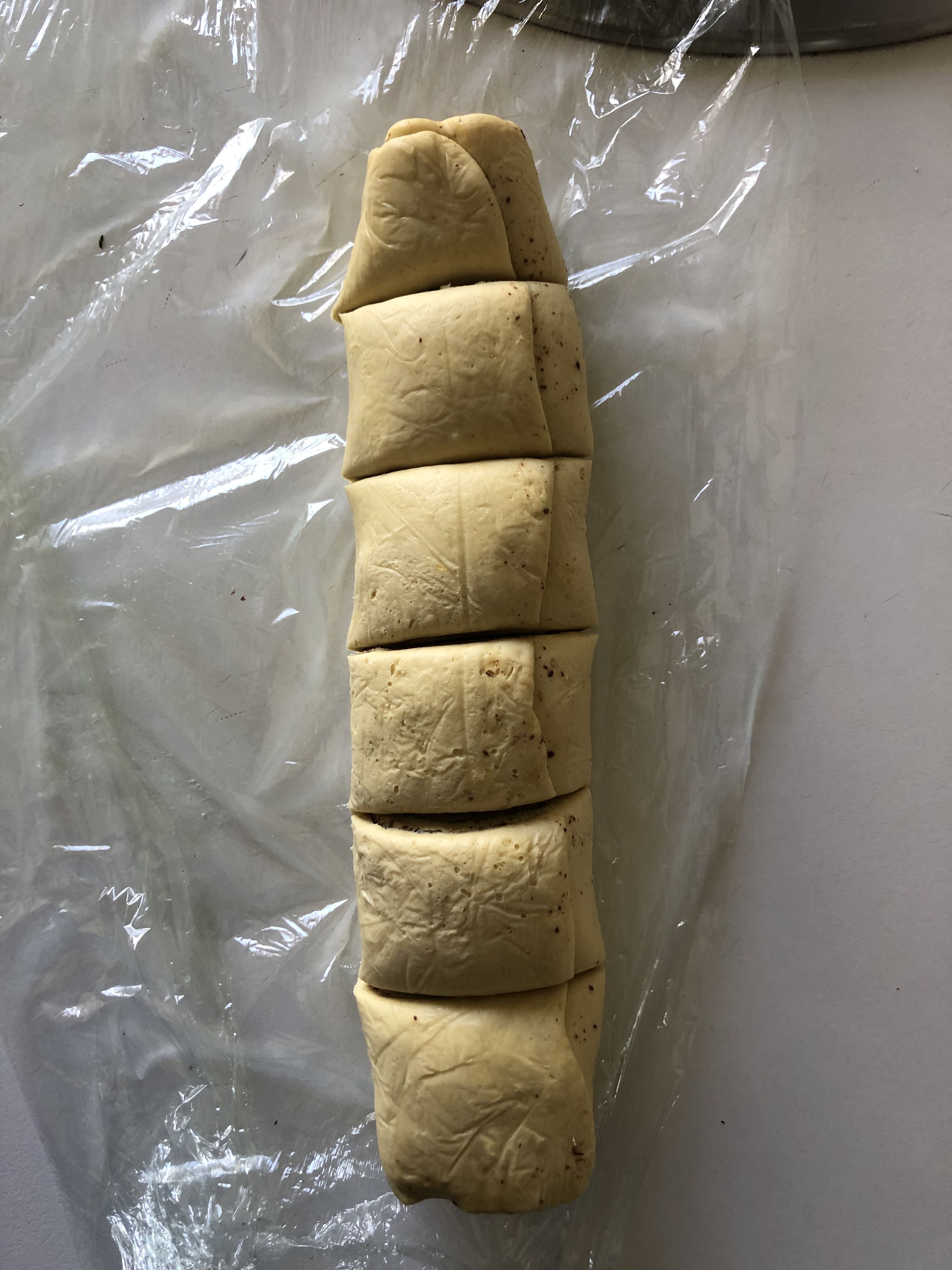 Corta en rodajas de unos 4cm y coloca sobre un molde previamente engrasado con un poco de aceite. Deja un poco de distancia entre ellos y reposa 2 horas en lugar cálido.