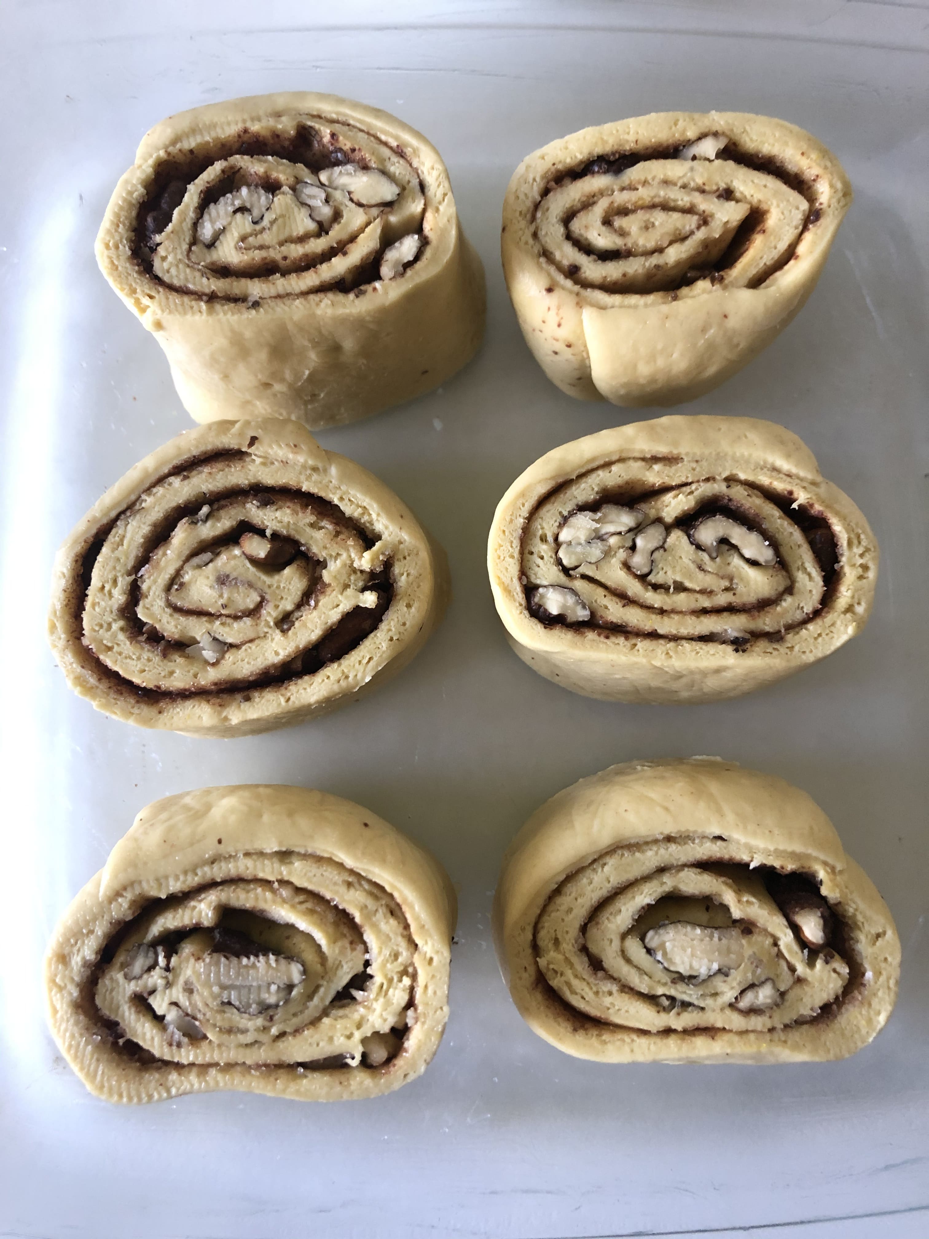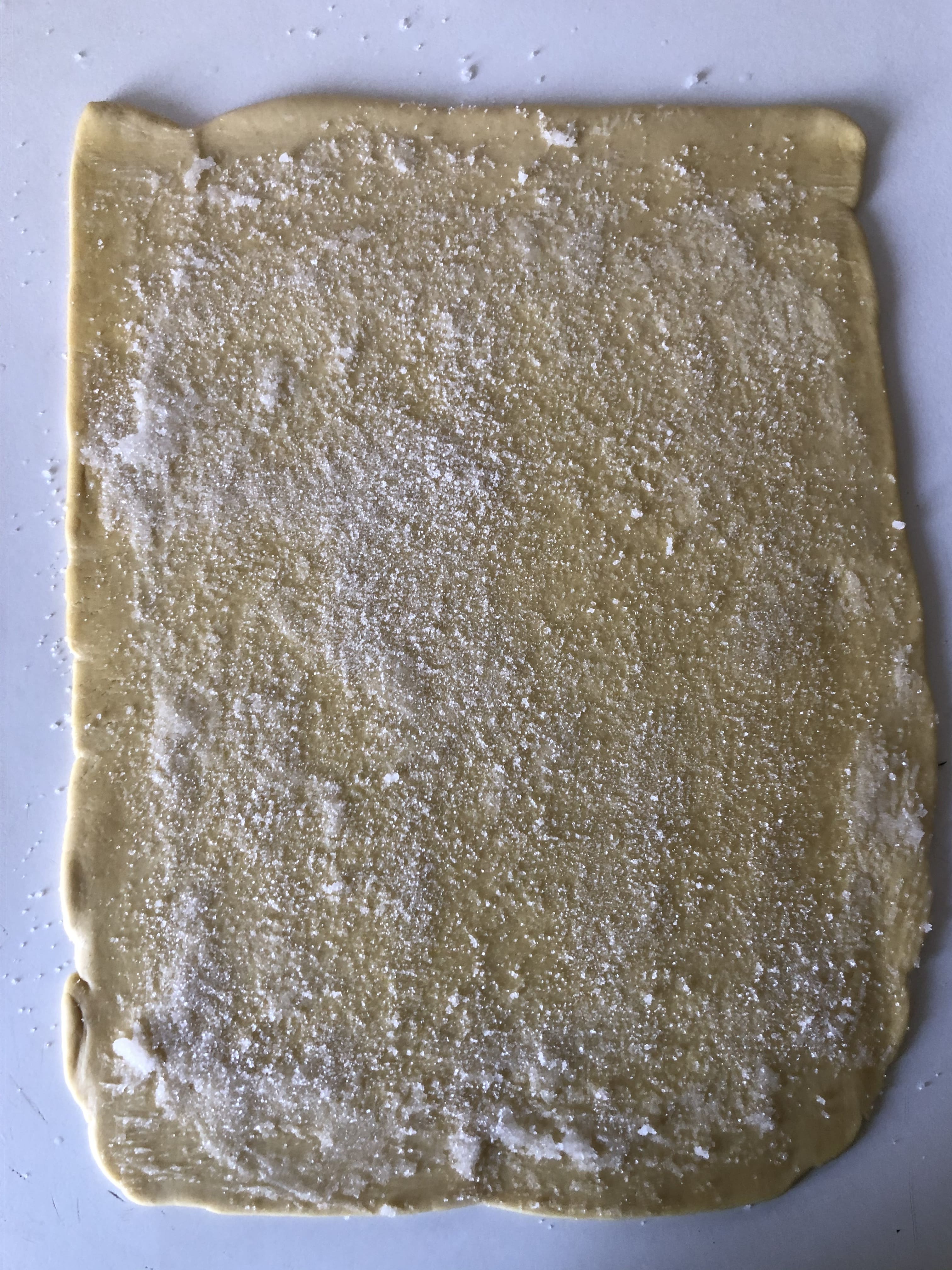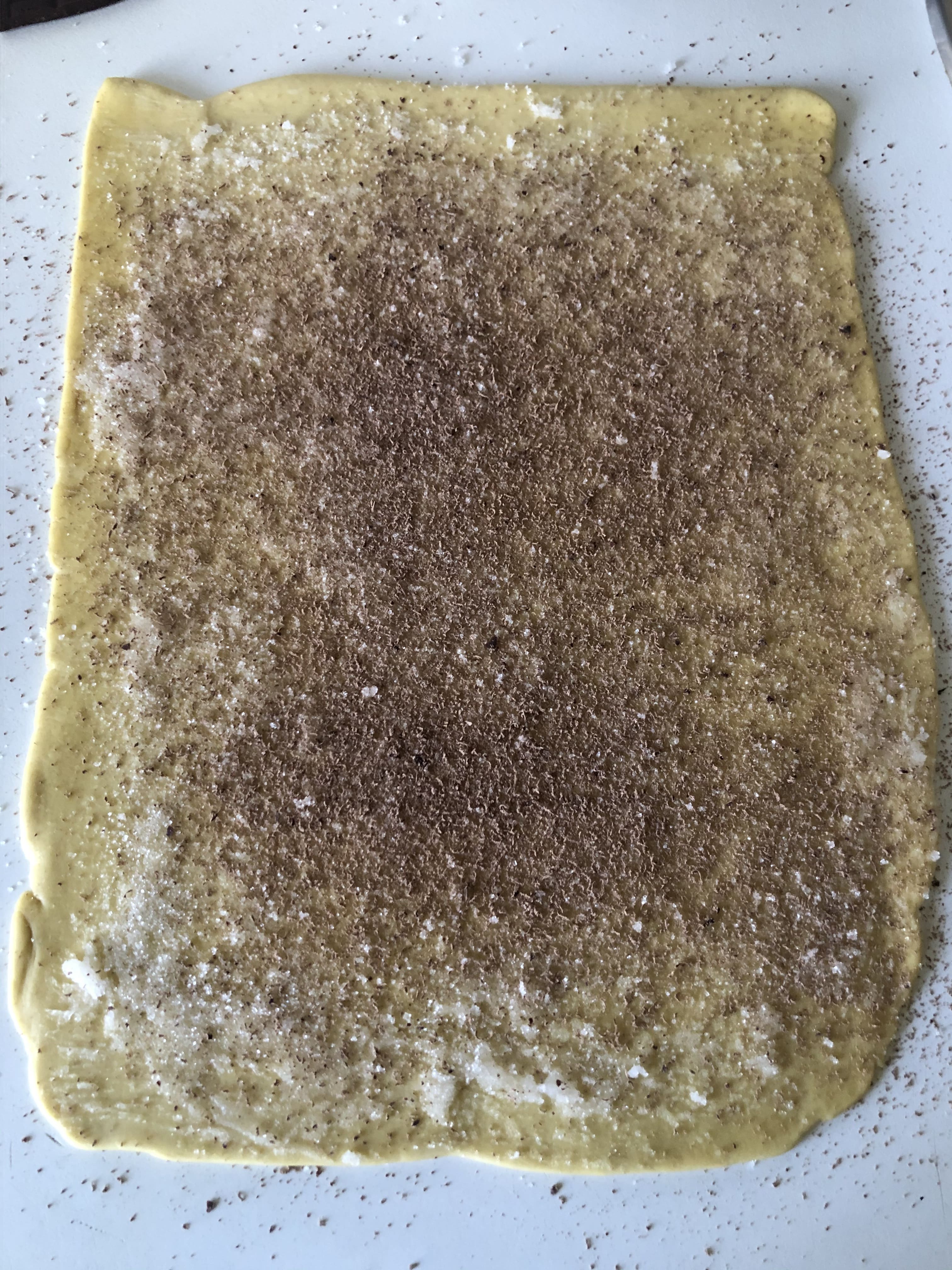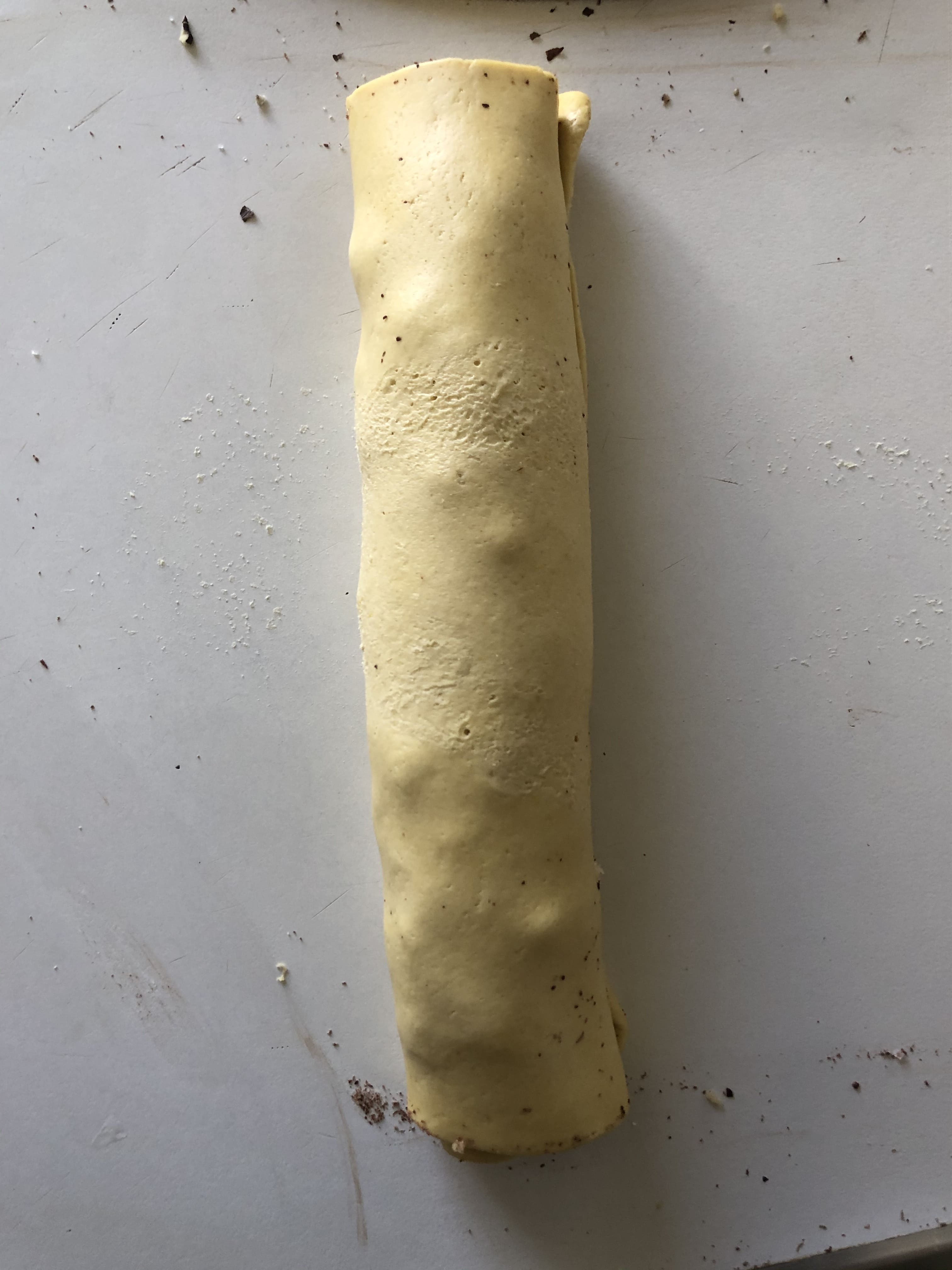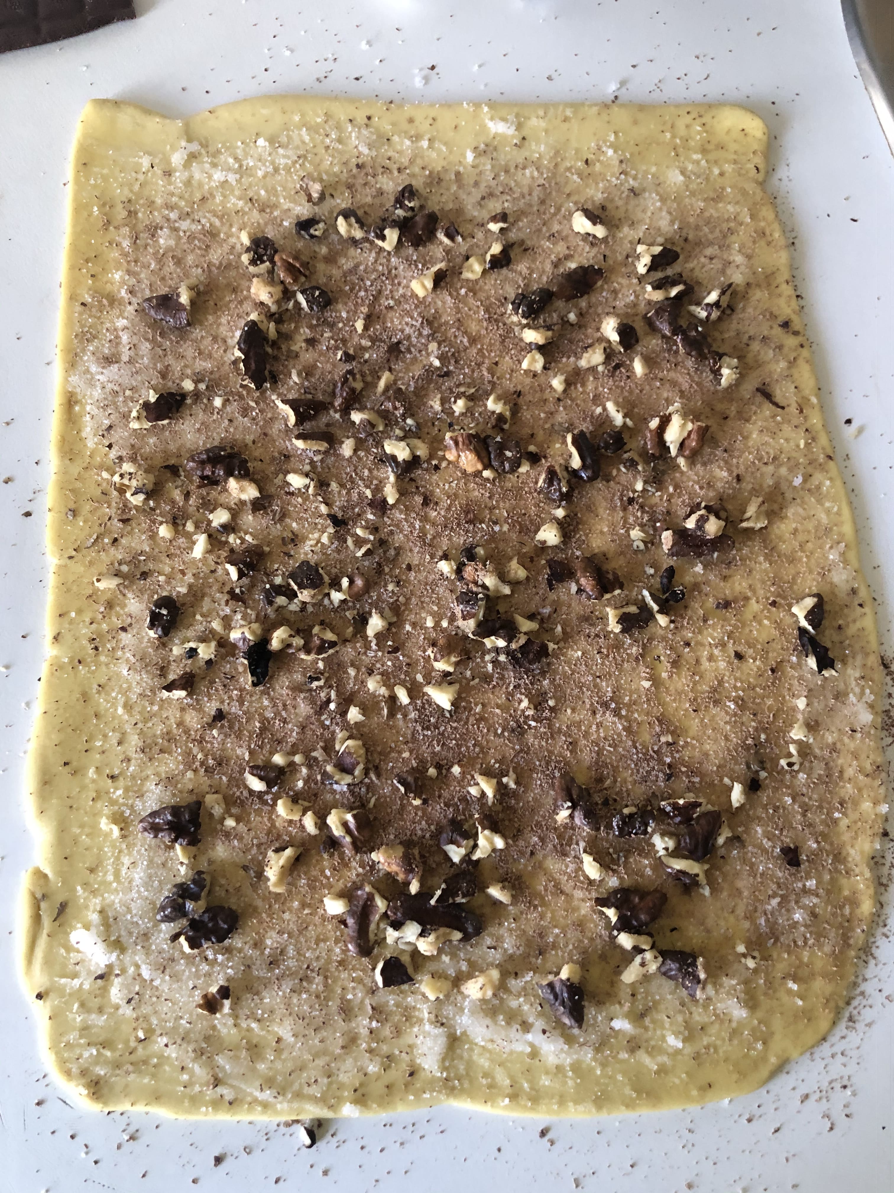 Estira con el rodillo, haciendo un rectángulo de 30×24 (no te olvides de poner un papel film o vegetal debajo). Espolvorea el azúcar, el chocolate rallado y unas nueces picadas por toda la superficie. Enrolla con cuidado, envuelve en film y reposa 30 minutos en la nevera.