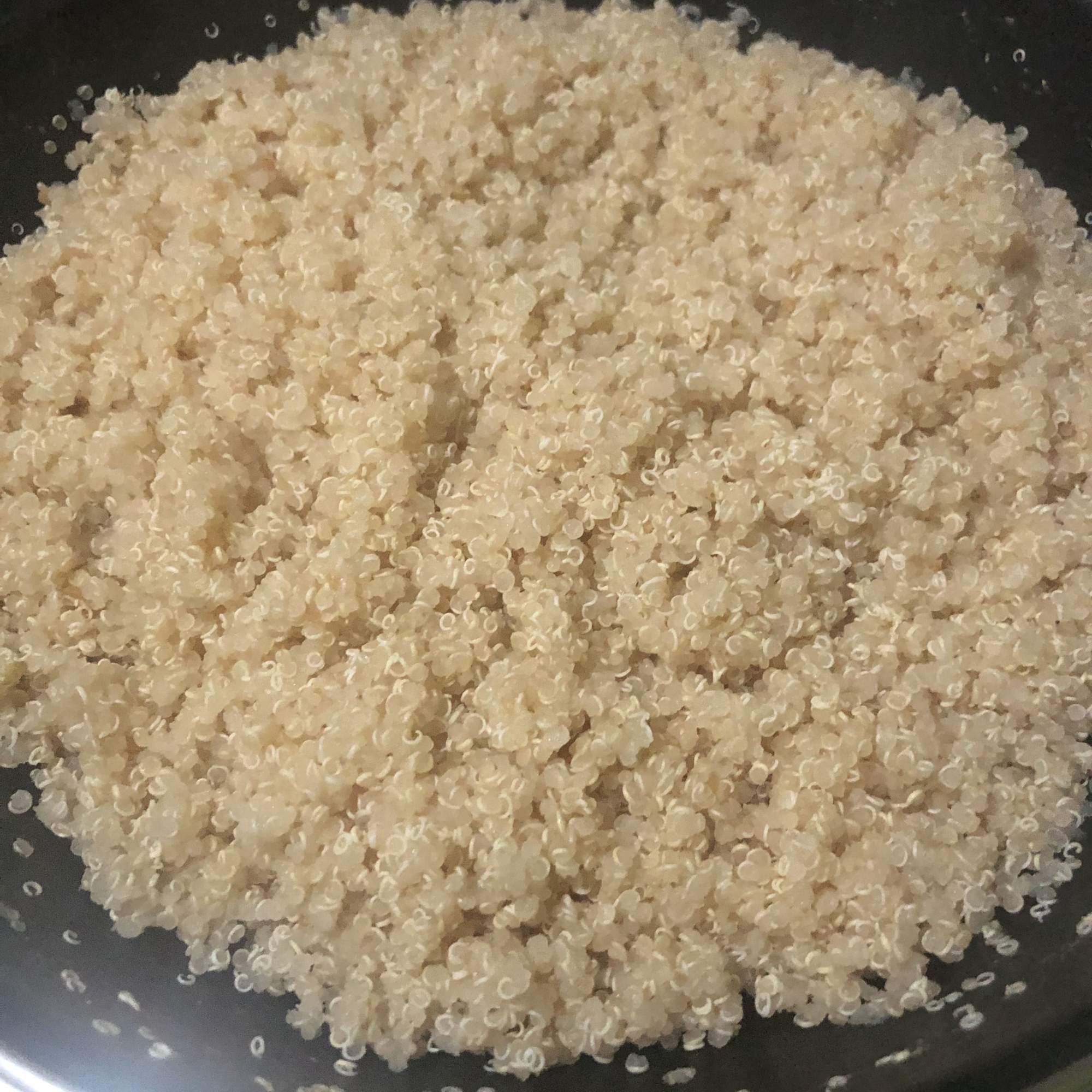 Lava muy bien la quinoa con un colador de malla fina, hasta que deje de salir espuma. Vierte la quinoa en una sartén grande sin aceite y seca a fuego lento, removiendo para que evapore el agua. Una vez lista, añade agua y lleva a ebullición. Cuando empiece a hervir baja el fuego al mínimo, cubre con tapadera y cocina unos 15 minutos o hasta que absorba toda el agua. Destapa, deja enfriar y separa los granos con un tenedor.