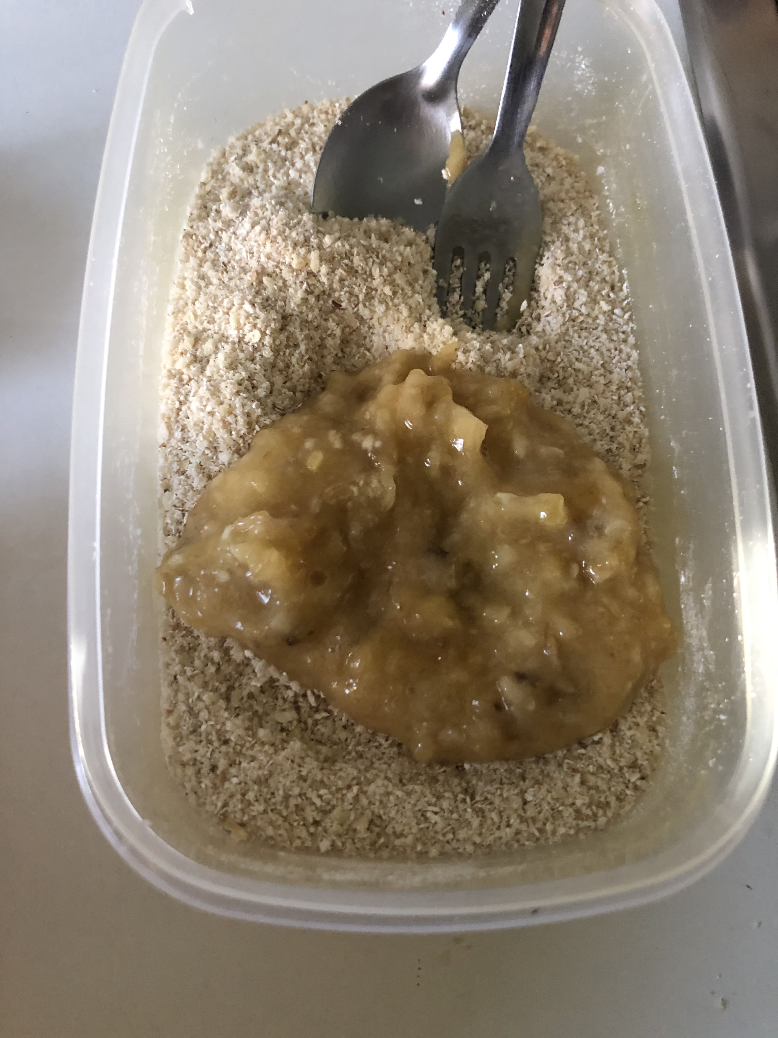 Precalienta el horno a 170ºC. Tritura la avena para hacerla harina y el plátano con un tenedor. Mezcla todos los ingredientes salvo el coco rallado y el cacao. Haz una masa homogénea y divide en dos partes. Añade el coco a una de ellas y el cacao a la otra e integra.