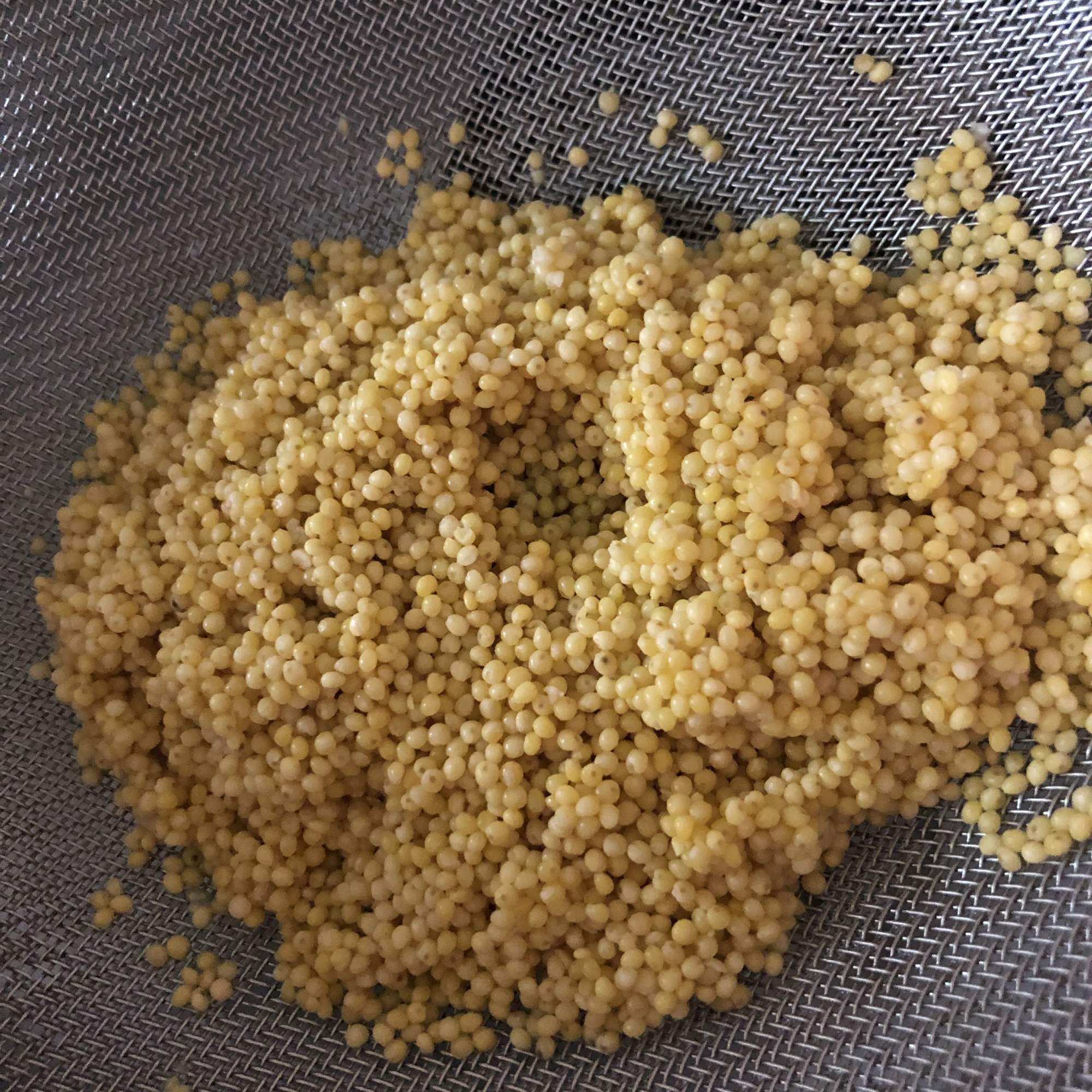 Lava el mijo en un colador de malla fina hasta que el agua salga clara. Aclara y tuesta en una sartén a fuego bajo. Cuando los granos estén secos añade el agua (proporción 3:1). Sube el fuego y cuando empiece a hervir, baja de nuevo, cubre con una tapadera y cocina 20 minutos o hasta que haya absorbido toda el agua. Retira del fuego y deja enfriar.