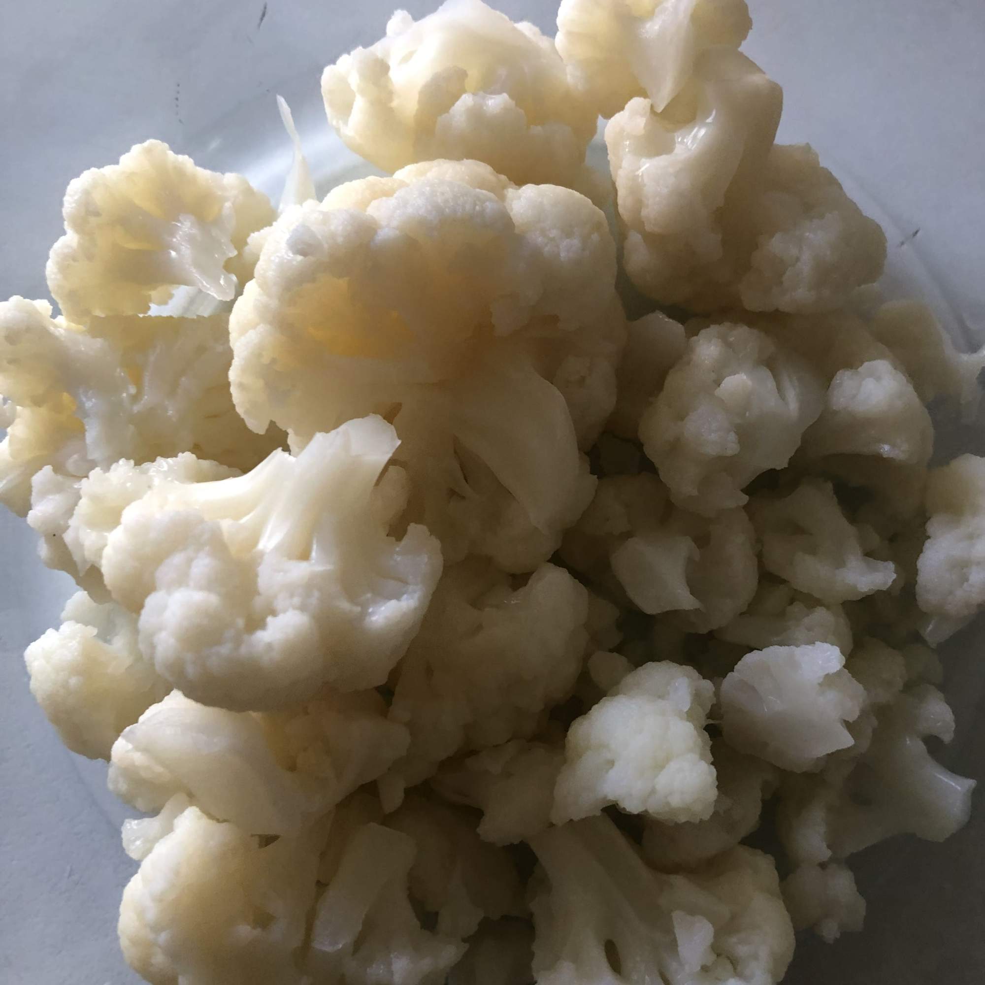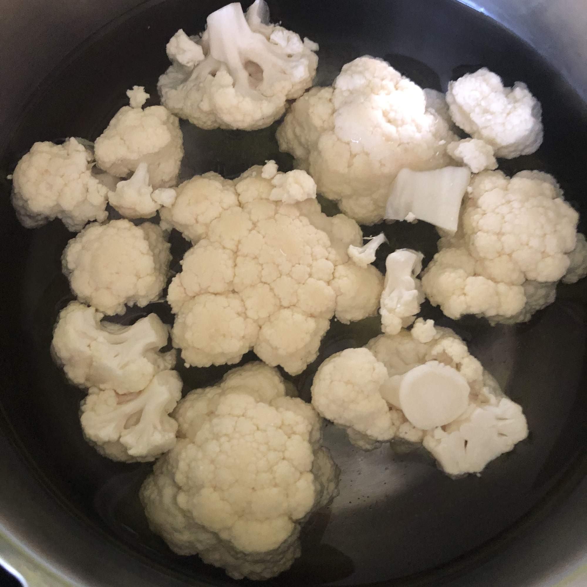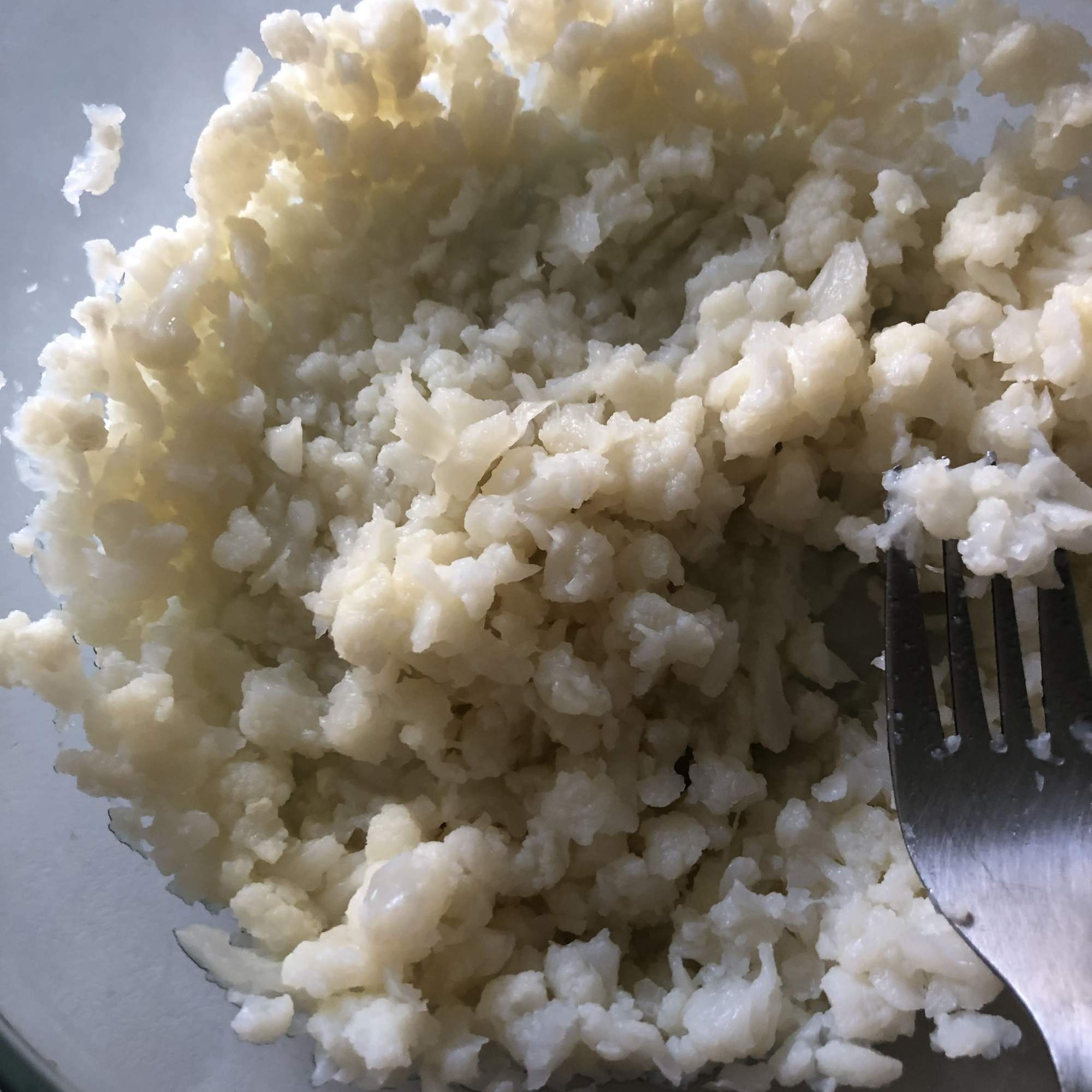 Lava la coliflor, elimina el tallo y cuece las flores en agua abundante con sal hasta que esté tierna (que no se deshaga). Tritura con un tenedor.