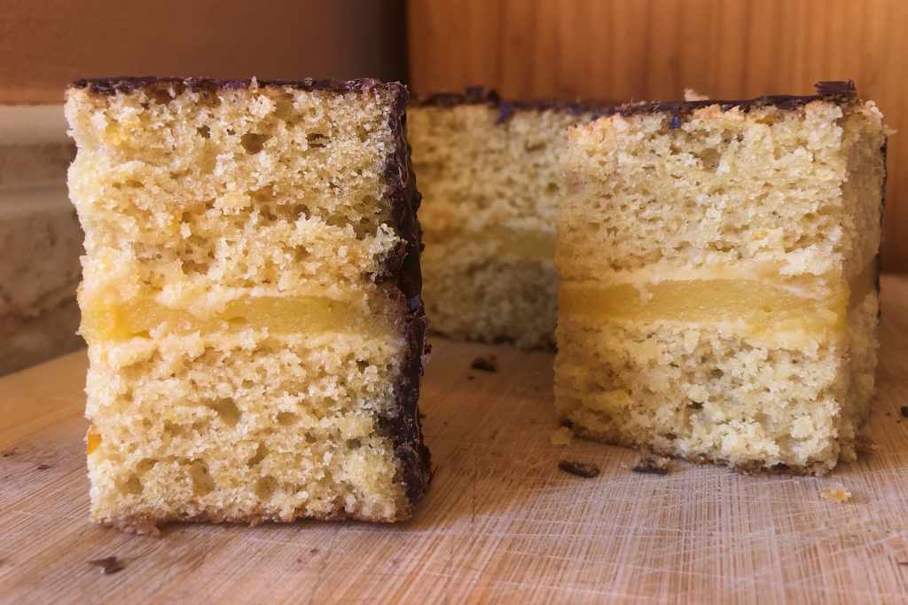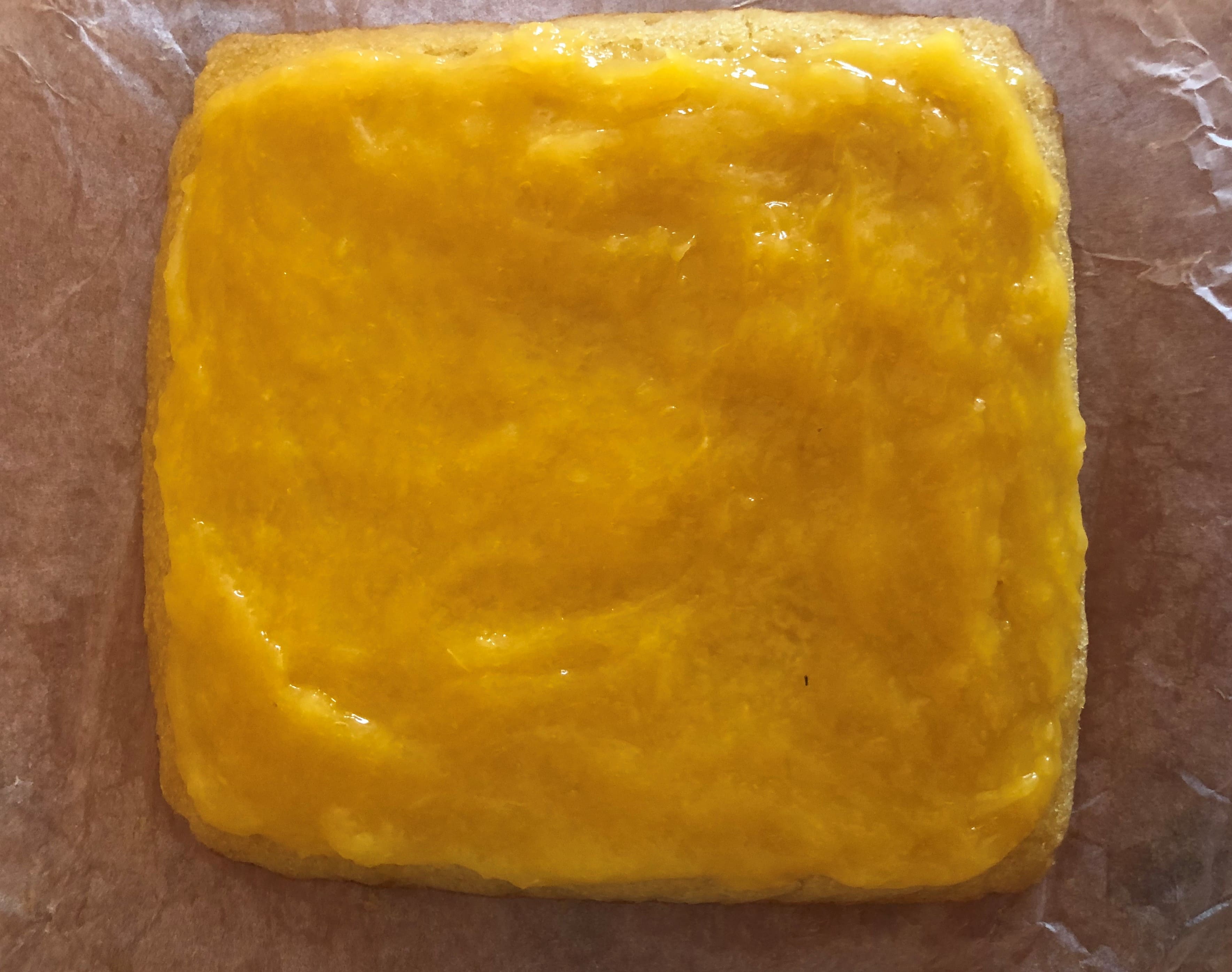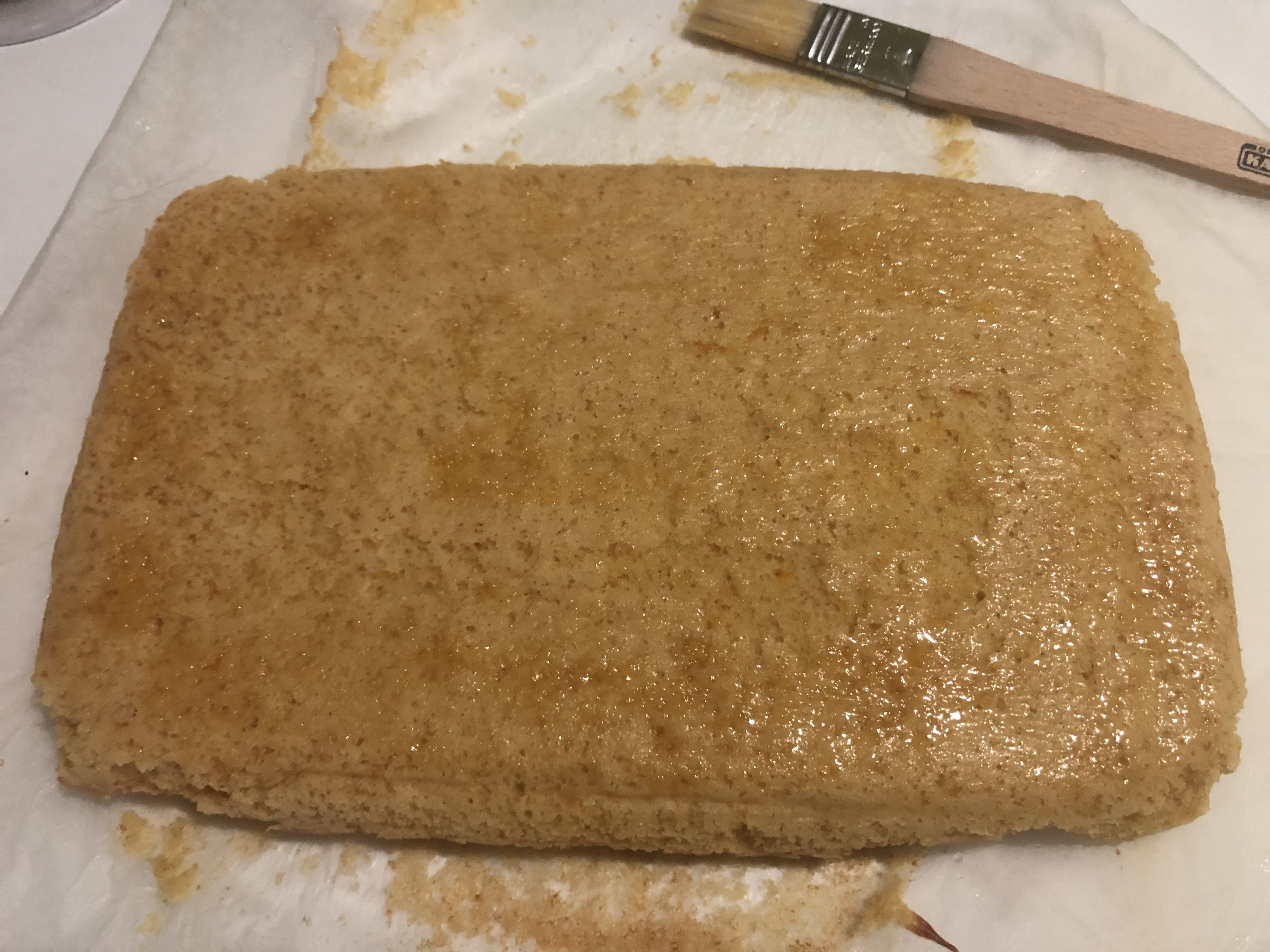 Una vez fría la crema, dale un golpe de batidora para mejorar la textura y vierte sobre un bizcocho. Cubre con el otro (en este caso he cortado el bizcocho grande a la mitad). Barniza con una capa de mermelada de naranja…