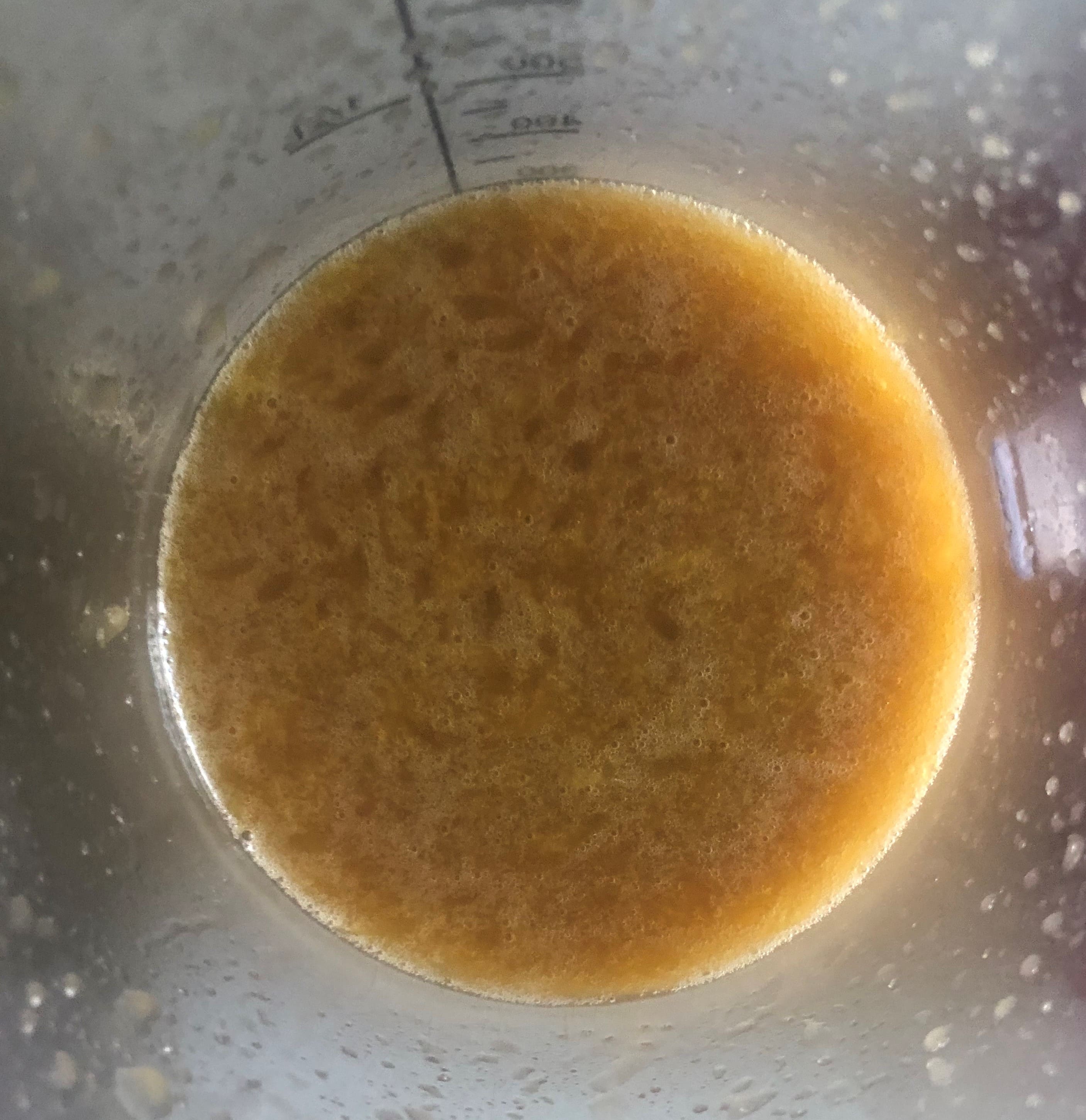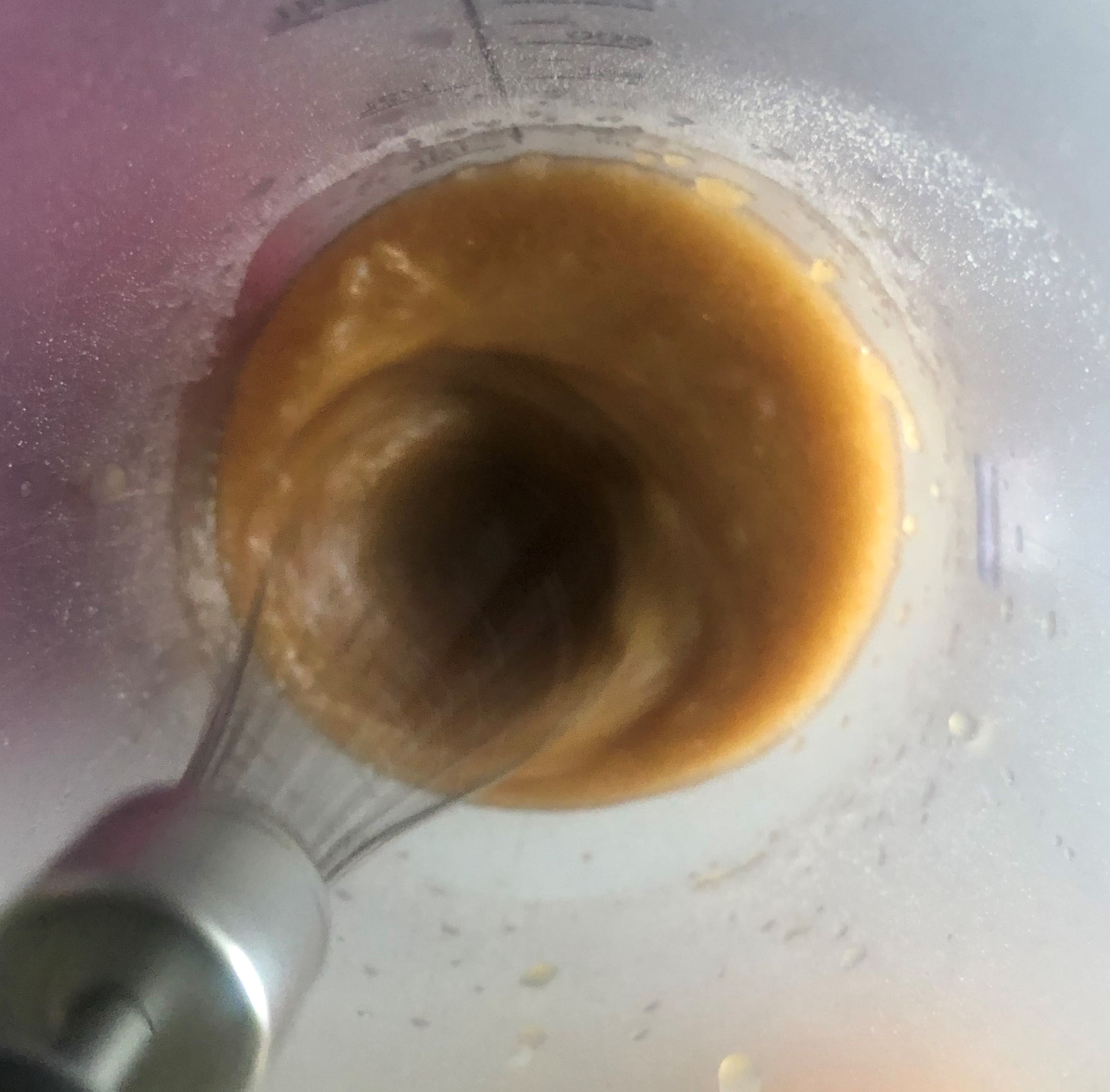 En el vaso de la batidora, vierte el azúcar y el aceite y bate con varillas (con la batidora). Añade el zumo de naranja y el agua y sigue batiendo hasta que haga espuma. Agrega a los ingredientes secos e integra con las varillas.