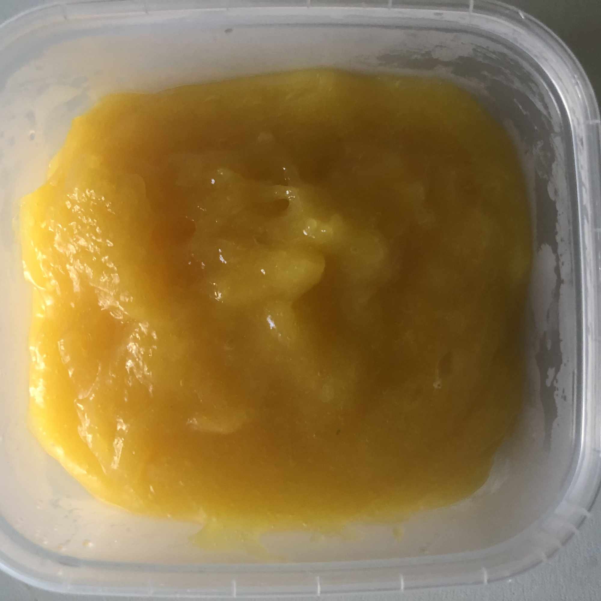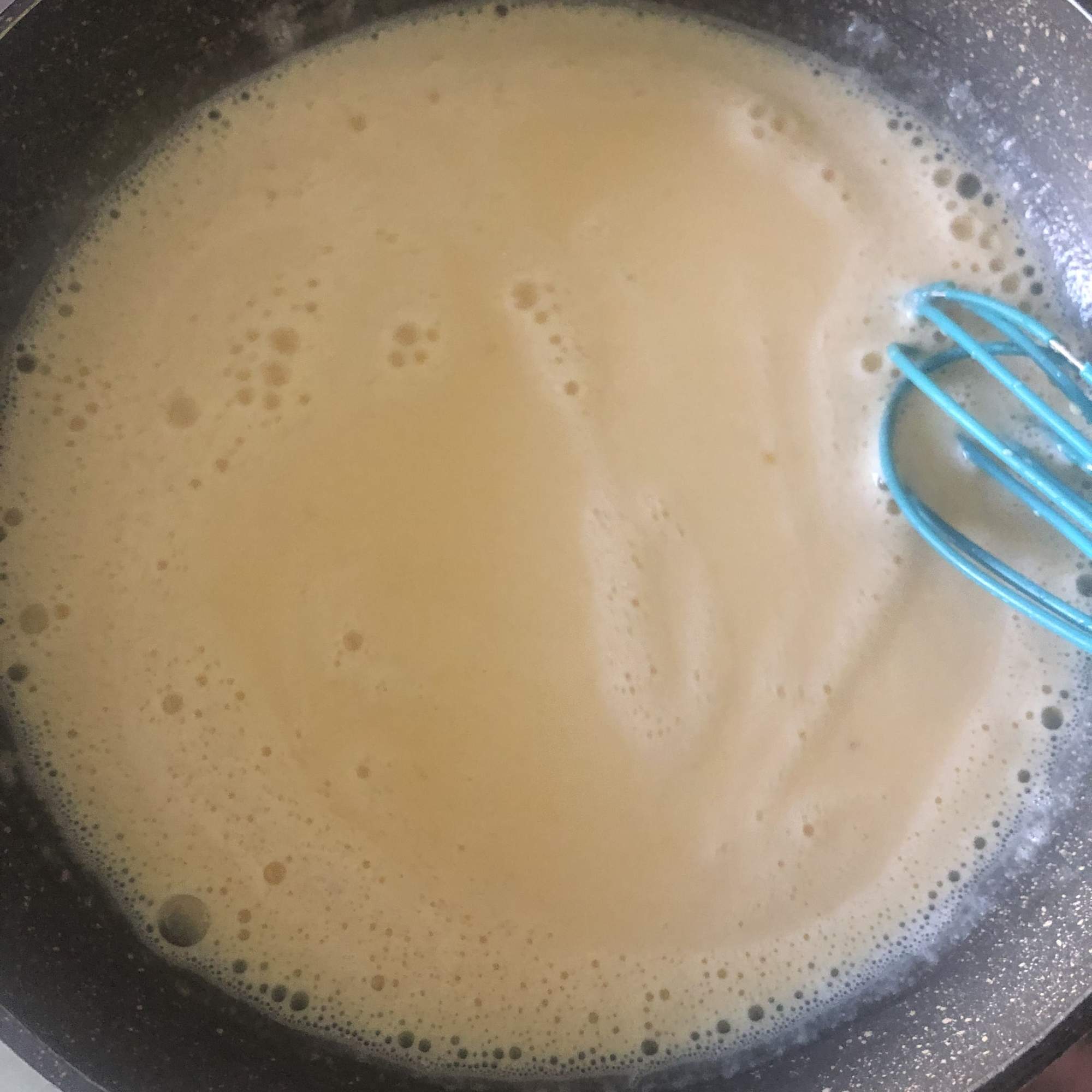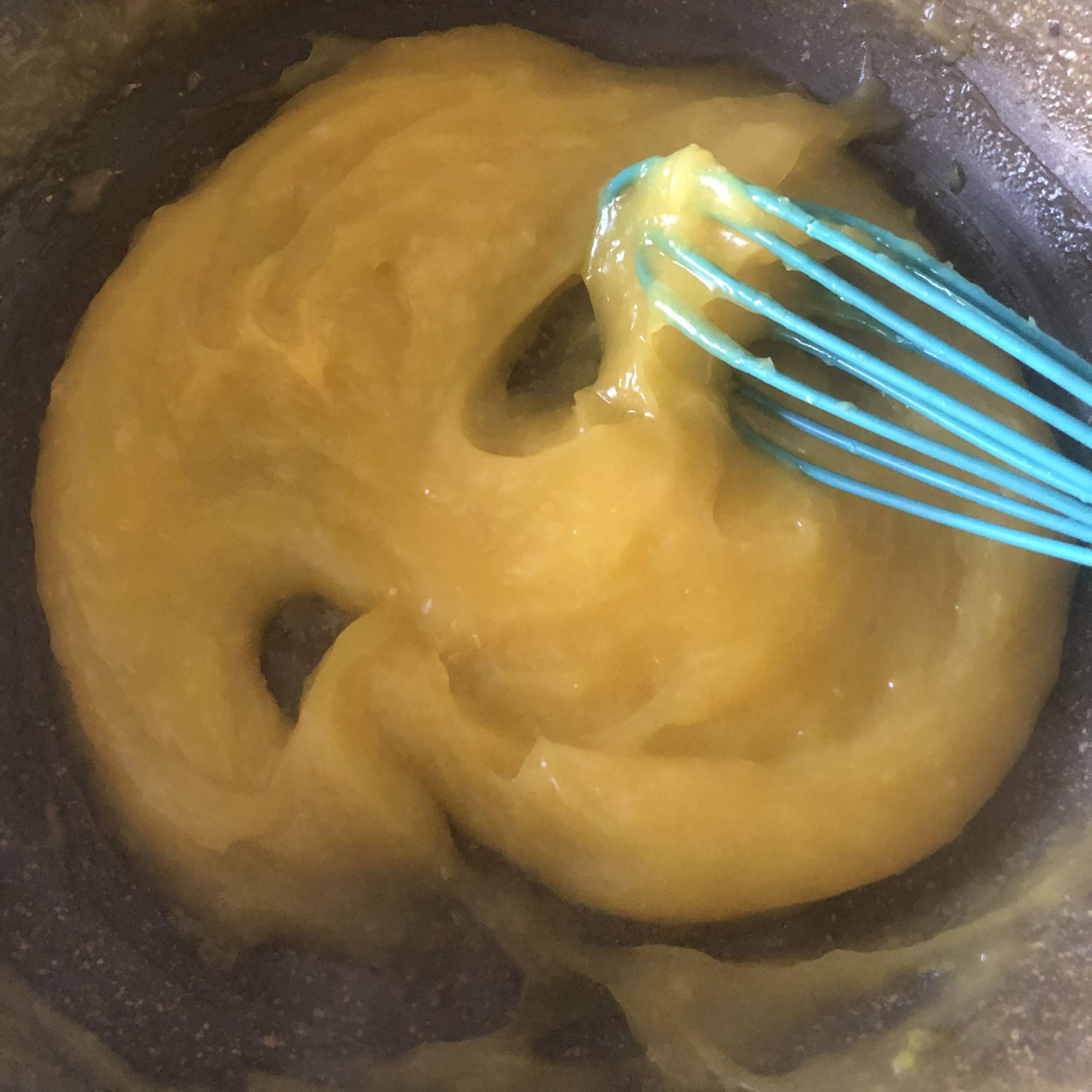Mientras se hornea, haz la crema. Disuelve la maicena en la leche de coco, mezcla con el zumo de naranja y pon a calentar en un cazo removiendo con unas varillas hasta que espese. Vierte en un recipiente, cubre con film y deja enfriar.