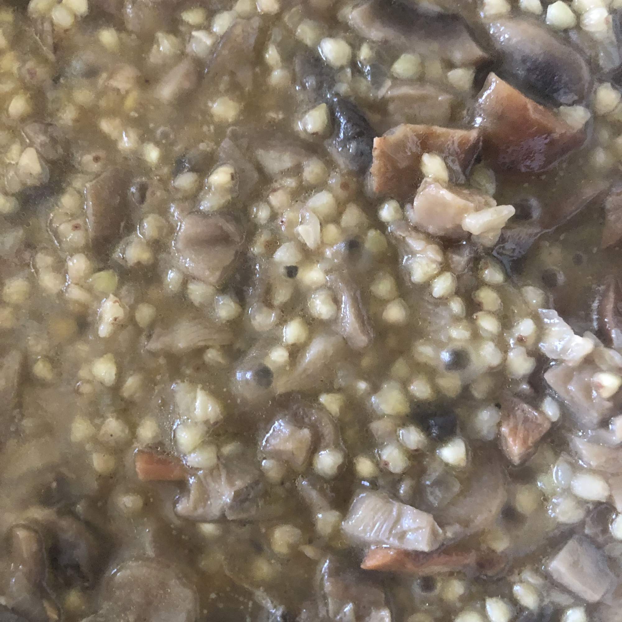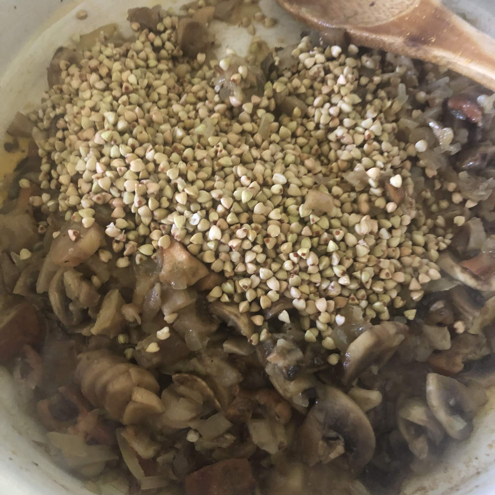En una sartén con un poco de aceite pocha la cebolla. Cuando empiece a transparentar agrega el ajo y salpimenta. Cocina un par de minutos y agrega las setas. Añade el trigo sarraceno y remueve para que se integren los sabores. Añade el agua o caldo caliente de a poco, dejando que absorba todo antes de añadir más. La última vez que añadas el agua, agrega también el puré de calabaza y el curry.