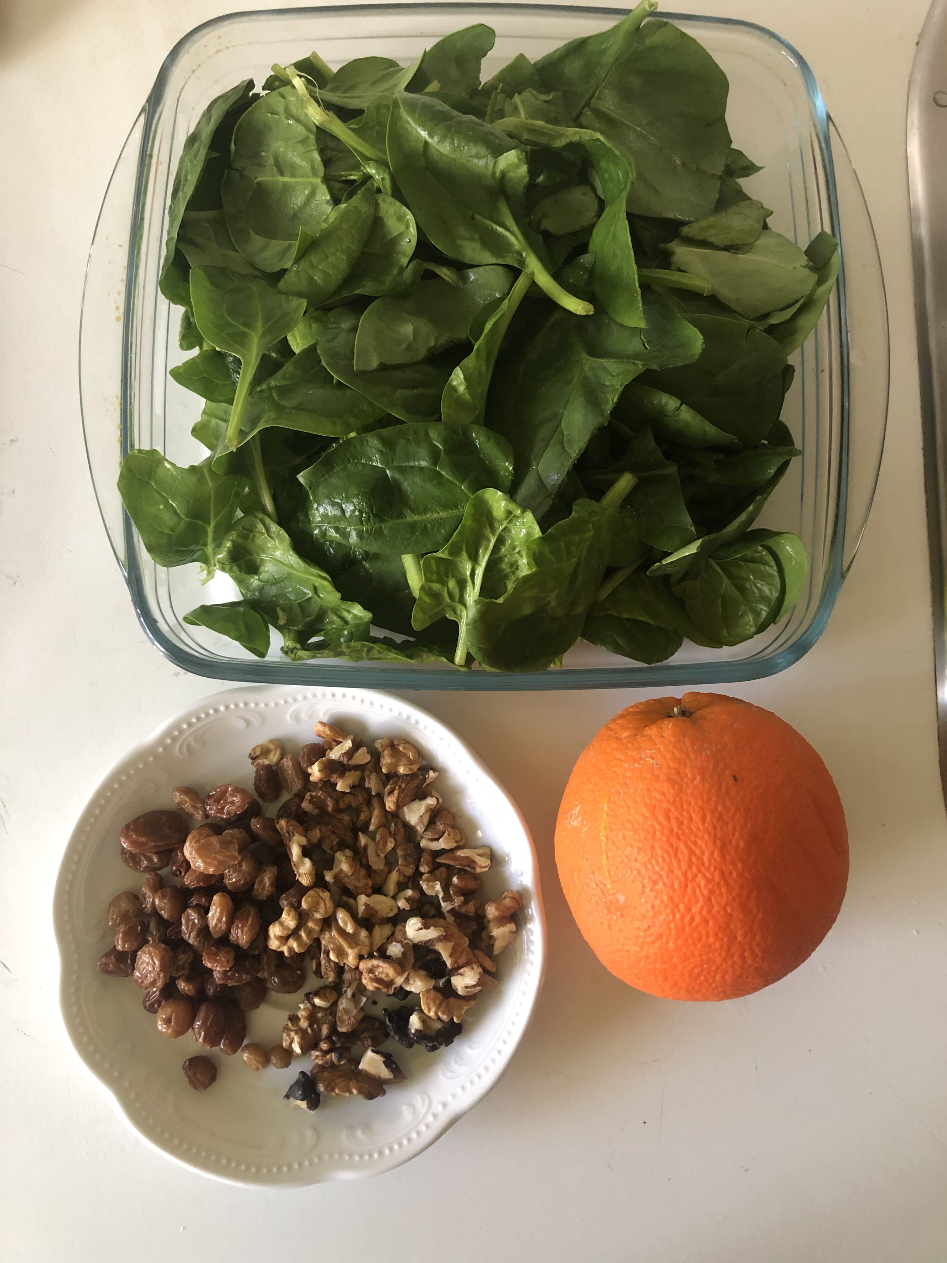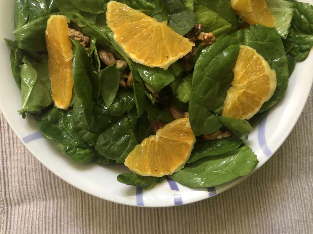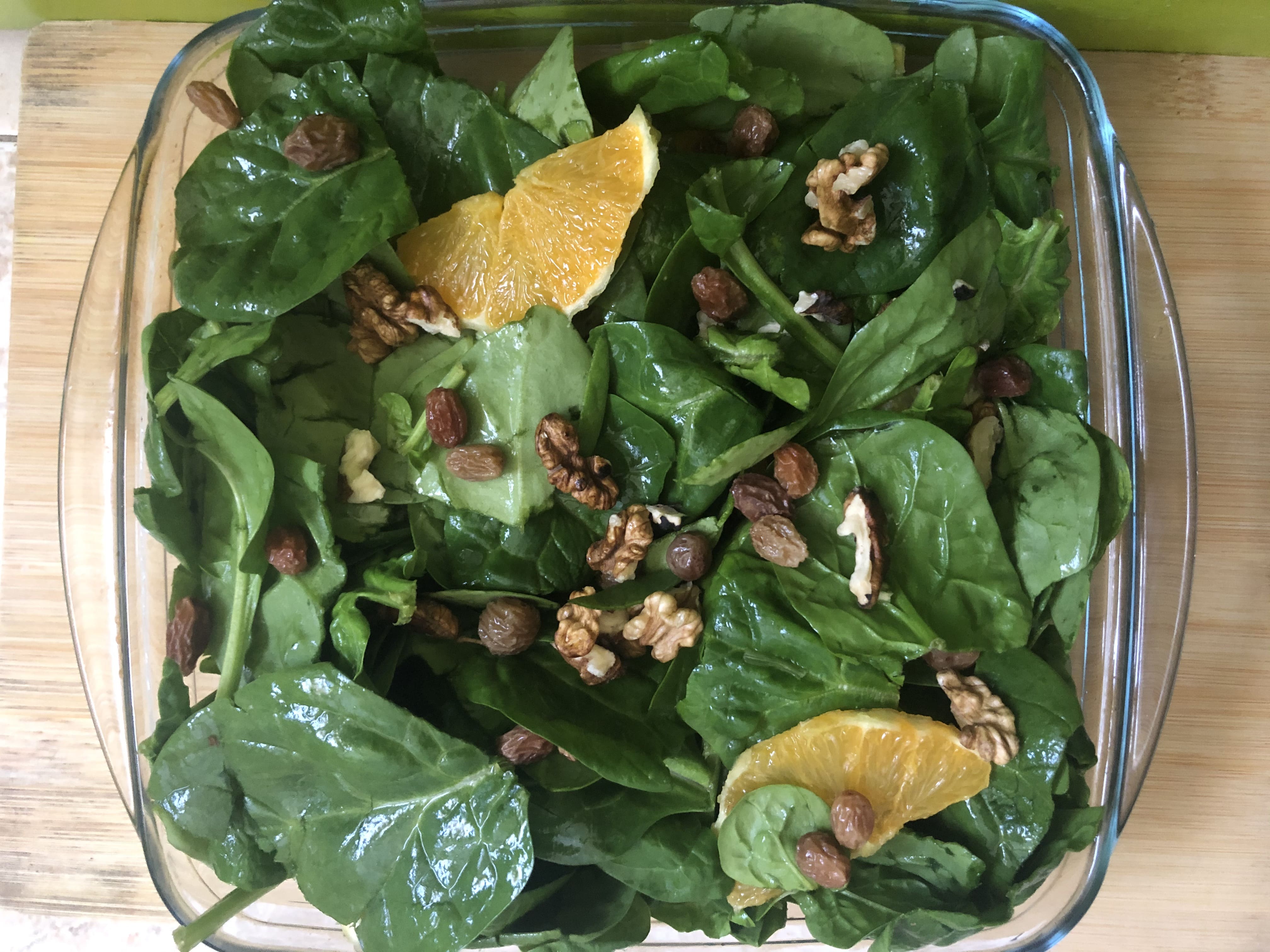 ENSALADA DE ESPINACAS, NARANJA, NUECES Y PASAS