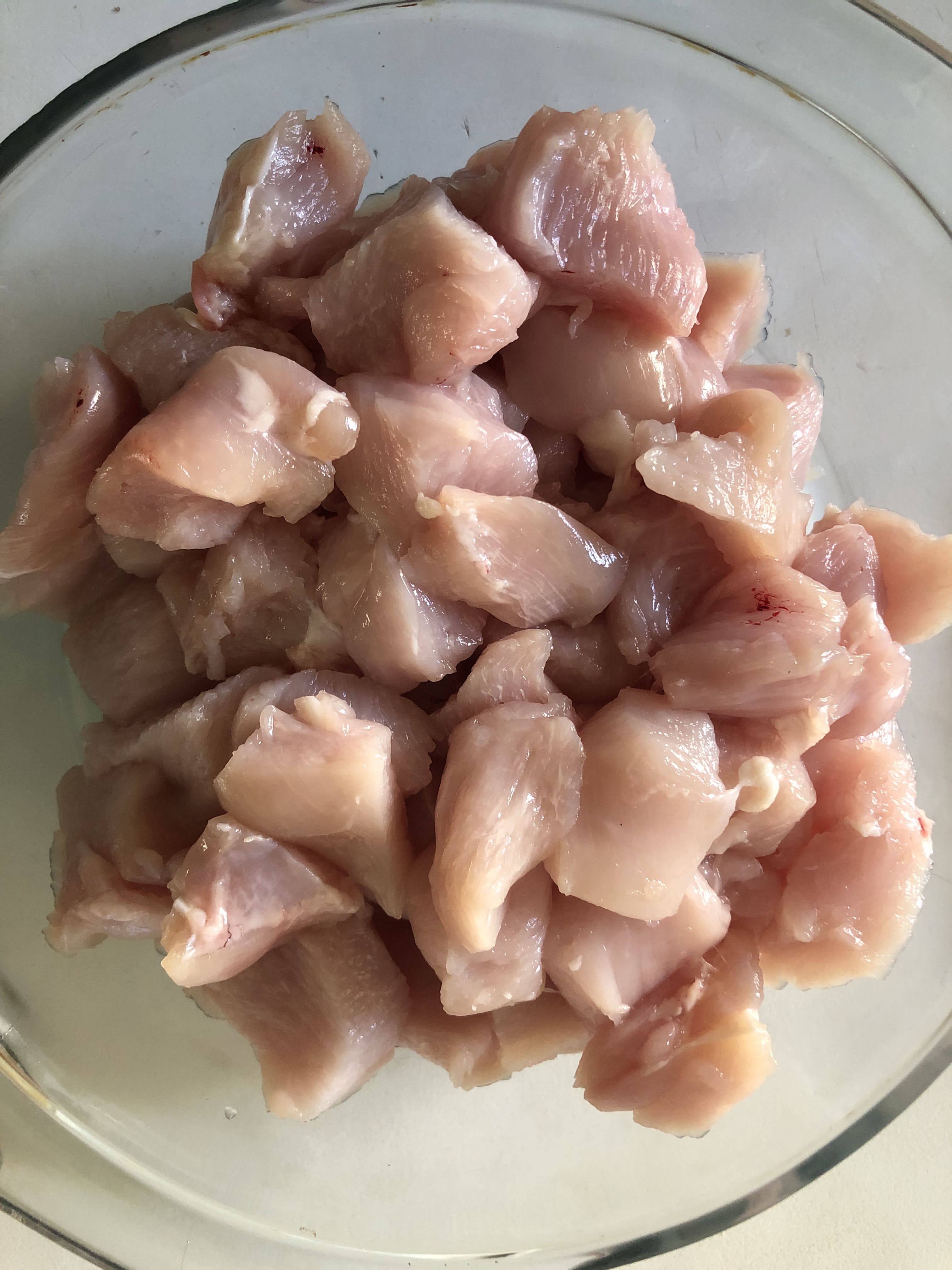 Corta las pechugas en trozos tamaño bocado y coloca en un recipiente amplio. Tritura los anacardos.