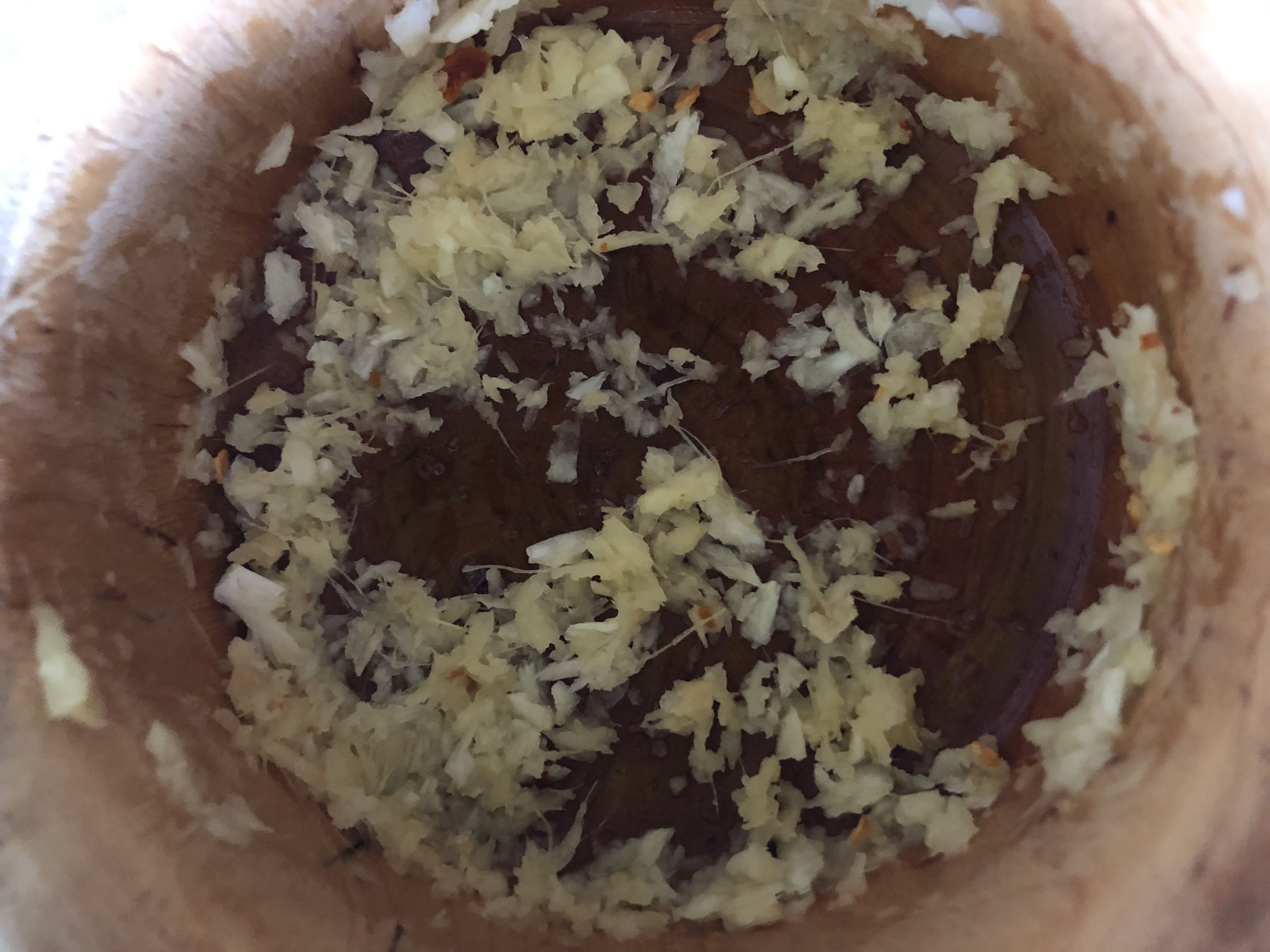 En un mortero, tritura el ajo, el jengibre y las especias hasta obtener una pasta homogénea.