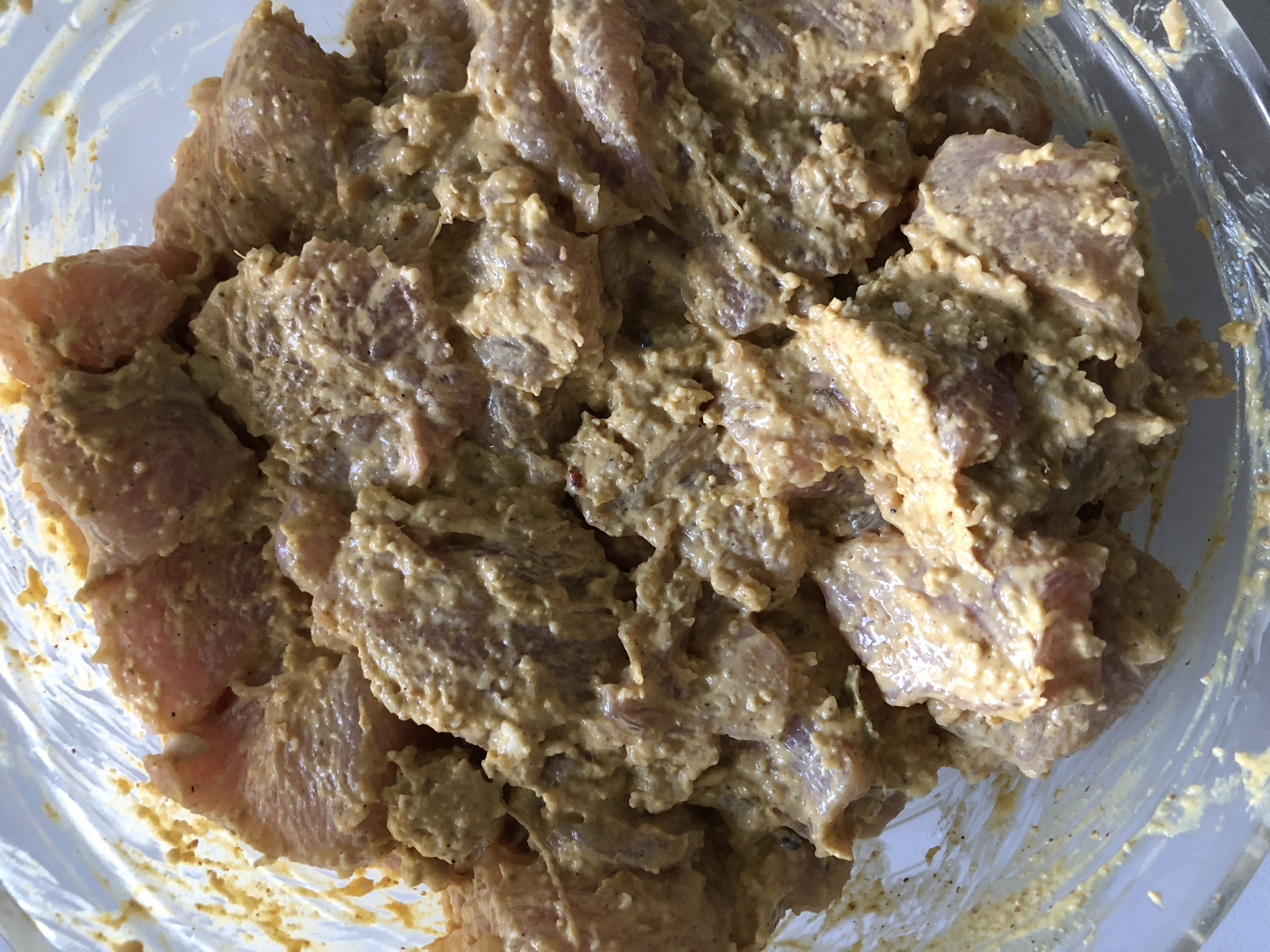 Agrega el yogur y los anacardos triturados. Vierte sobre el pollo y mezcla hasta que quede bien impregnado. Cubre con papel film y deja macerar en la nevera 4-5 horas (mejor si lo dejas toda la noche).
