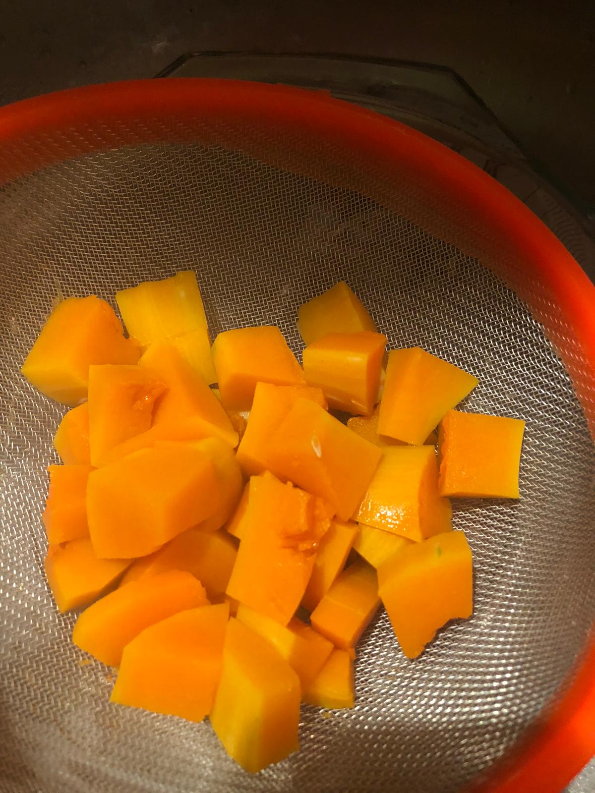 Asa la calabaza si no la tienes preparada. Pela y corta en cubos no muy grandes. Riega con un poco de aceite de oliva y hornea a 170ºC hasta que esté tierna. Pela la zanahoria, corta en rodajas no muy gruesas y cuece en abundante agua con sal. Escurre y reserva. Tritura la calabaza y la zanahoria con un tenedor.