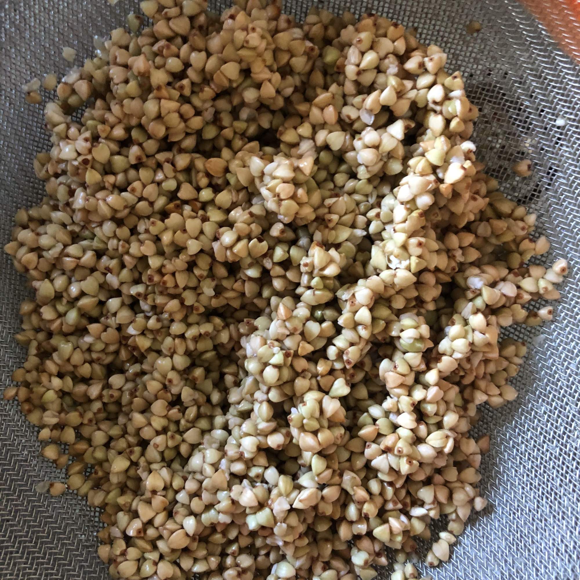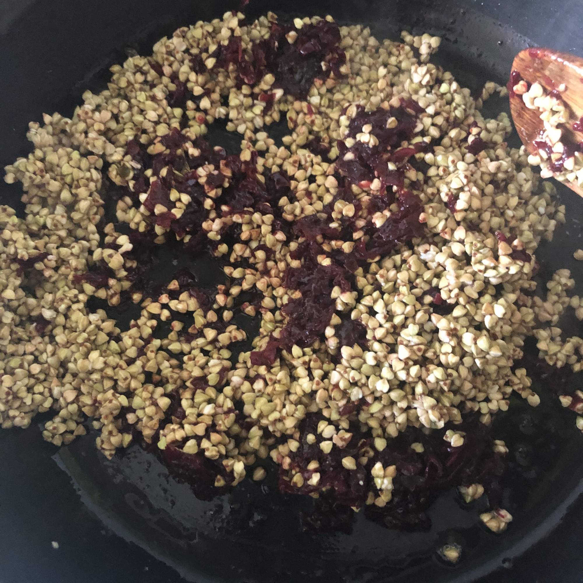 Agrega el trigo sarraceno y remueve. Finalmente, añade el agua y cocina hasta que esté tierno y haya absorbido todo el líquido.