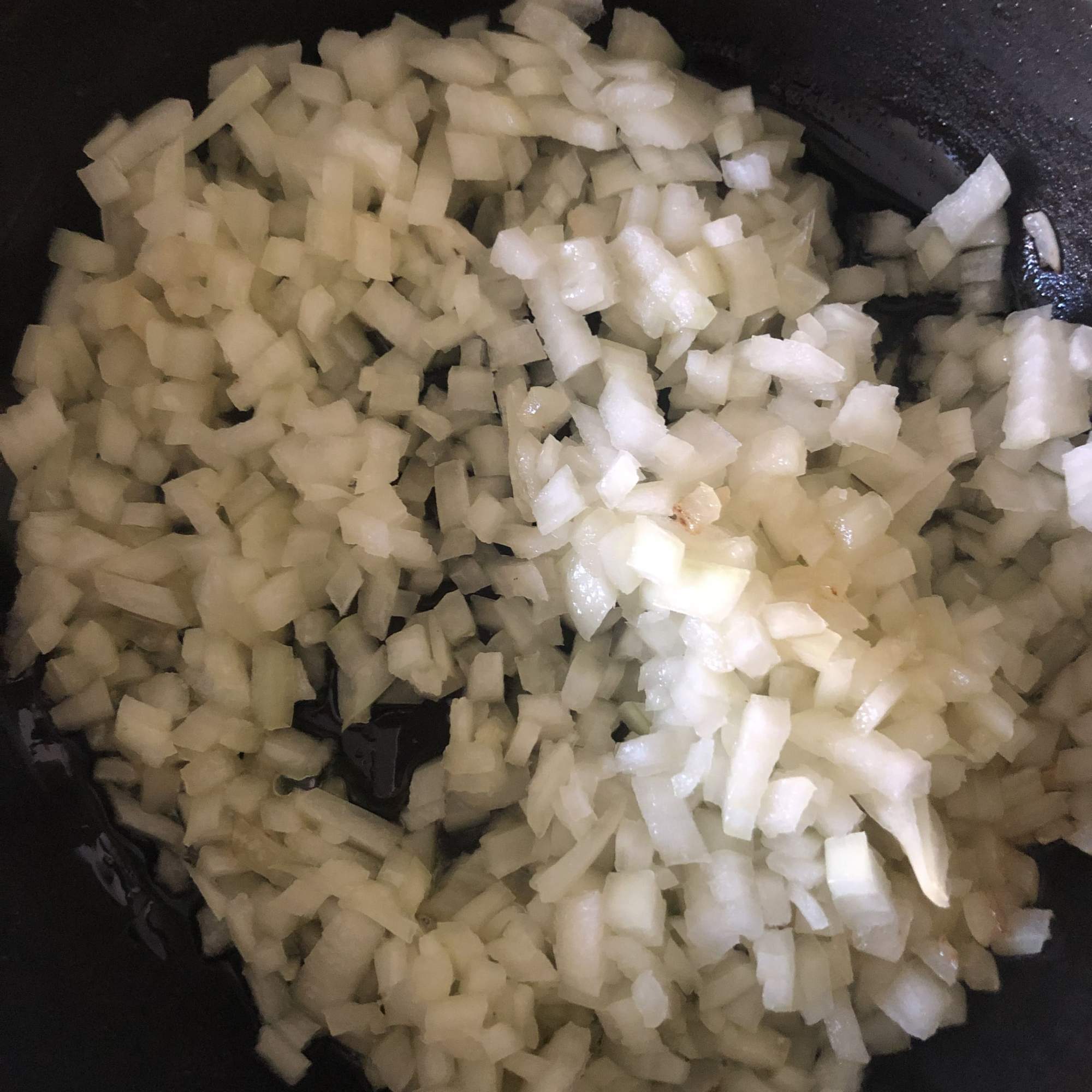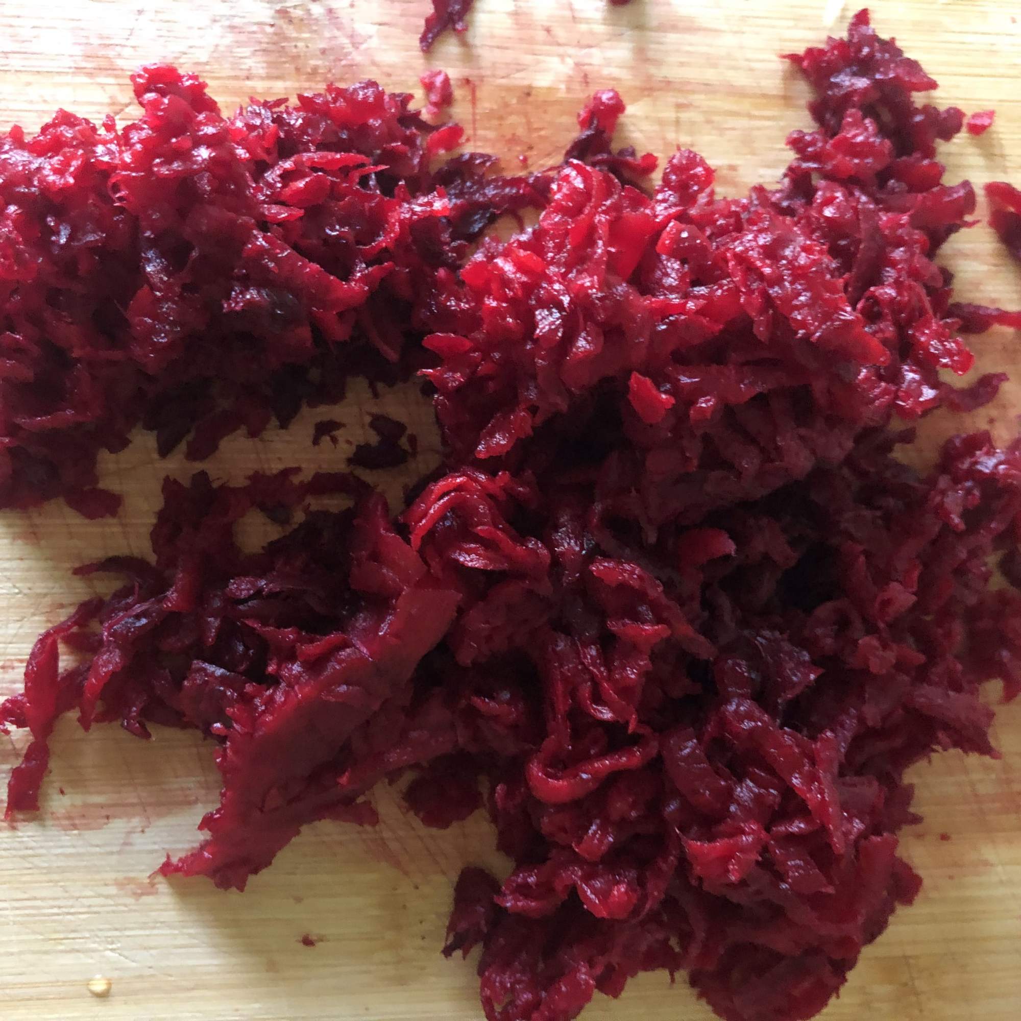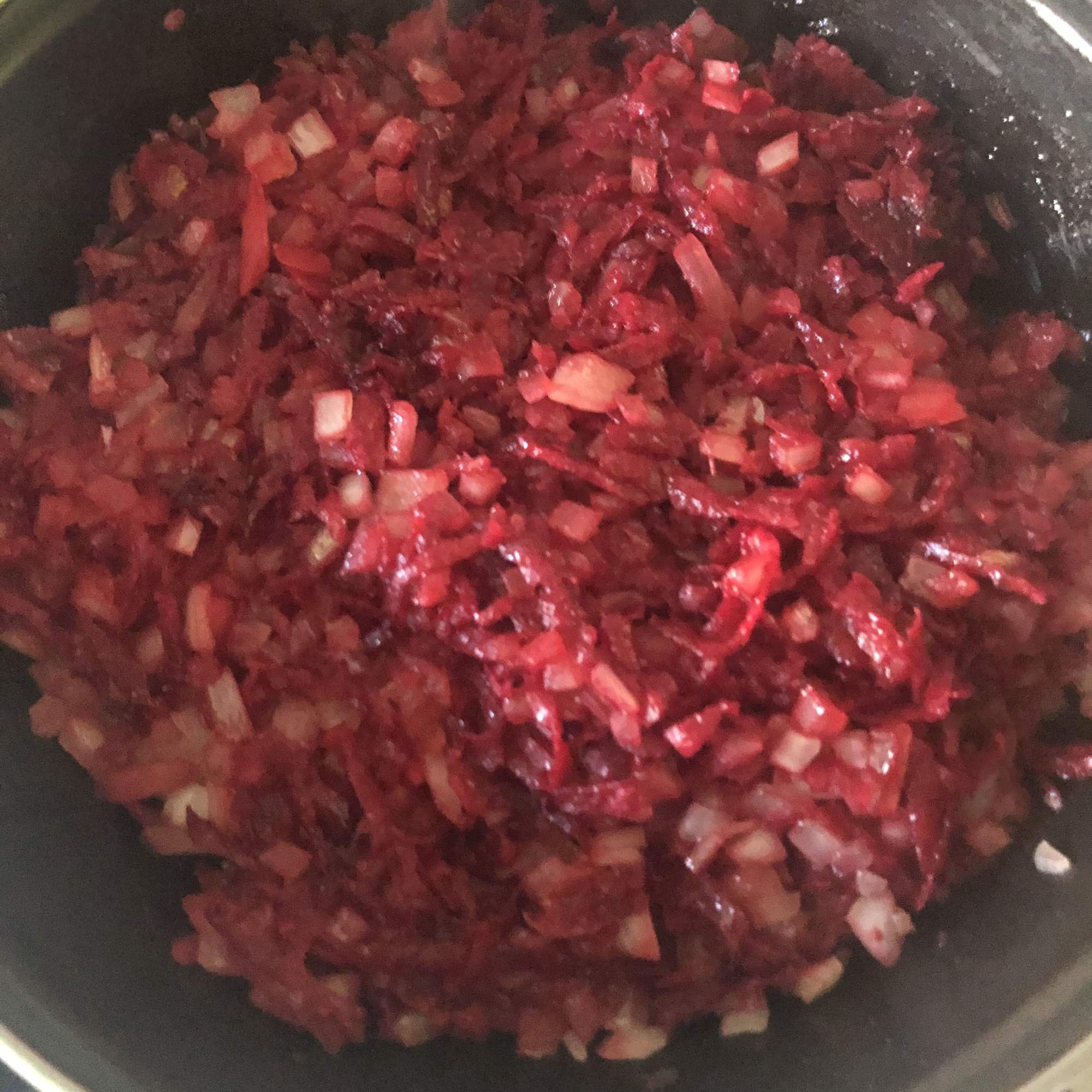 Corta la cebolla en brunoise, ralla la remolacha y pica el ajo finamente. En una sartén honda, con un poco de aceite, pocha las verduras junto con la salsa de soja y resto de especias, hasta que la remolacha esté tierna.