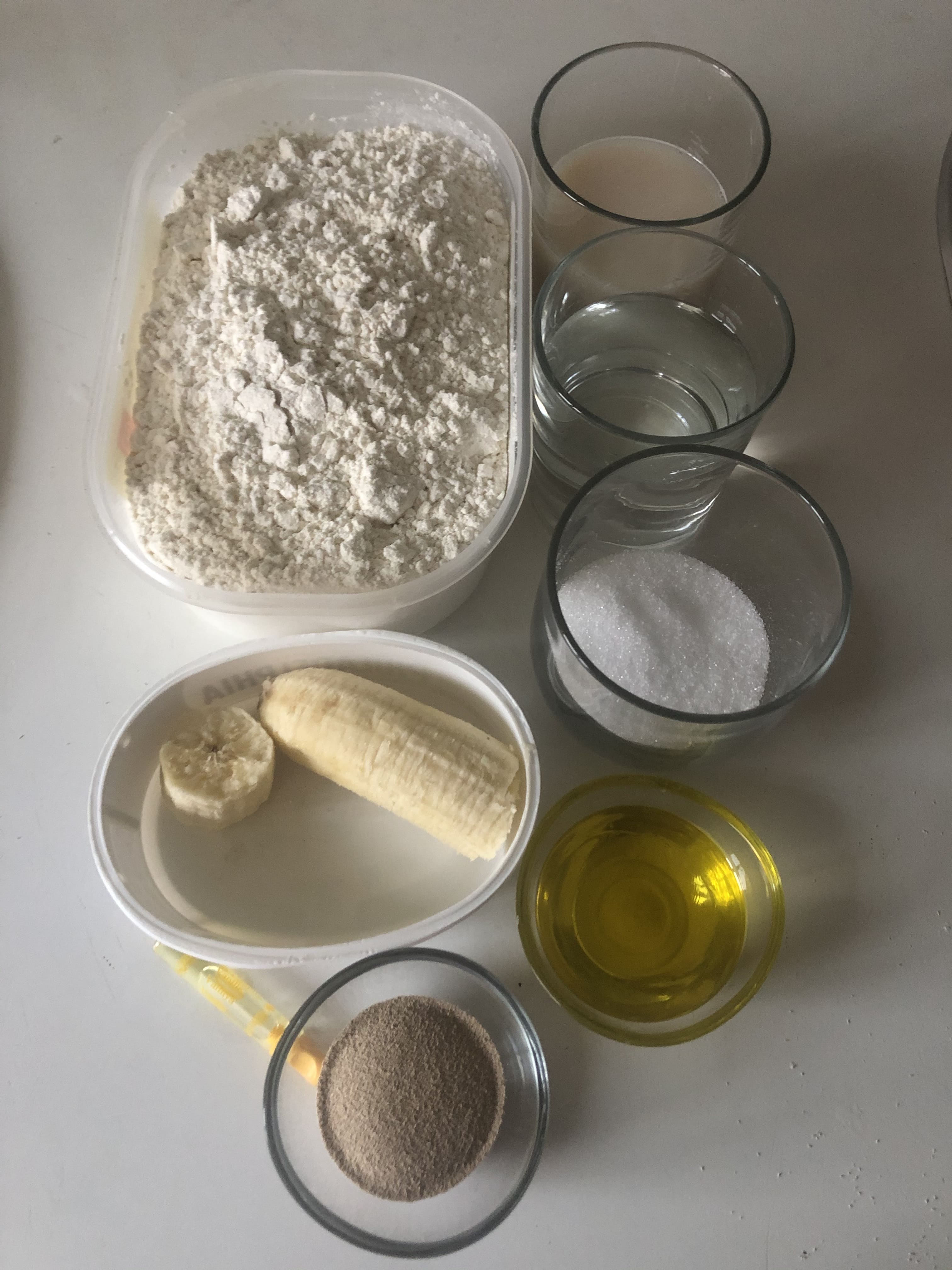 Prepara la masa: calienta la leche (los 105 ml + la cantidad anterior) hasta que esté tibia. Añade la levadura y disuelve. Reposa 5 minutos. Tritura el plátano y añade, junto con el eritritol, a la levadura (deja que fermente mientras preparamos el resto).