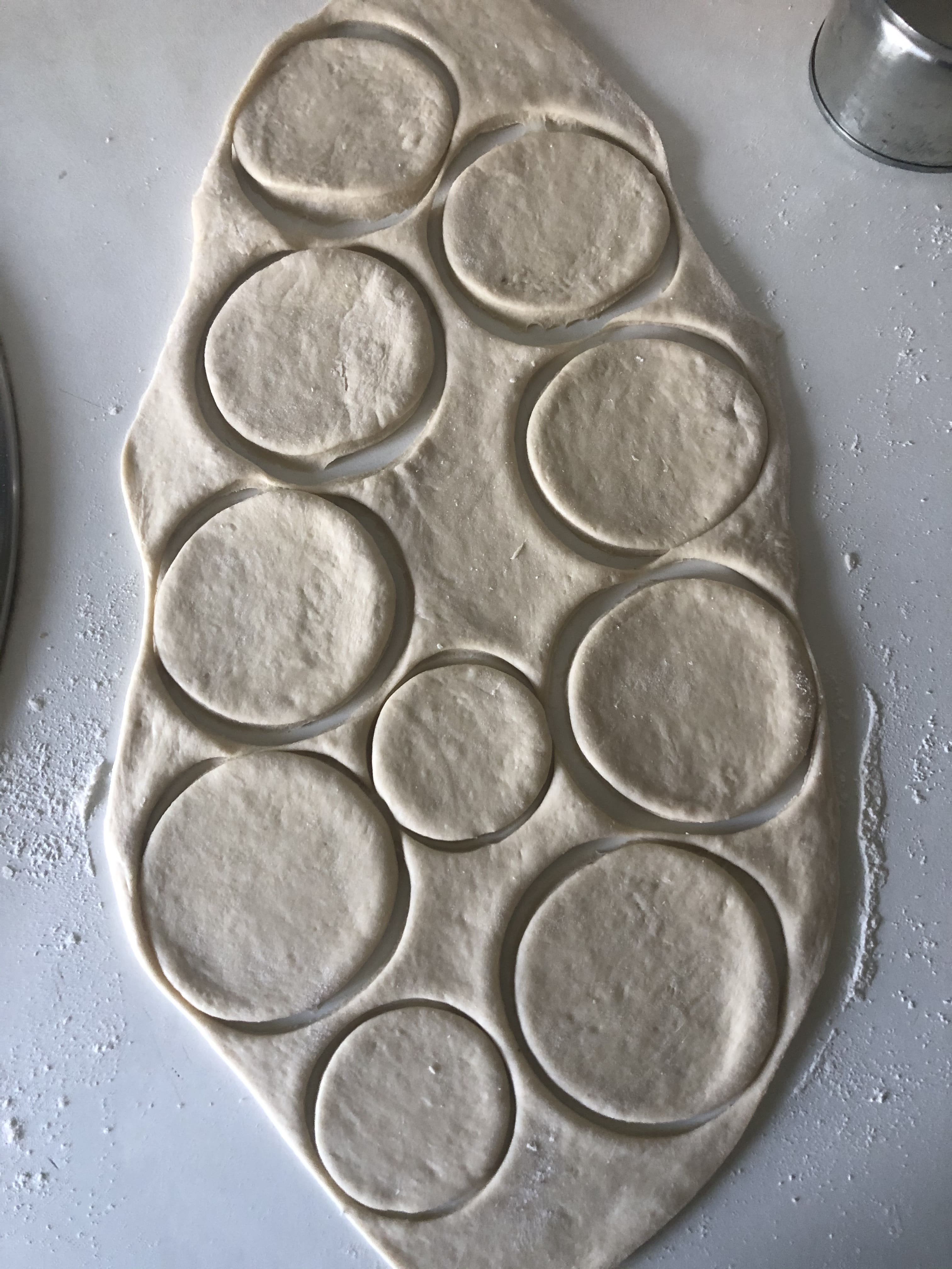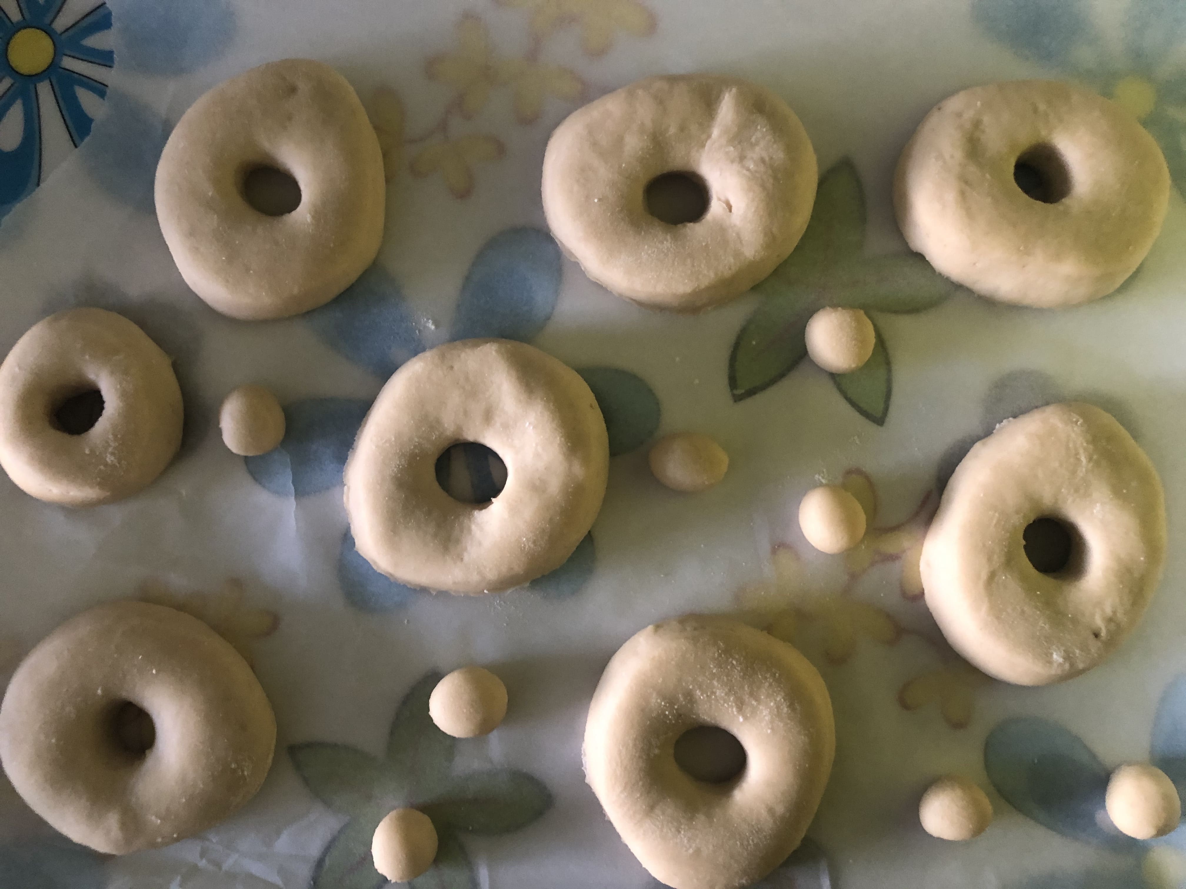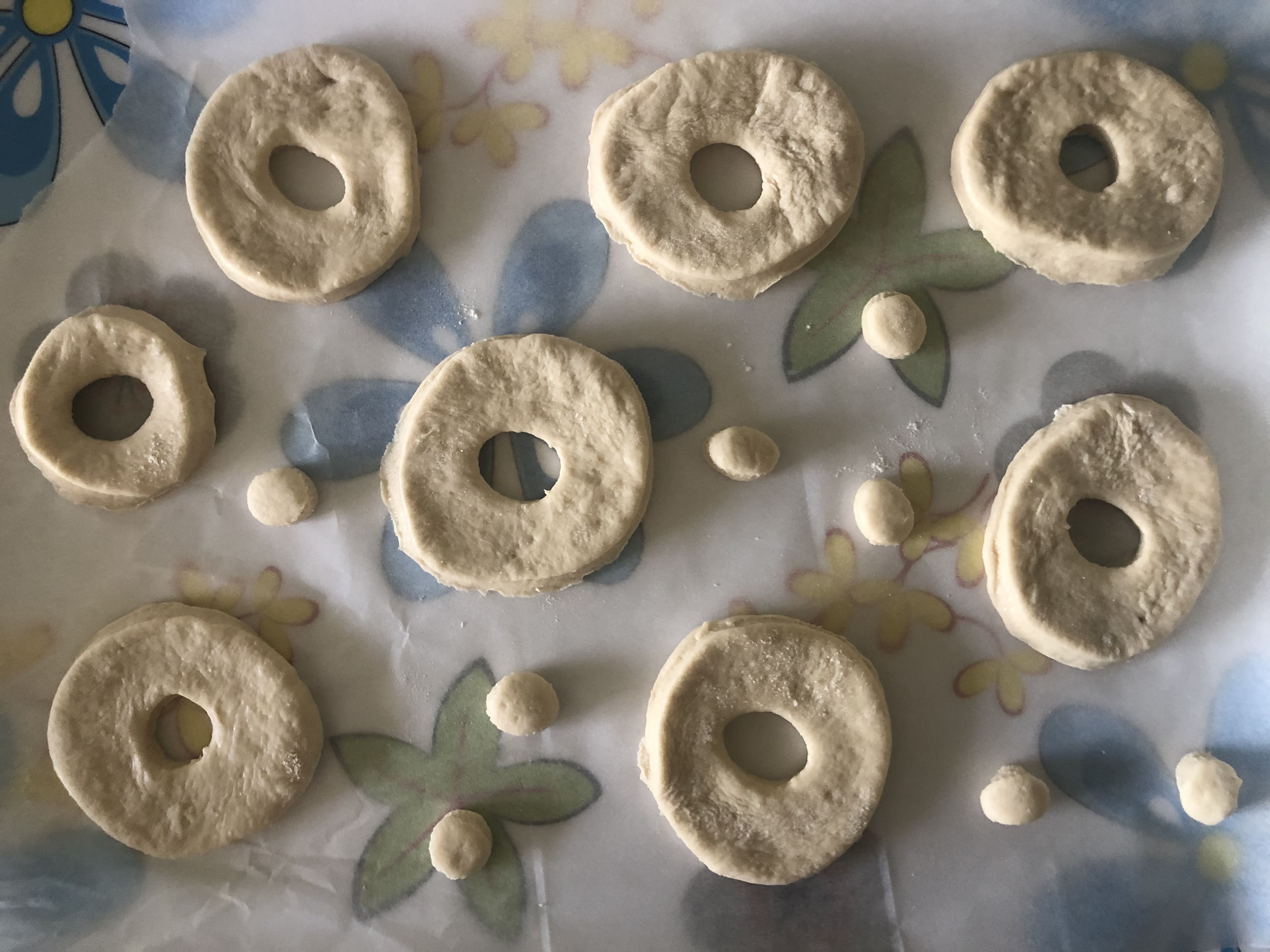 Al día siguiente divide la masa en 2-3 trozos para trabajar mejor. Enharina la superficie de trabajo y estira la masa con un rodillo, dejando 1 cm de grosor. Corta con un molde redondo y haz el círculo con un molde más pequeño (yo utilicé un descorazonador de manzanas). Forra una bandeja con papel vegetal y coloca los donuts, dejando una distancia entre ellos. Cubre con un paño seco y deja levar dos horas.
