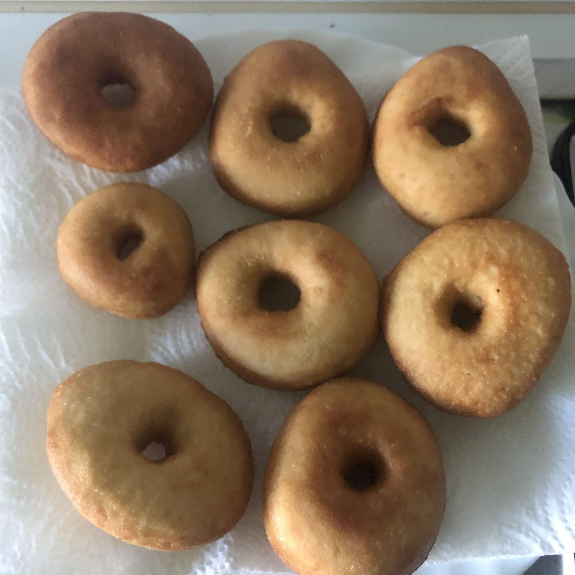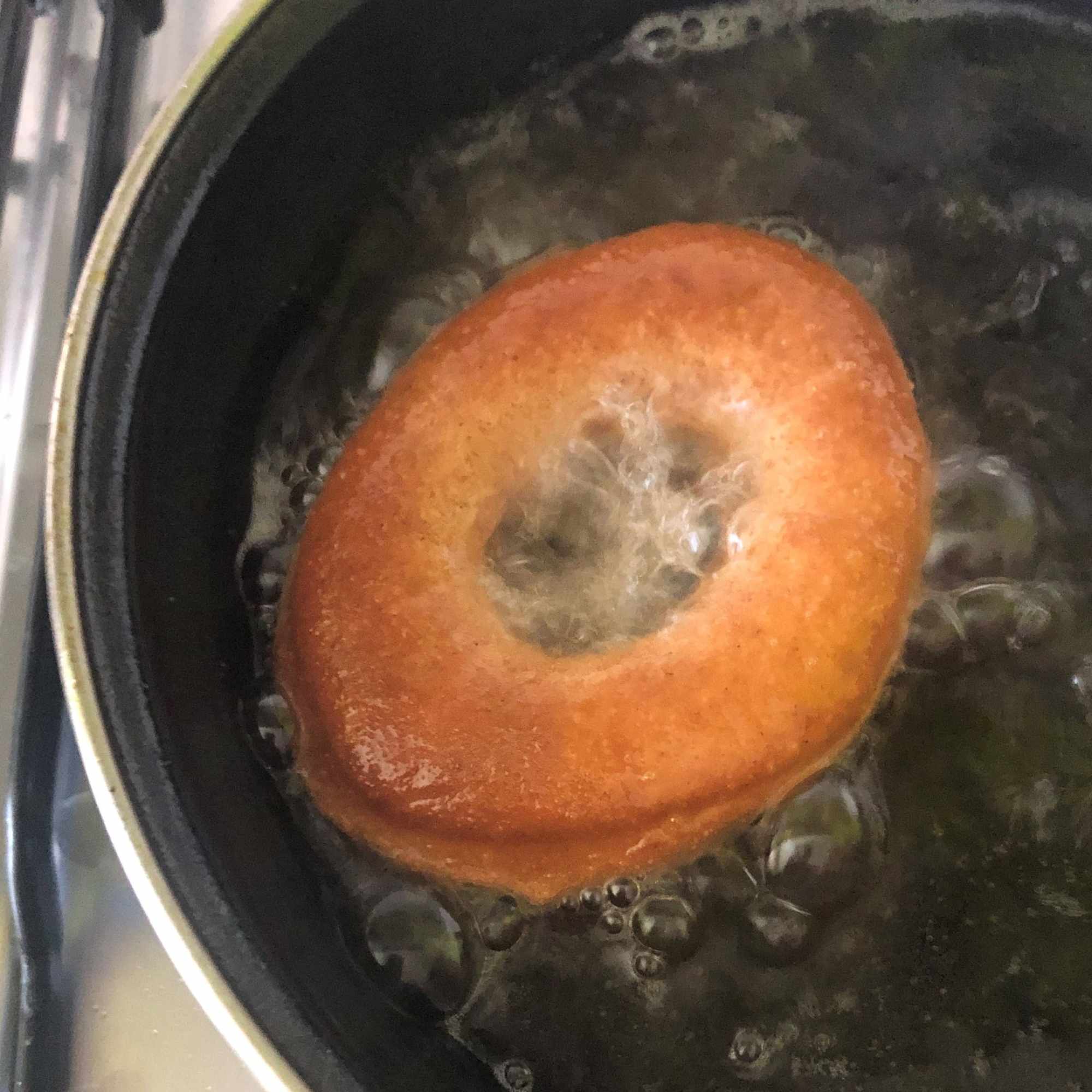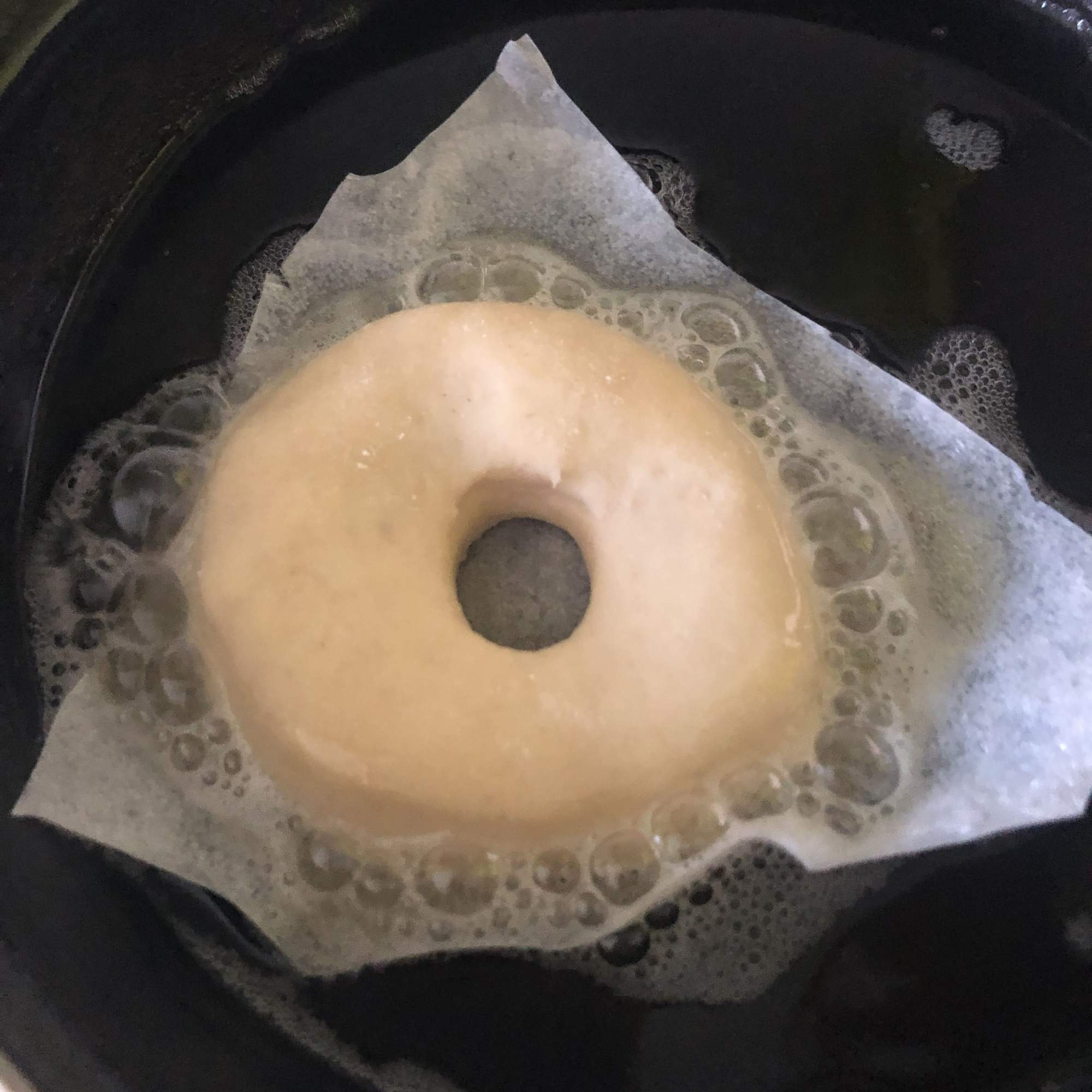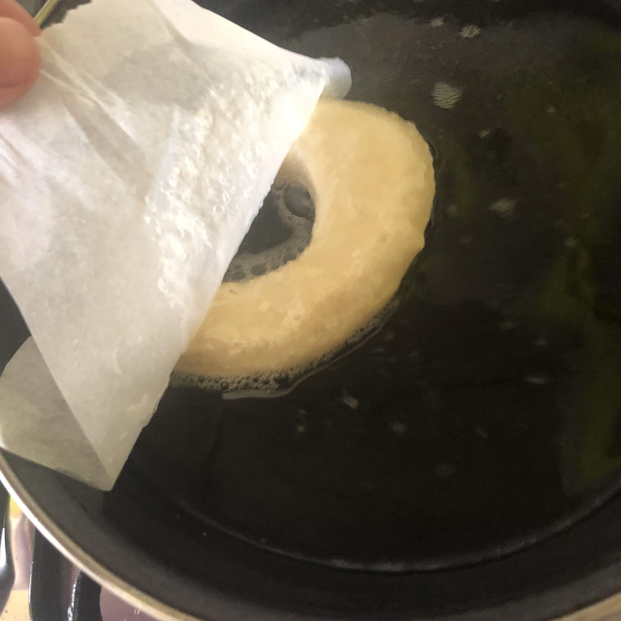 Calienta abundante aceite en una sartén. Corta el papel alrededor del donut para evitar manipularlo demasiado y mete en el aceite a fuego medio. Retira el papel con cuidado y deja que se dore por cada lado. Coloca sobre papel absorbente para eliminar el exceso de aceite.
