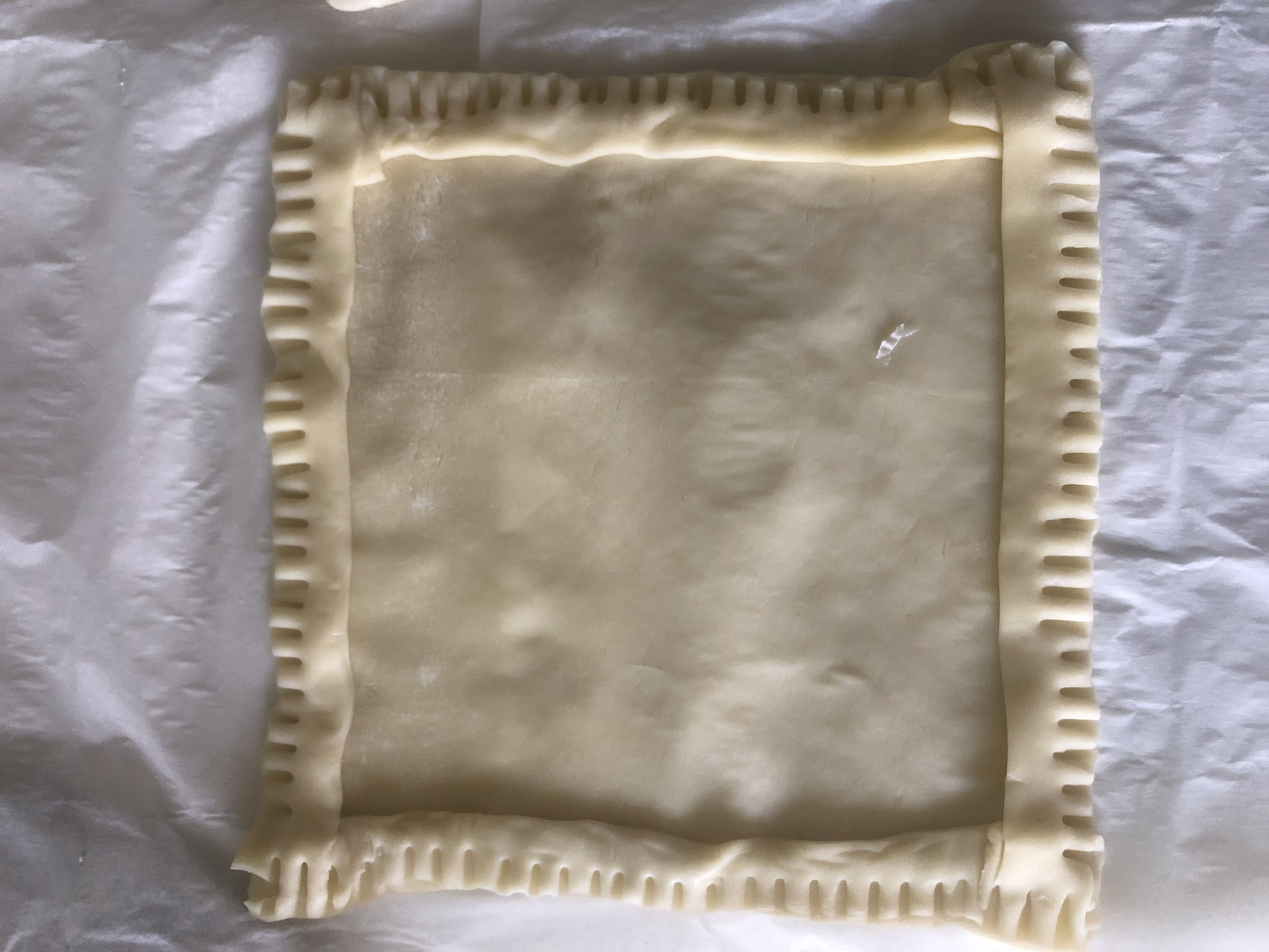 Precalienta el horno a 180ºC, con calor arriba y abajo. Deja que la placa de hojaldre se atempere antes de trabajar con ella. Córtala en cuatro partes. Corta una tira fina en cada uno de los extremos de los trozos que has cortado que nos servirán para hacer el borde. Colócalo encima, haciendo un “corralino”.