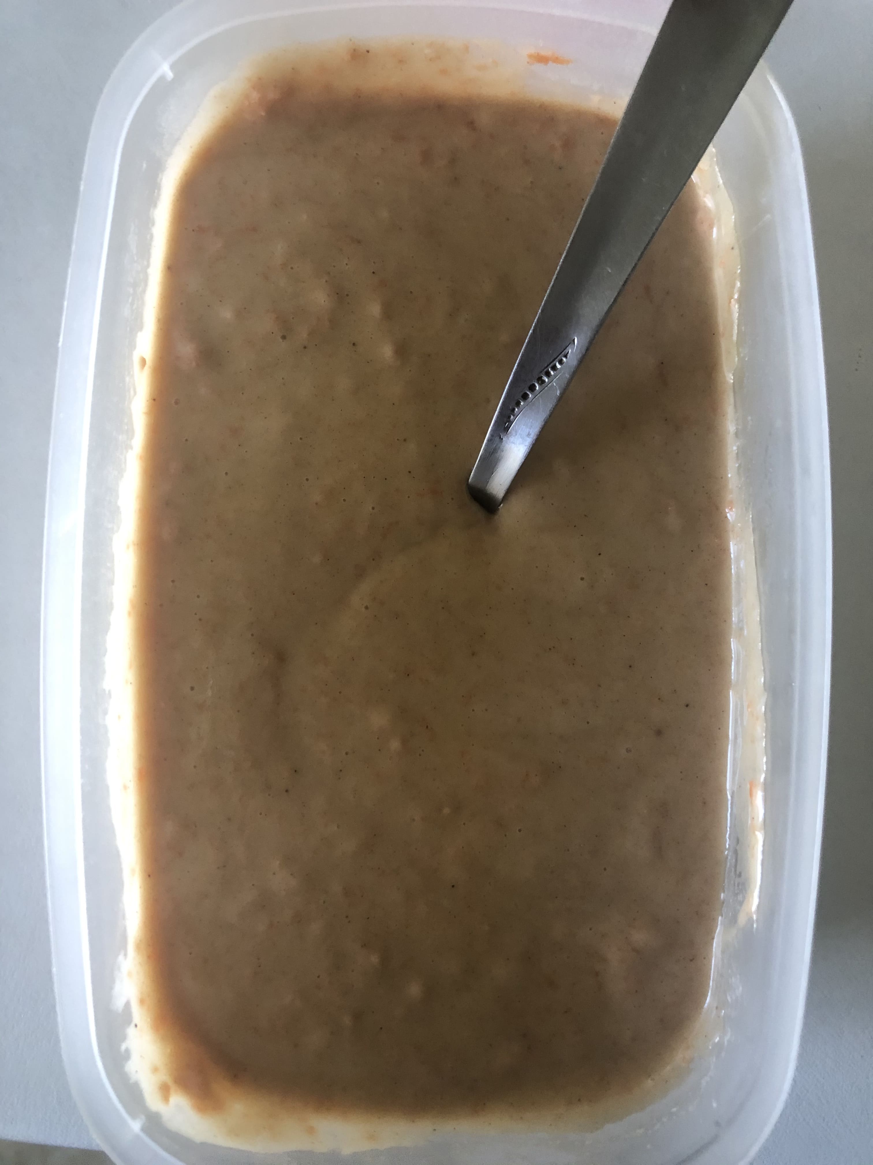 Ralla la zanahoria con la parte más pequeña del rallador y agrega a la masa. Vuelve a mezclar todo bien. Cubre el recipiente con papel film y deja reposar en la nevera un par de horas (te recomiendo dejarla toda la noche: el contraste frío-calor favorece la subida de la masa).