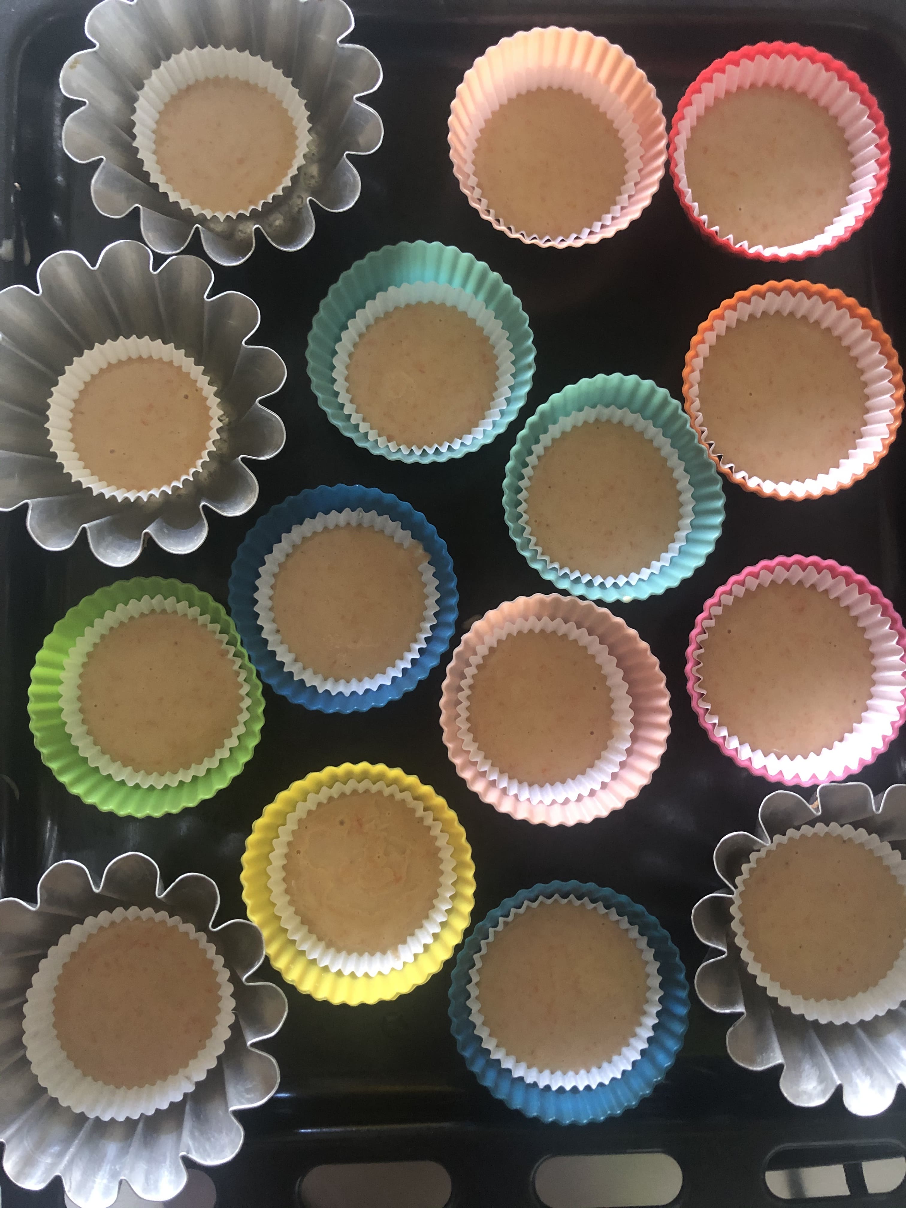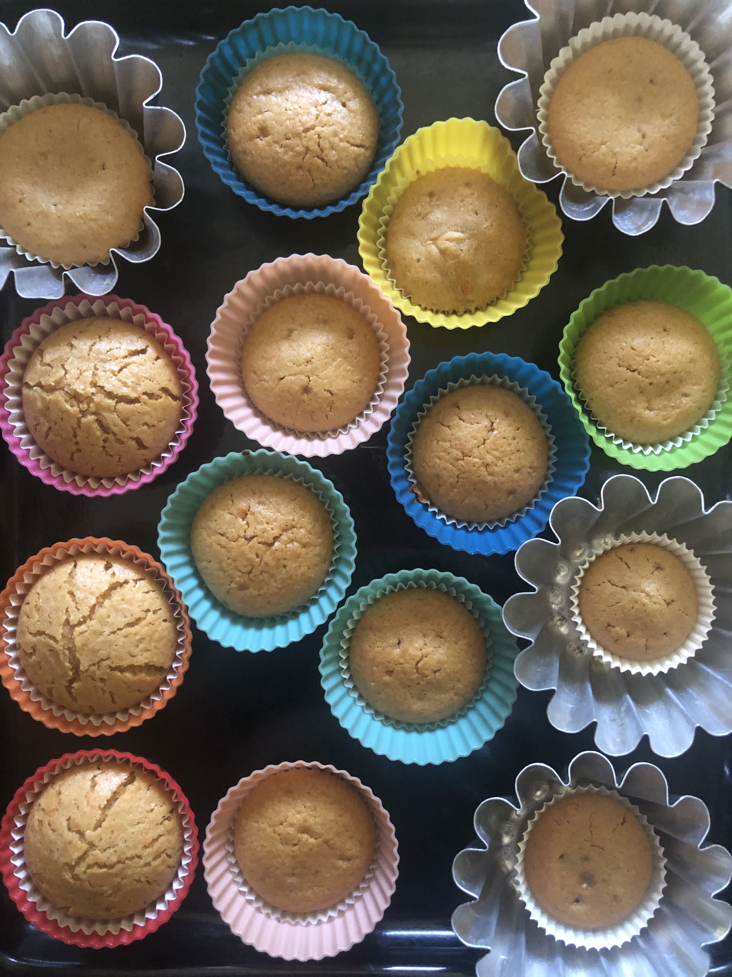 Precalienta el horno a 180ºC. Rellena los moldes con la masa hasta 2/3 de su capacidad. Hornea 20-25 minutos, hasta que adquieran un color dorado (dependerá del horno). Deja enfriar por completo sobre una rejilla.