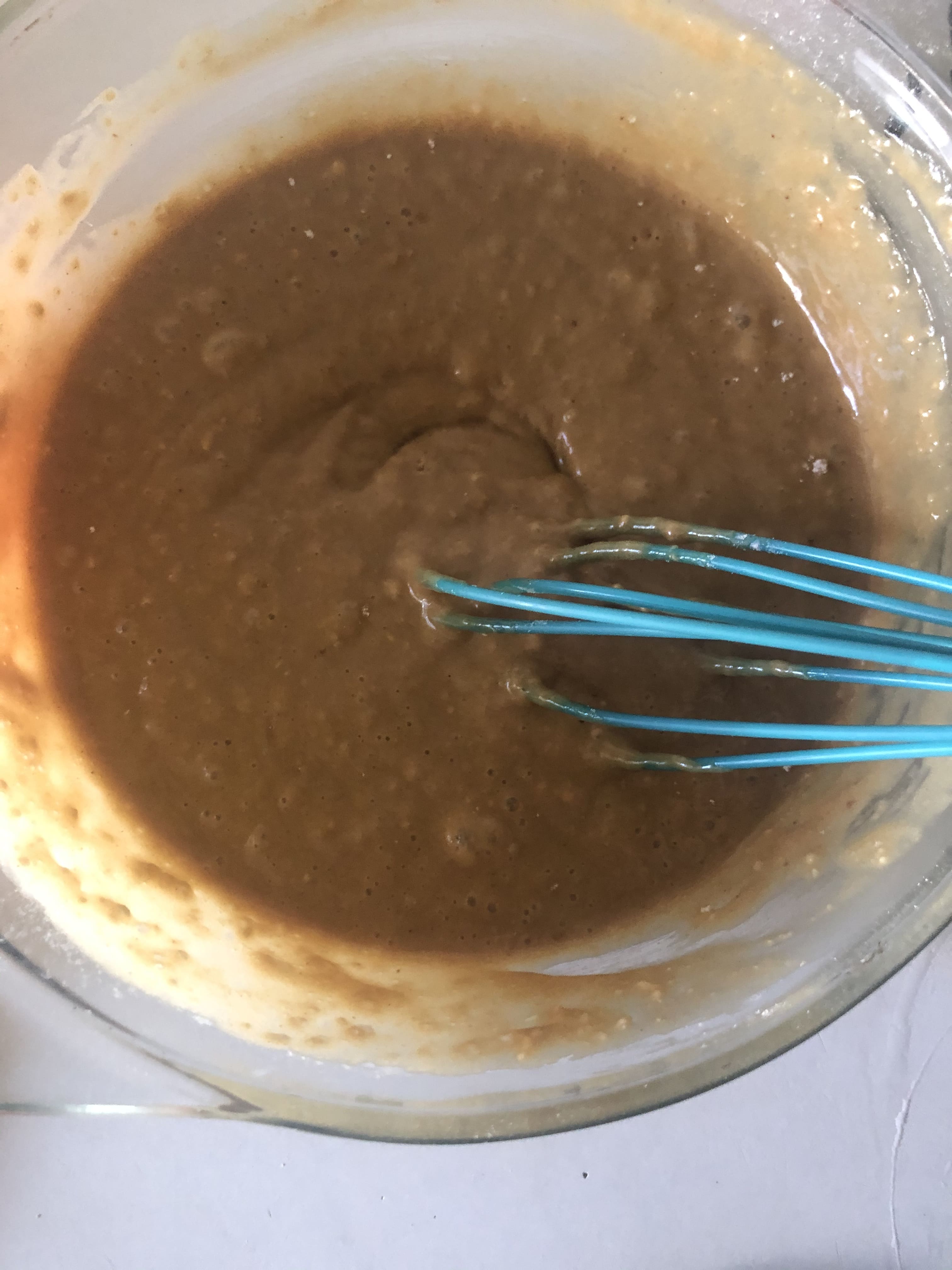 Vierte el aceite y el azúcar en el vaso de la batidora y mezcla con varillas durante un par de minutos (para airear la masa). Agrega la leche y sigue batiendo hasta hacer espuma. Añade a los ingredientes secos e integra con varillas hasta conseguir una textura cremosa y sin grumos.