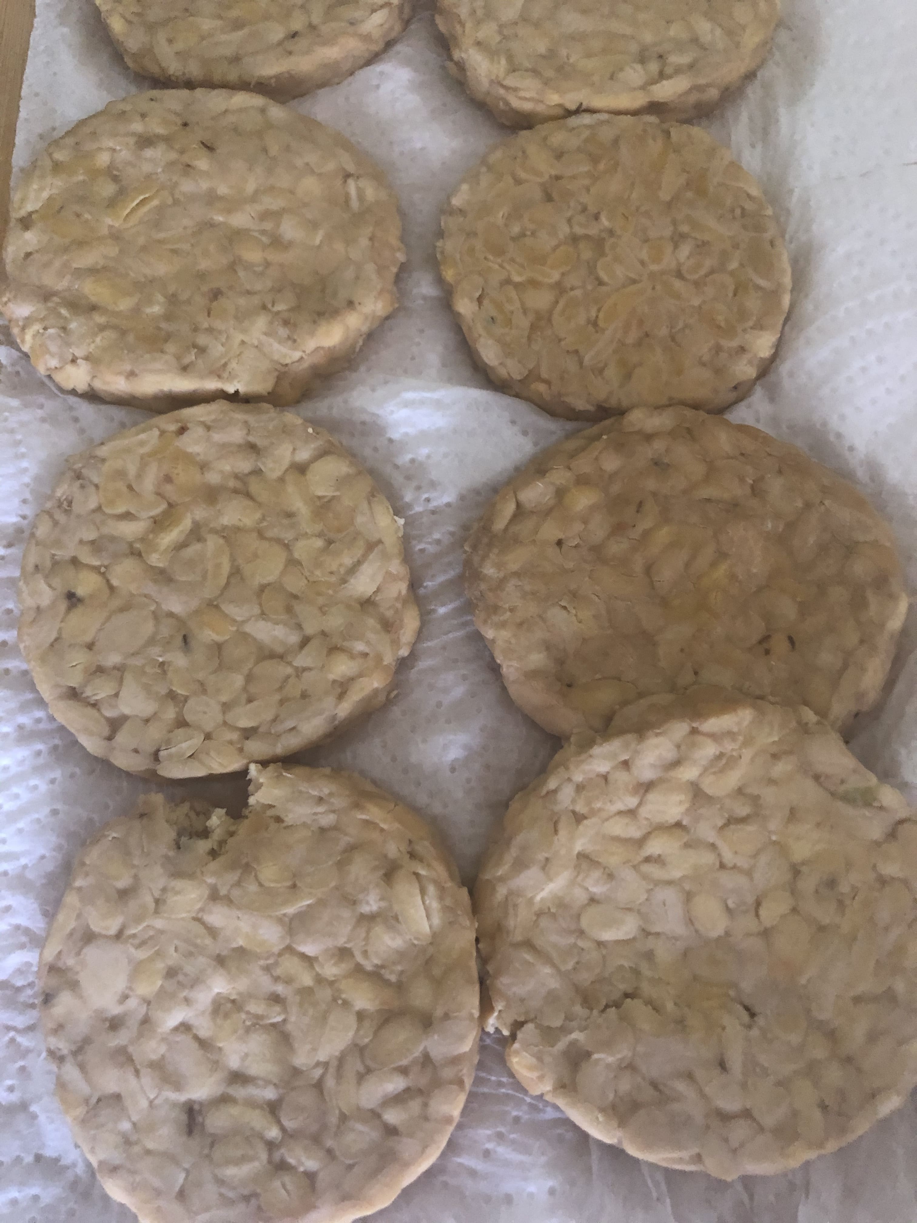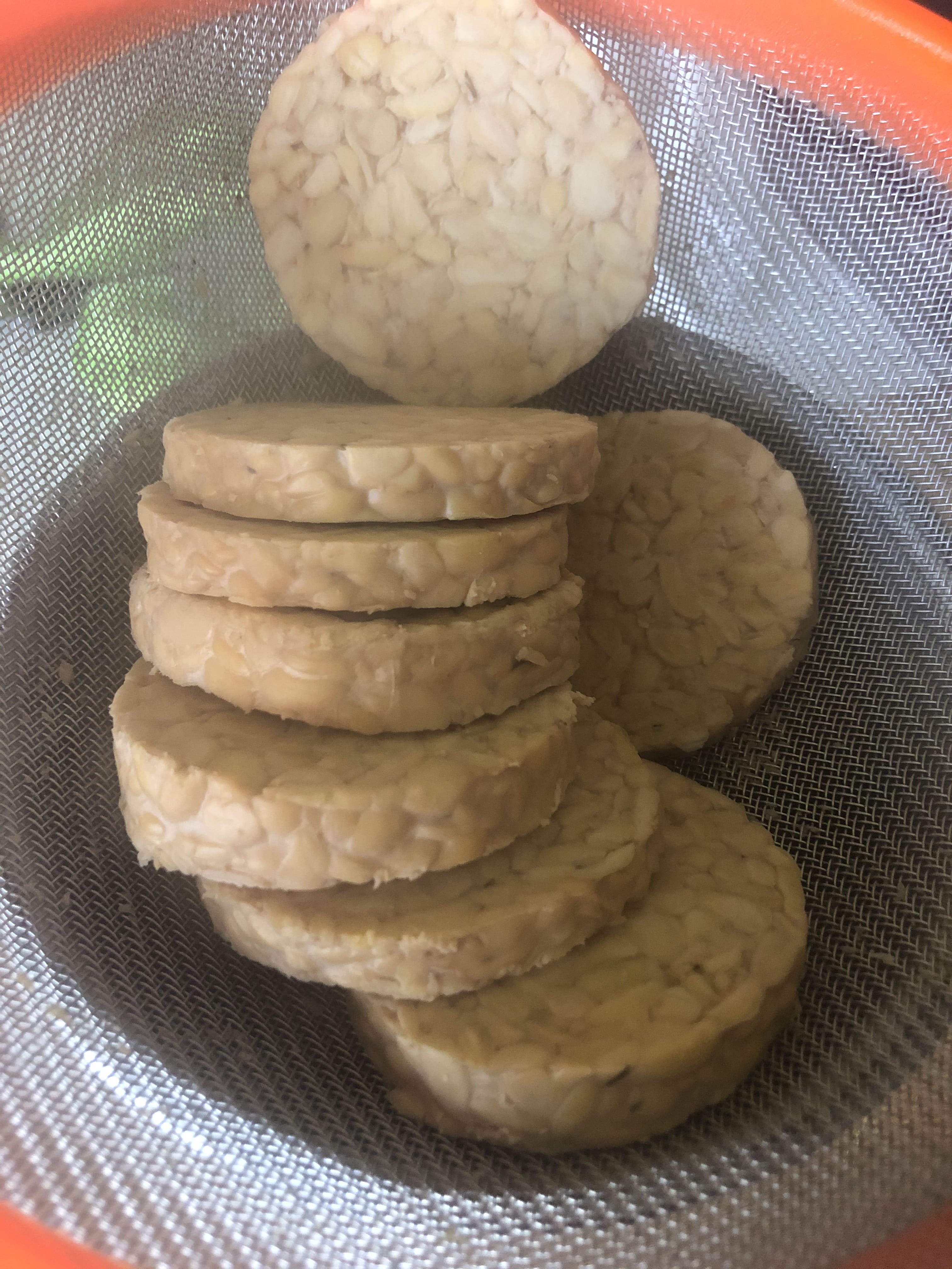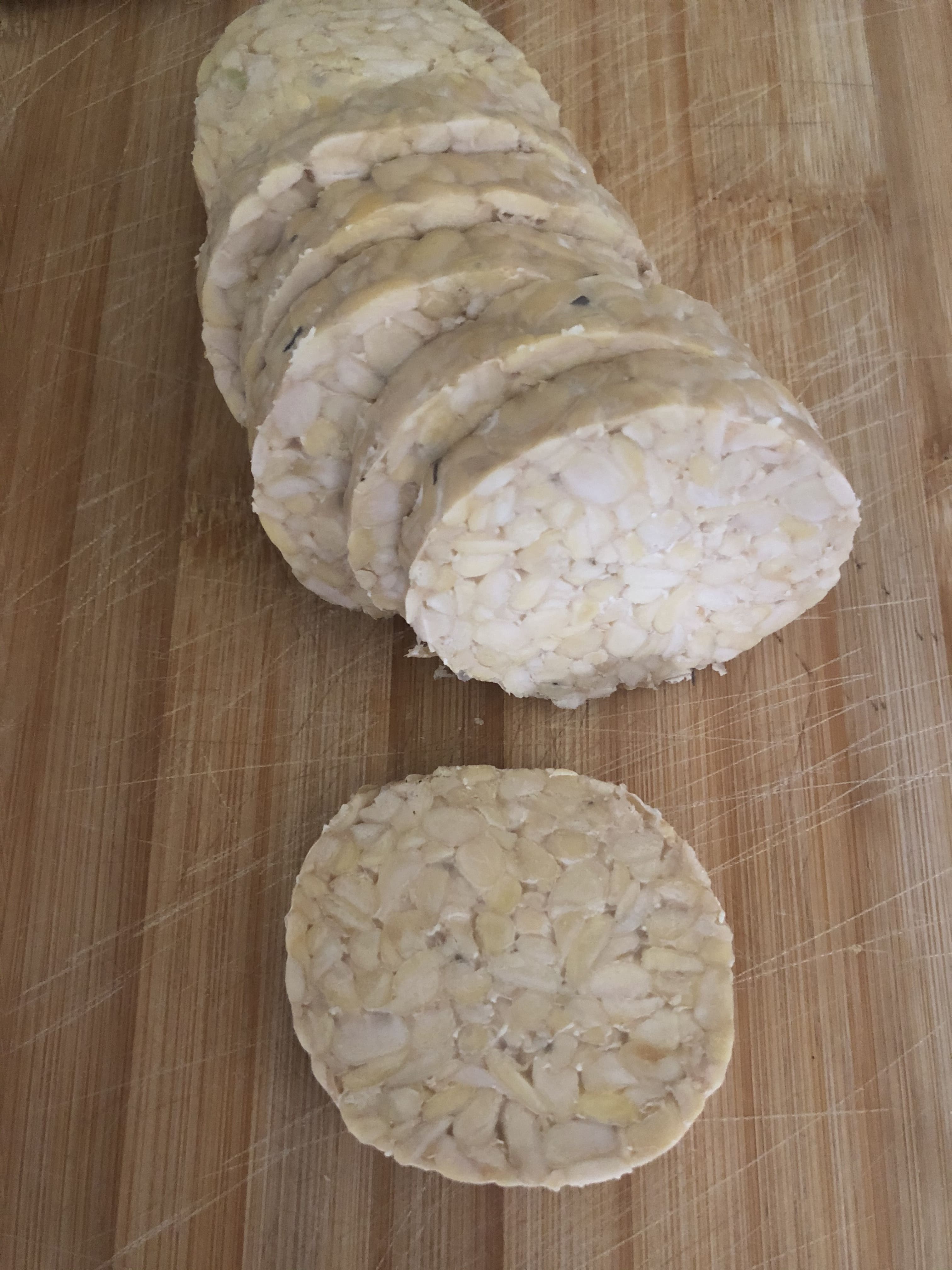 Es la primera vez que consumo tempeh. ¿Sabéis lo que es? Pues soja o garbanzos fermentados. Suele venir en bloques rectangulares o en barra y es curioso, ya que ves los granos y el hongo que se utiliza para fermentarlos. Es un alimento rico en proteínas y probióticos.