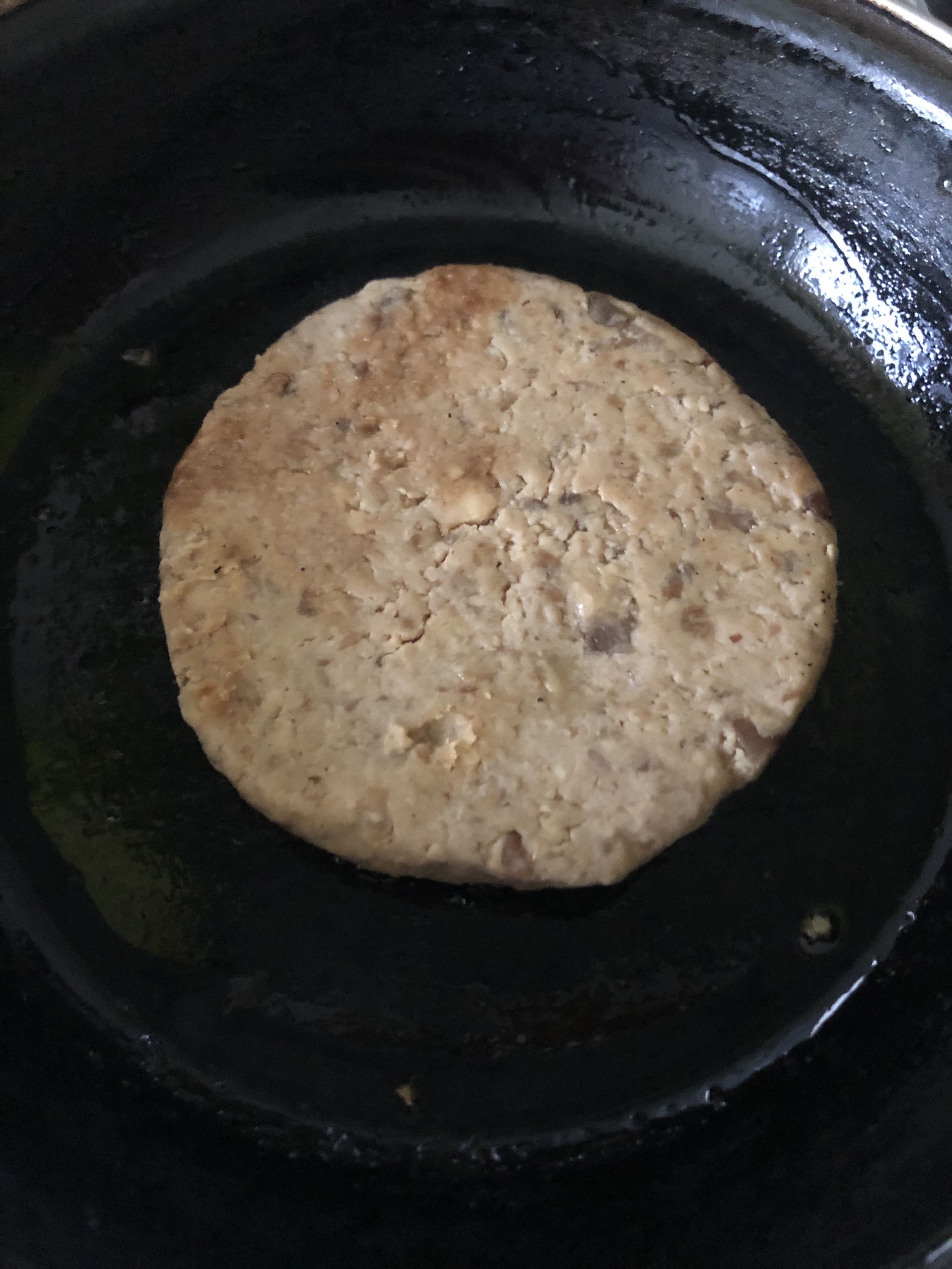 Pasado este tiempo, divide la masa en 4 raciones, haz una bola y aplasta con las manos para darle forma de hamburguesa. La masa debe quedar firme, que no se deshaga al manipularla. Si necesitas añadir un poco de harina para espesarla hazlo (en mi caso, la cantidad de humedad era perfecta para darle textura jugosa y que no se rompiera).Fríe en un poco de aceite, a fuego bajo, hasta que esté dorada por ambas partes.