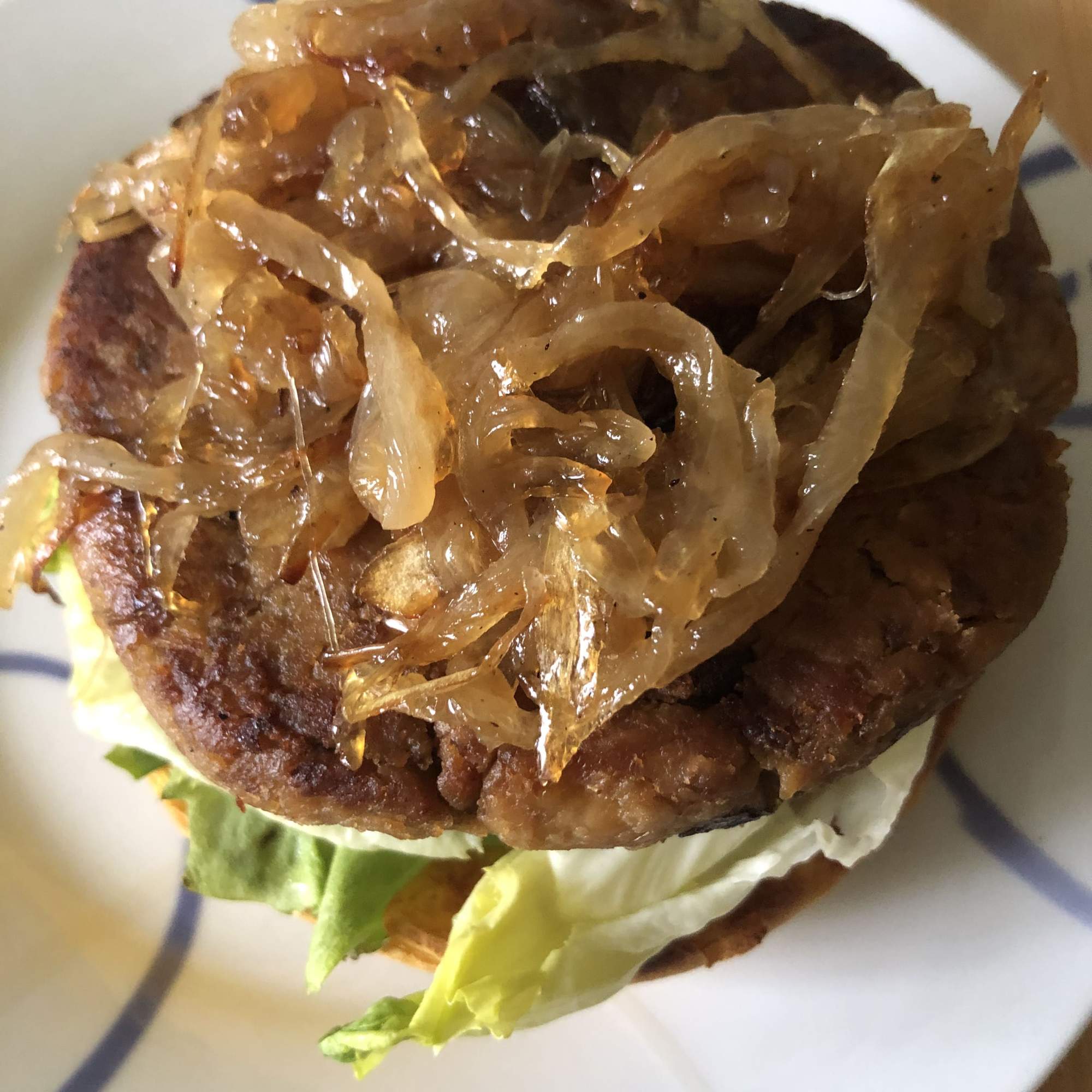 Para el acompañamiento: lava unas hojas de lechuga. Corta una cebolla en juliana fina y cocina a fuego lento, removiendo constantemente, hasta que caramelice. Asa la piña. Monta tu hamburguesa y disfruta.
