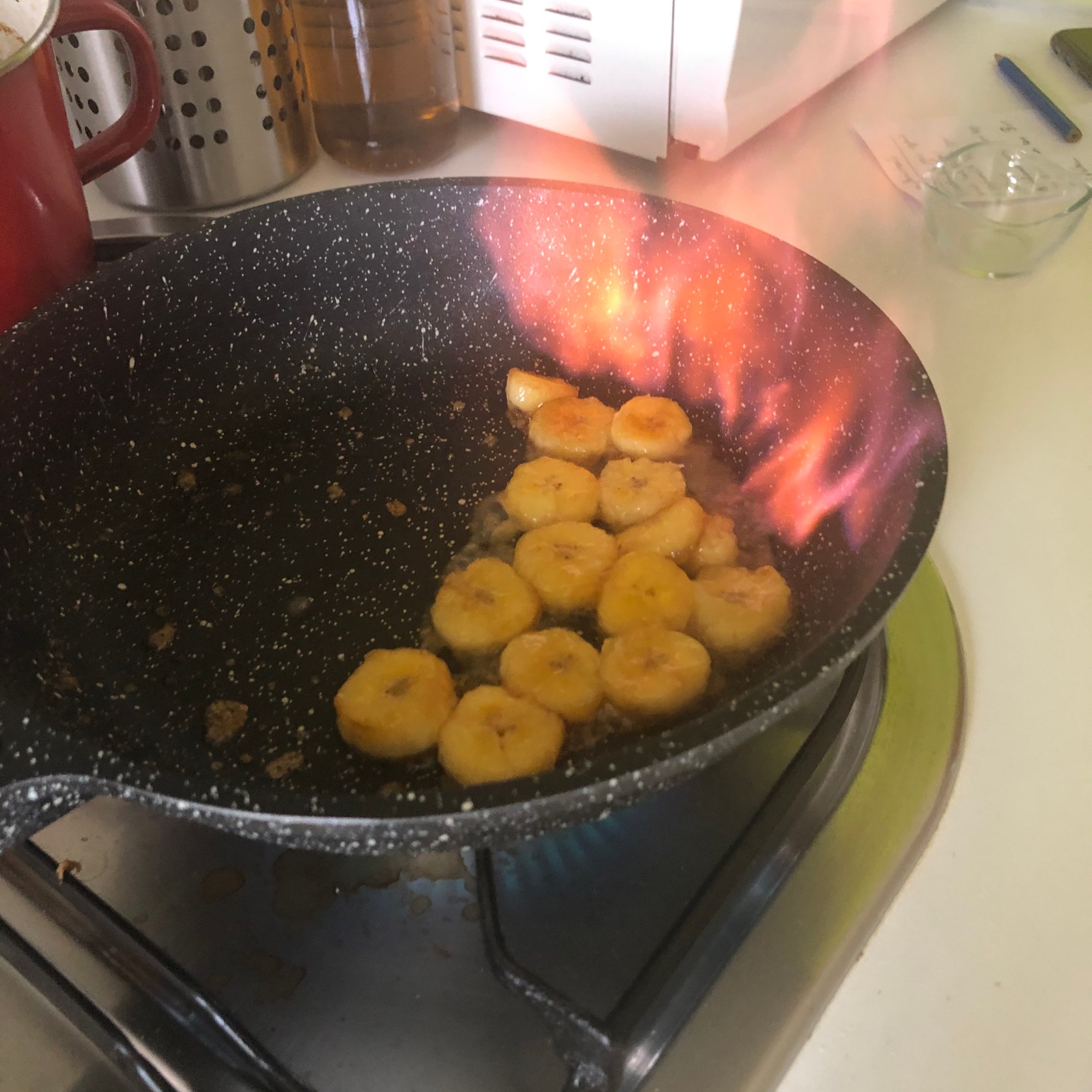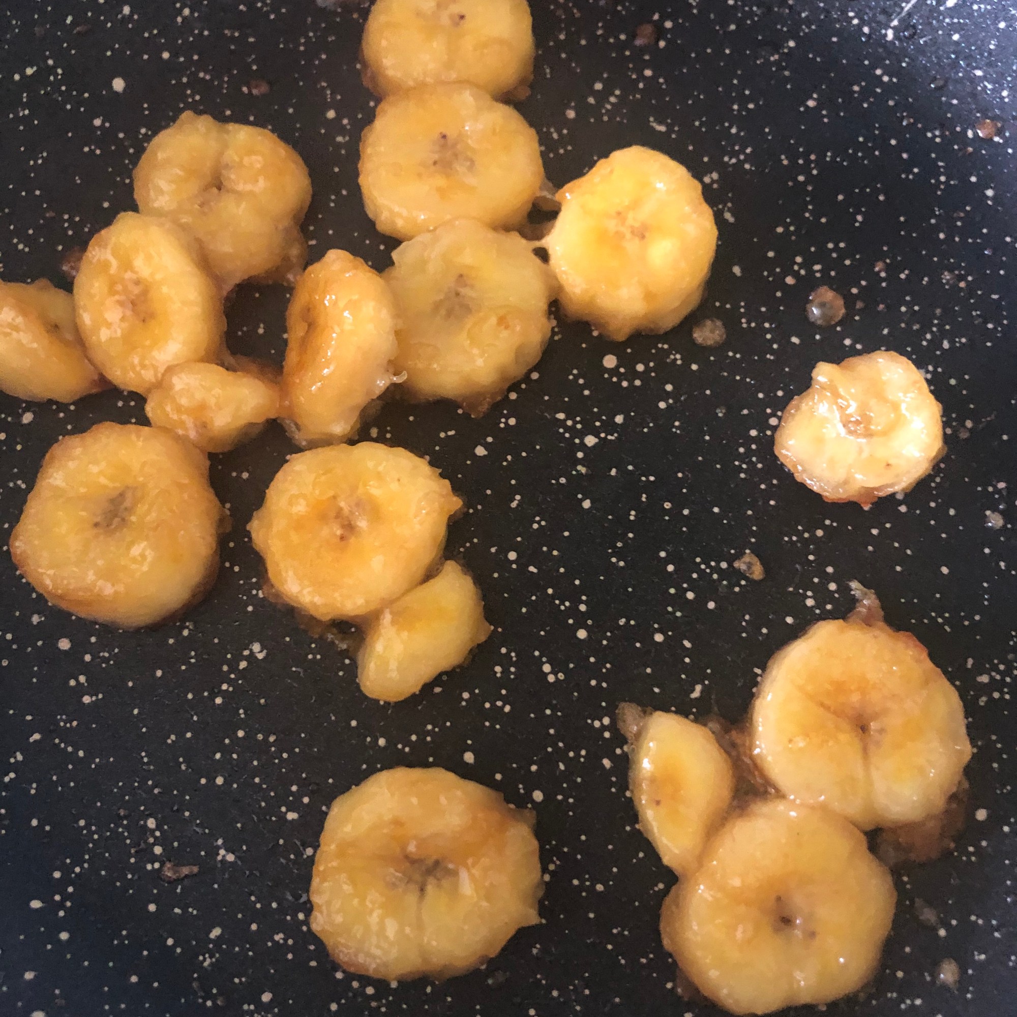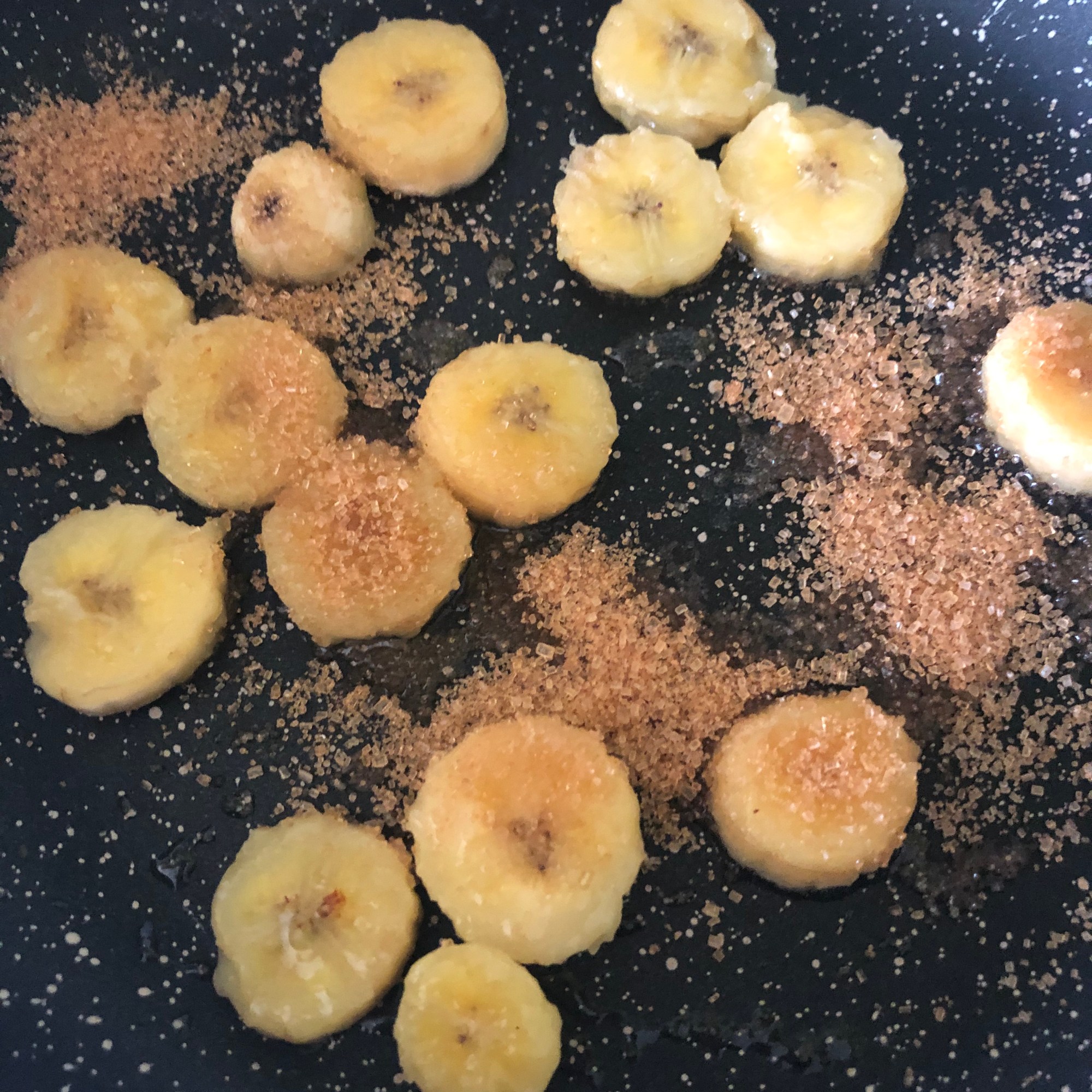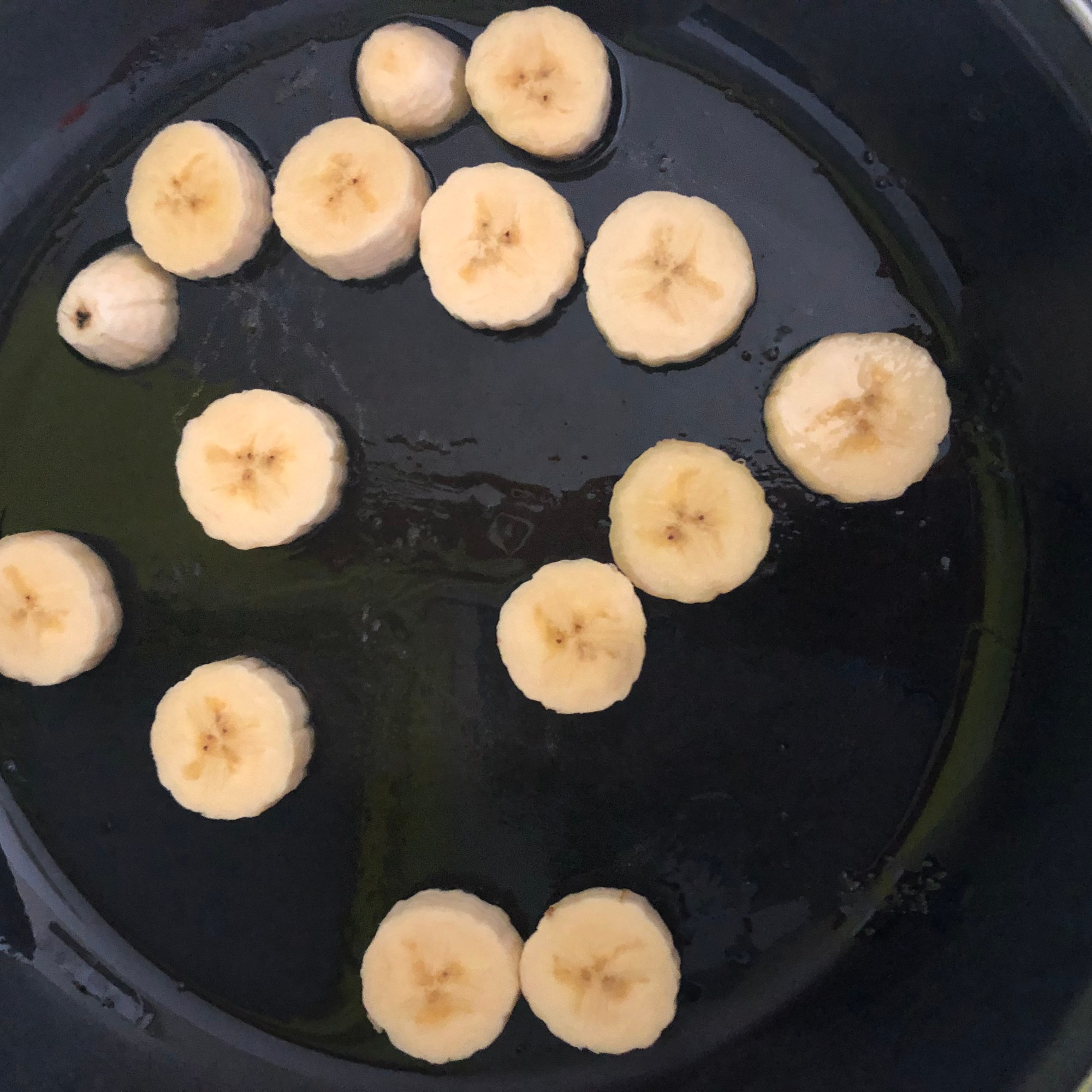 Corta el plátano en rodajas. Calienta el aceite de coco en una sartén y saltea el plátano. Cuando empiece a cambiar de color agrega el azúcar y deja que caramelice. Añade entonces el ron y flambea. Cuando se apaguen las llamas retira del fuego.
