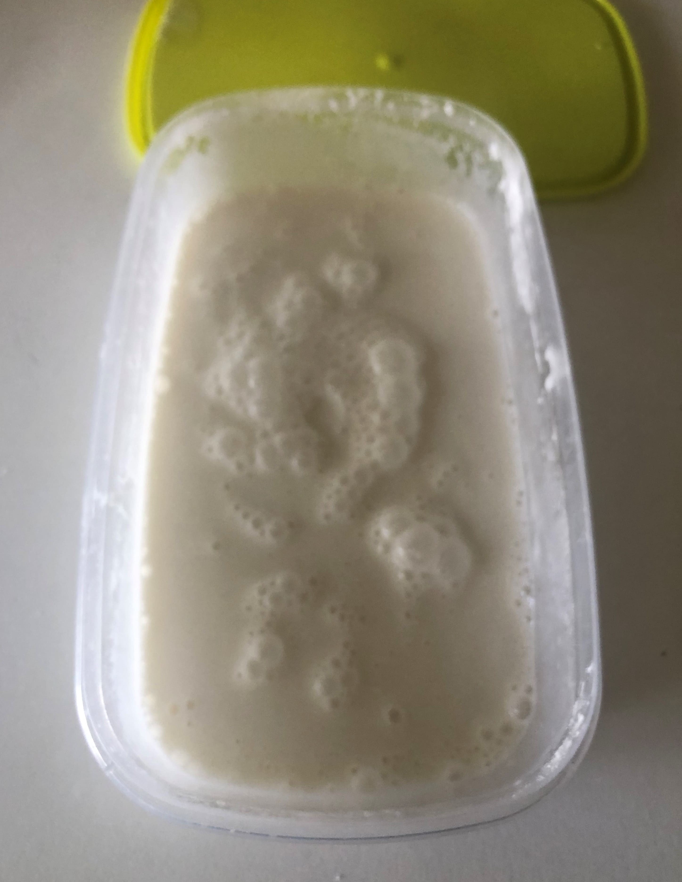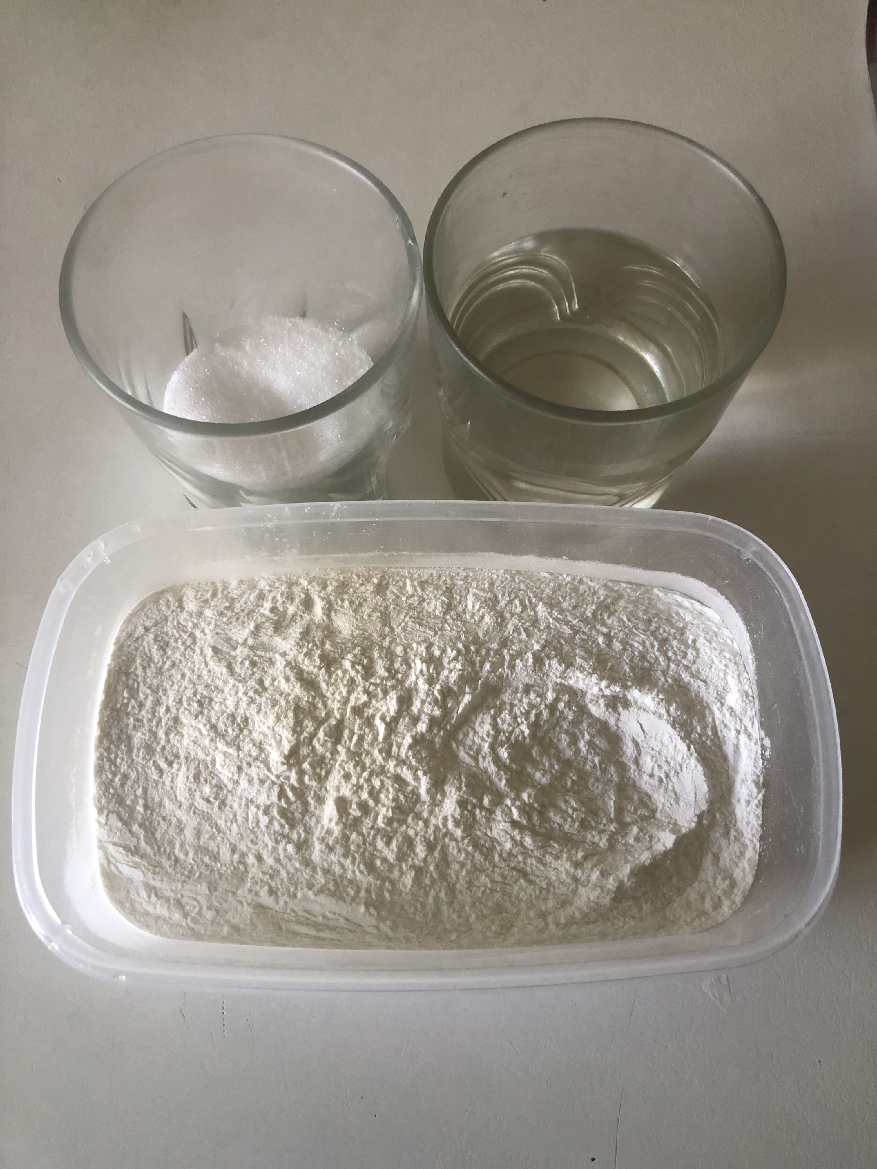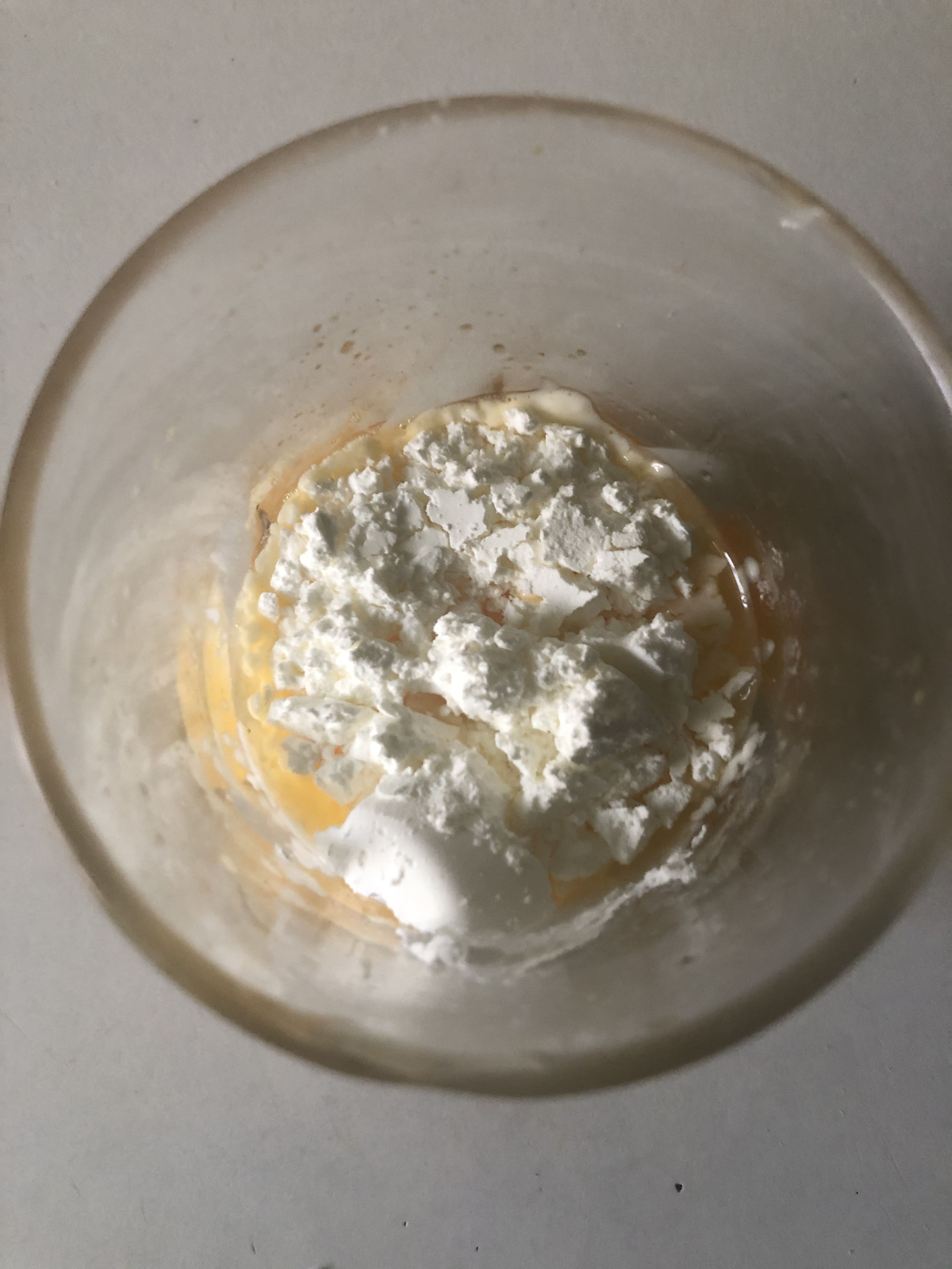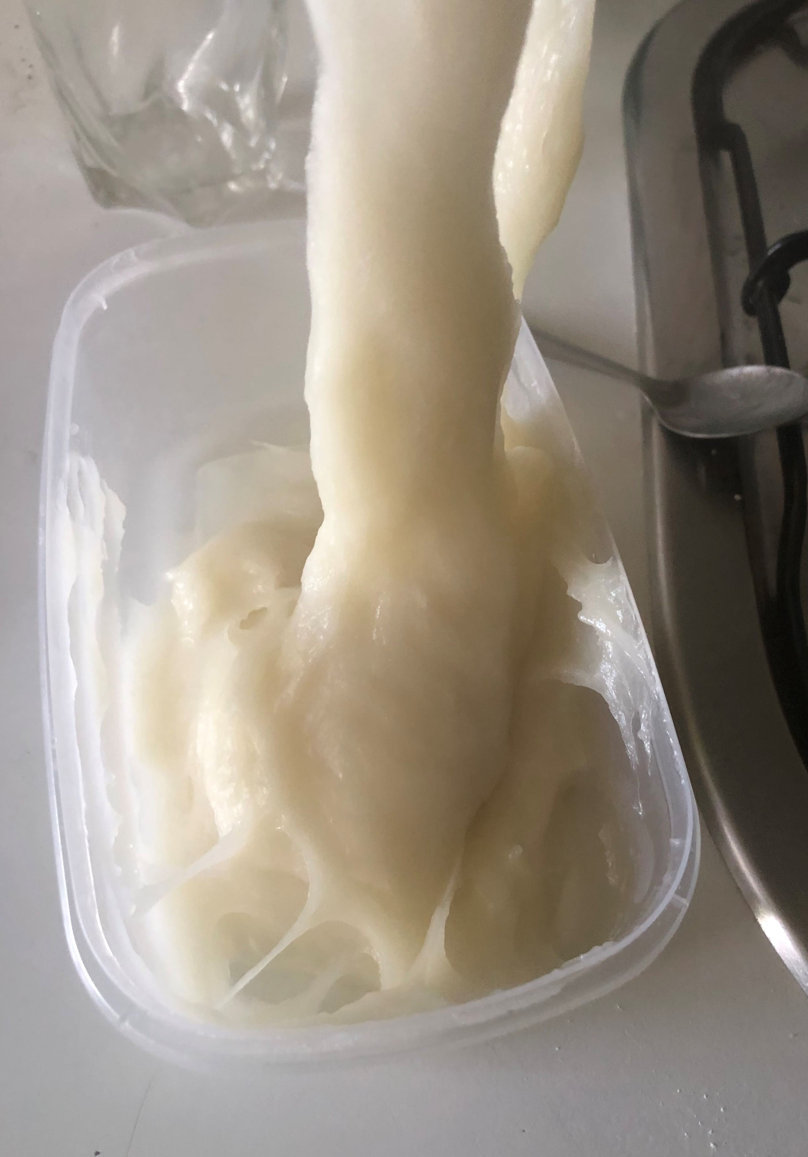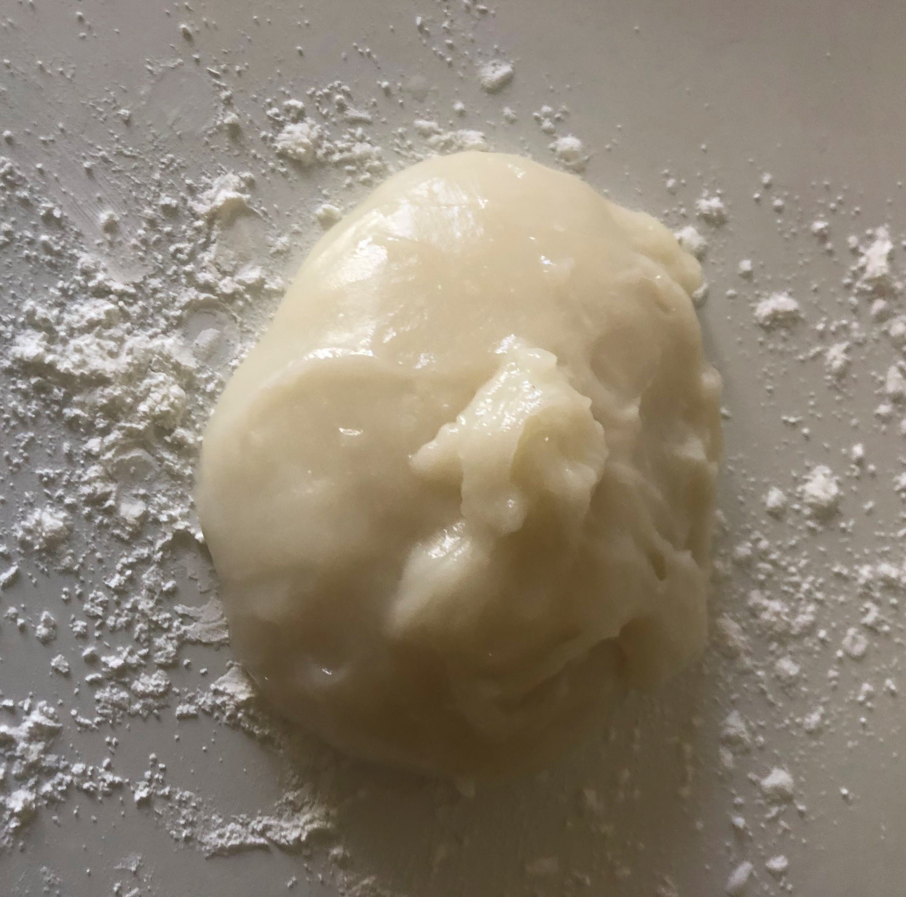 Cubre el recipiente con papel film (o con una tapadera si utilizas un tupper) y calienta en el microondas a máxima potencia durante 1 minutos. Mezcla la masa con una cuchara de palo o una espátula. Vuelve a tapar el recipiente y calienta otros 2 minutos. Mezcla la masa para que se cocine uniformemente, verás que empieza a hacerse pastosa. Tapa de nuevo el recipiente, calienta otro minuto y vuelve a mezclar bien. Repite el proceso por última vez. Verás que, tras 4 minutos, la masa tiene un aspecto brillante y textura de chicle. Así es como debe quedar.