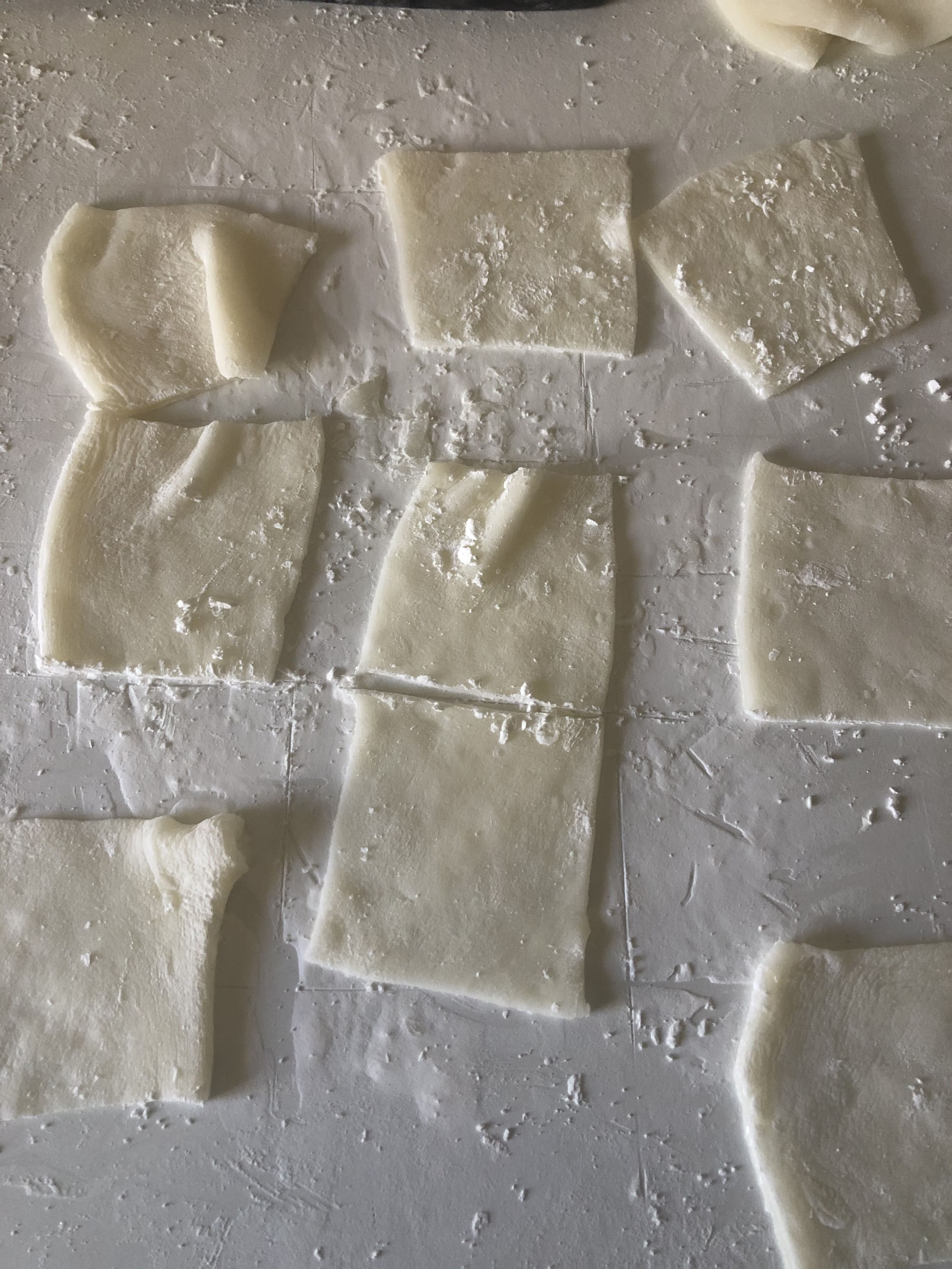 Espolvorea maicena sobre la superficie de trabajo. Divide la masa en dos para una mejor manipulación. Déjala reposar sobre la maicena unos 5 minutos y espolvorea maicena también sobre ella. Empieza a estirar con un rodillo hasta 0,5 cm, utilizando maicena suficiente, ya que es una masa muy pegajosa. Corta en cuadrados (o círculos) (te recomiendo hacerlos