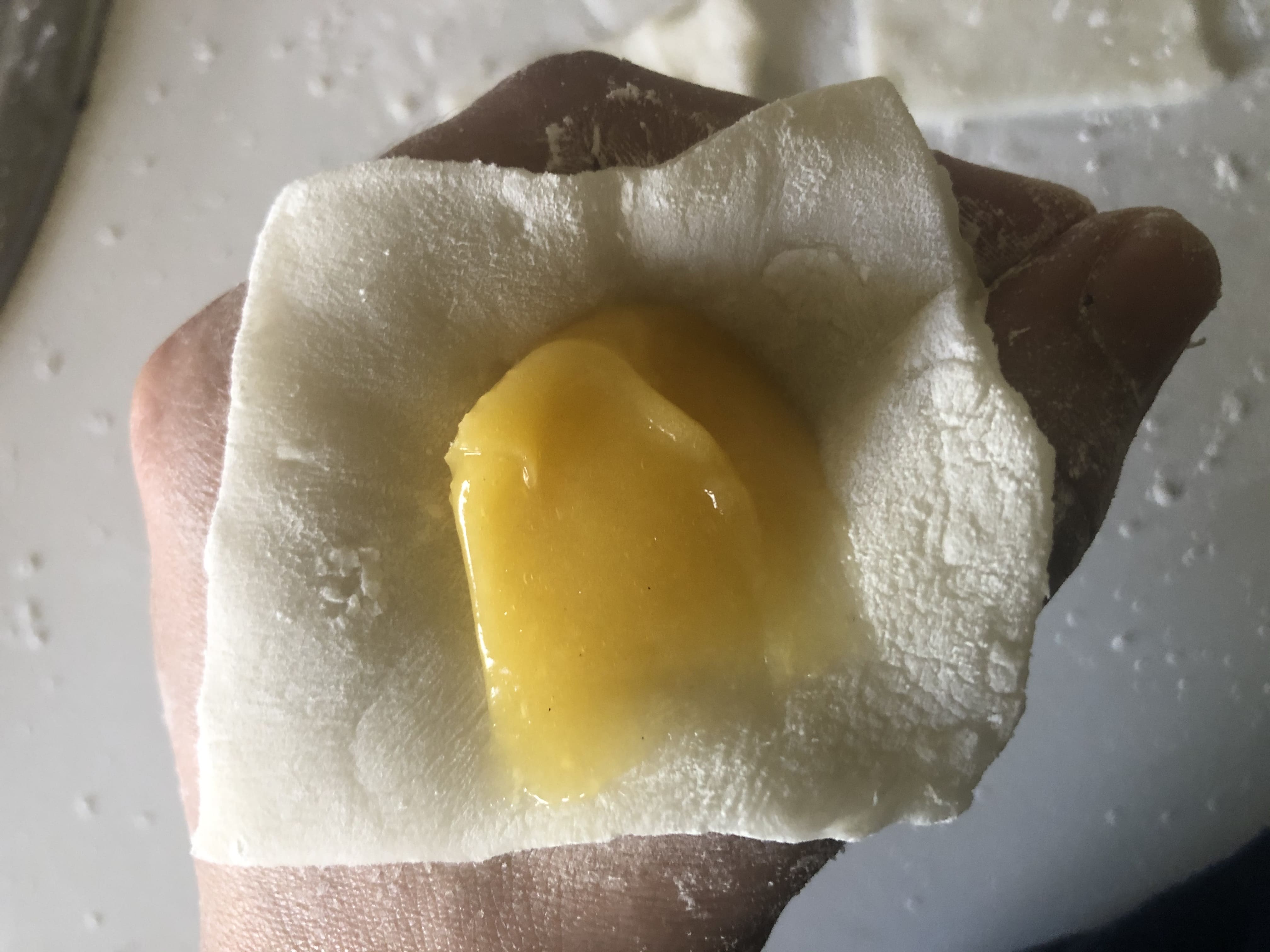 Si la crema está muy sólida, puedes triturarla con la batidora para hacerla más cremosa (aunque mantendrá la consistencia ideal para rellenar tus mochis). Une tus dedos pulgar e índice y coloca un trozo de masa en el hueco. Rellena con la crema. Une las puntas (te dejo link para que veas cómo se hace), elimina la masa sobrante y termina de sellar el mochi con maicena.
