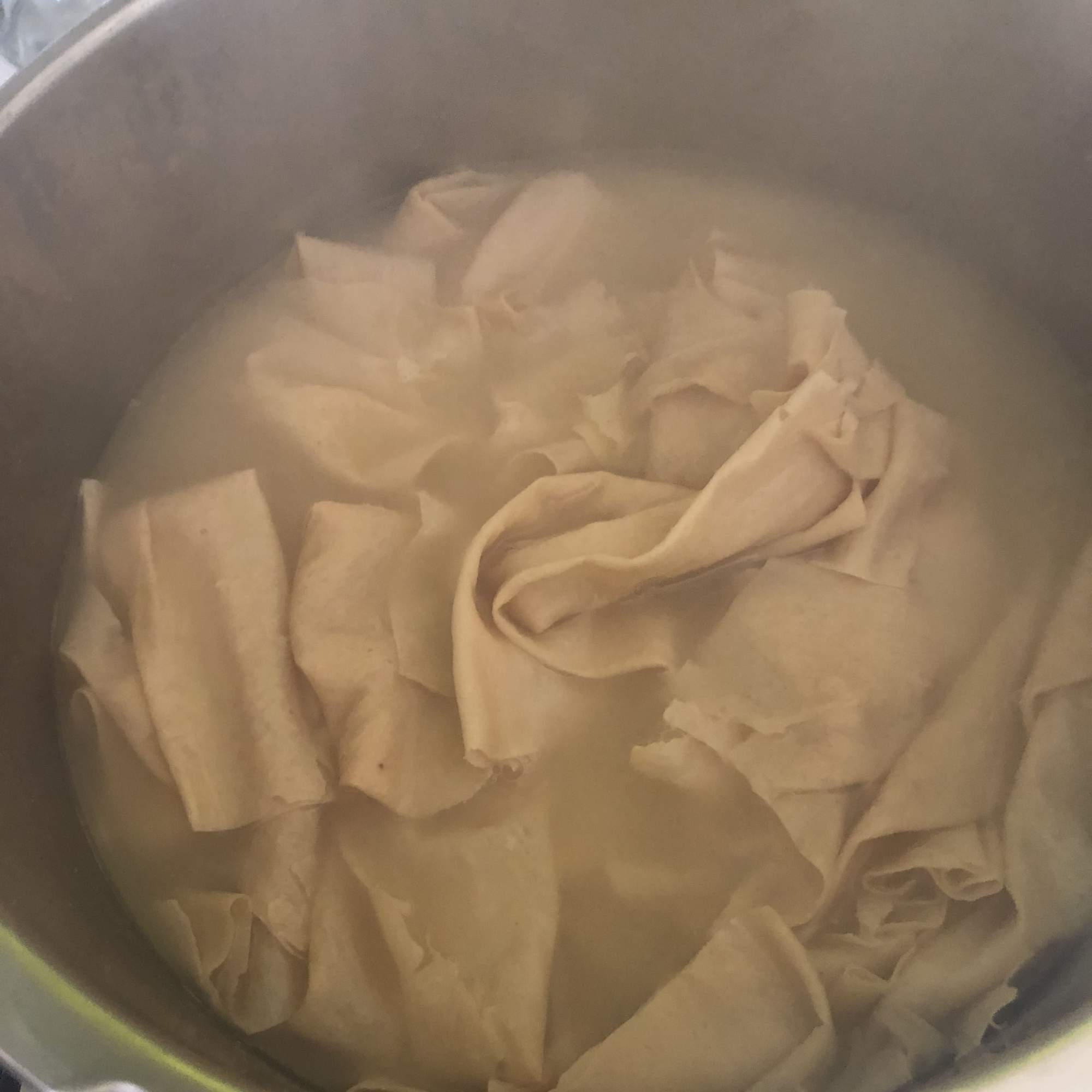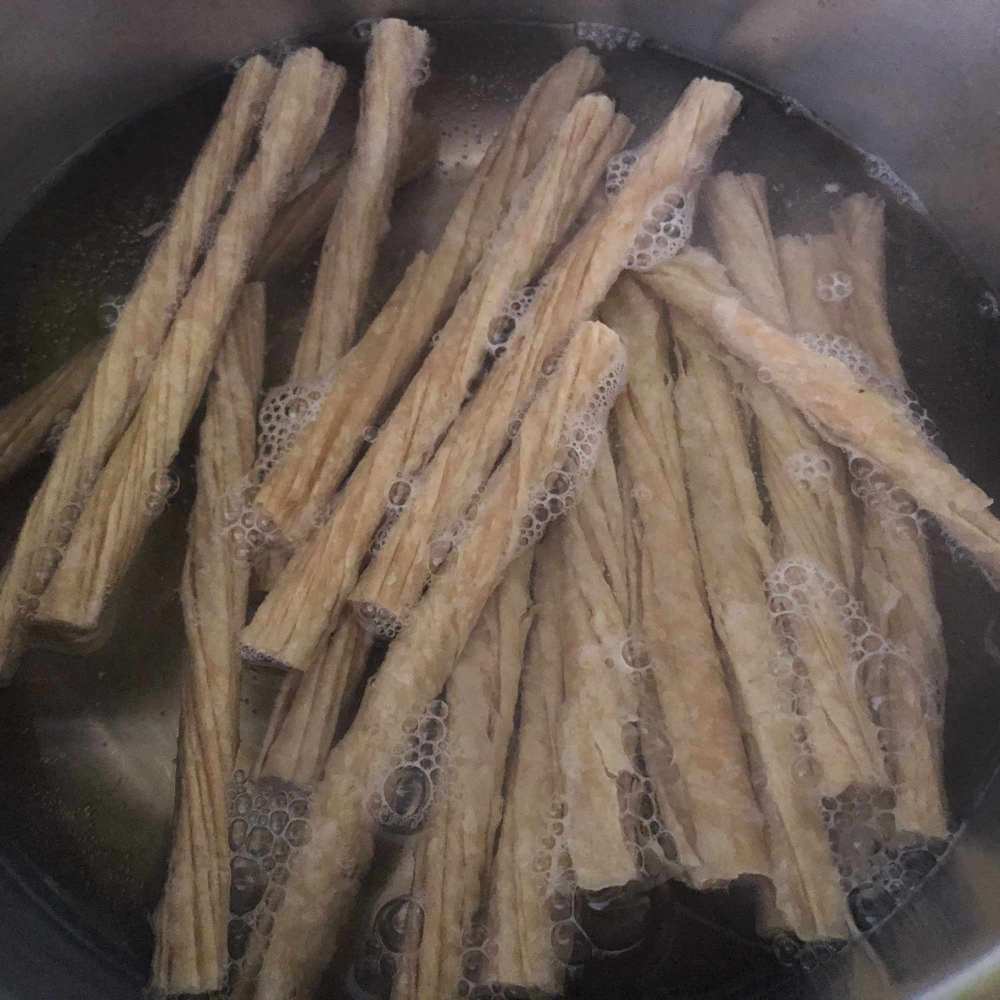 Cuece la yuba en abundante agua con la sal, el azúcar y el vinagre hasta que esté tierna (unos 40 minutos). Enfría con agua y elimina el exceso (no pasa nada si queda un poco húmeda, facilita los pasos posteriores).