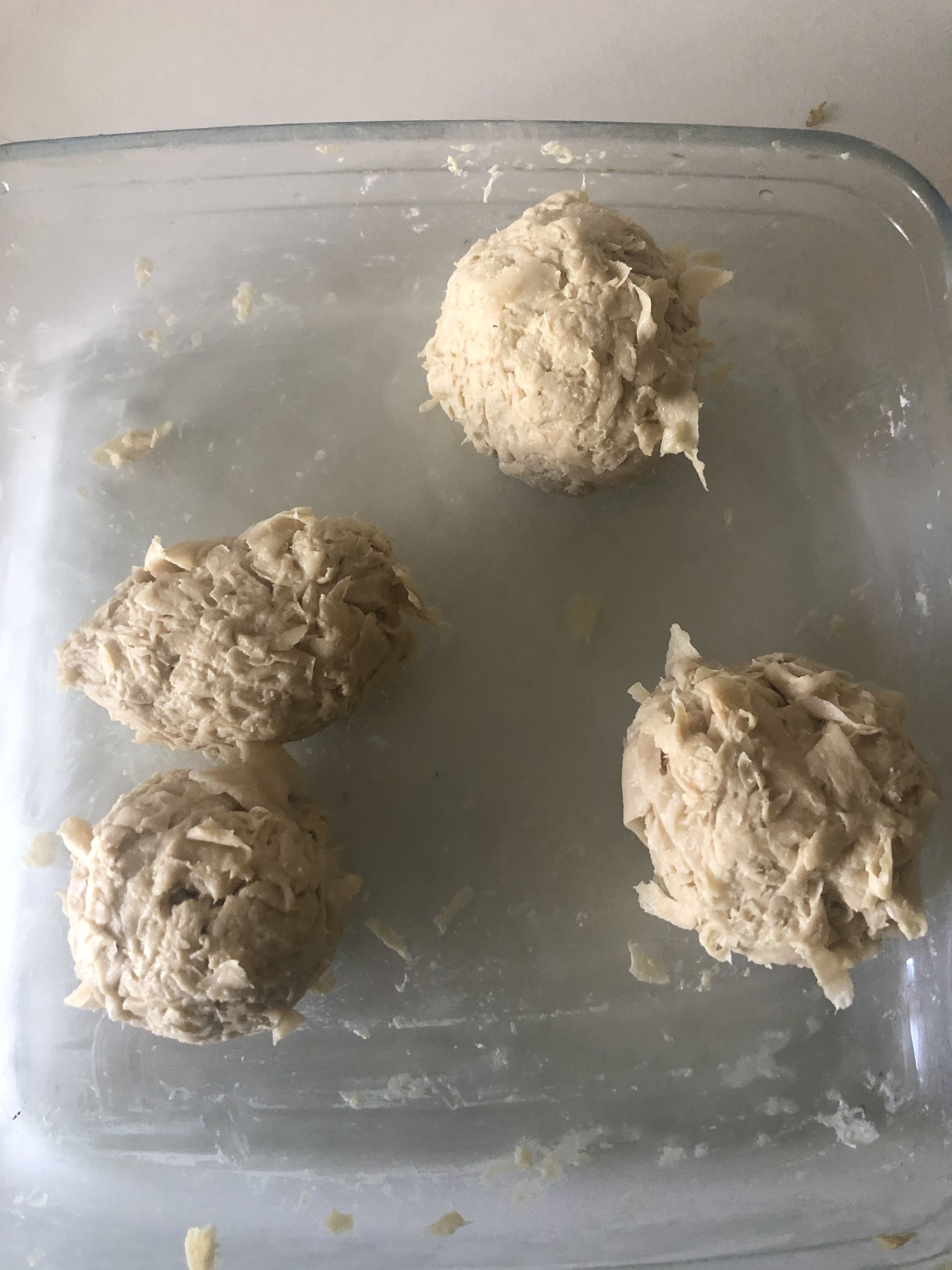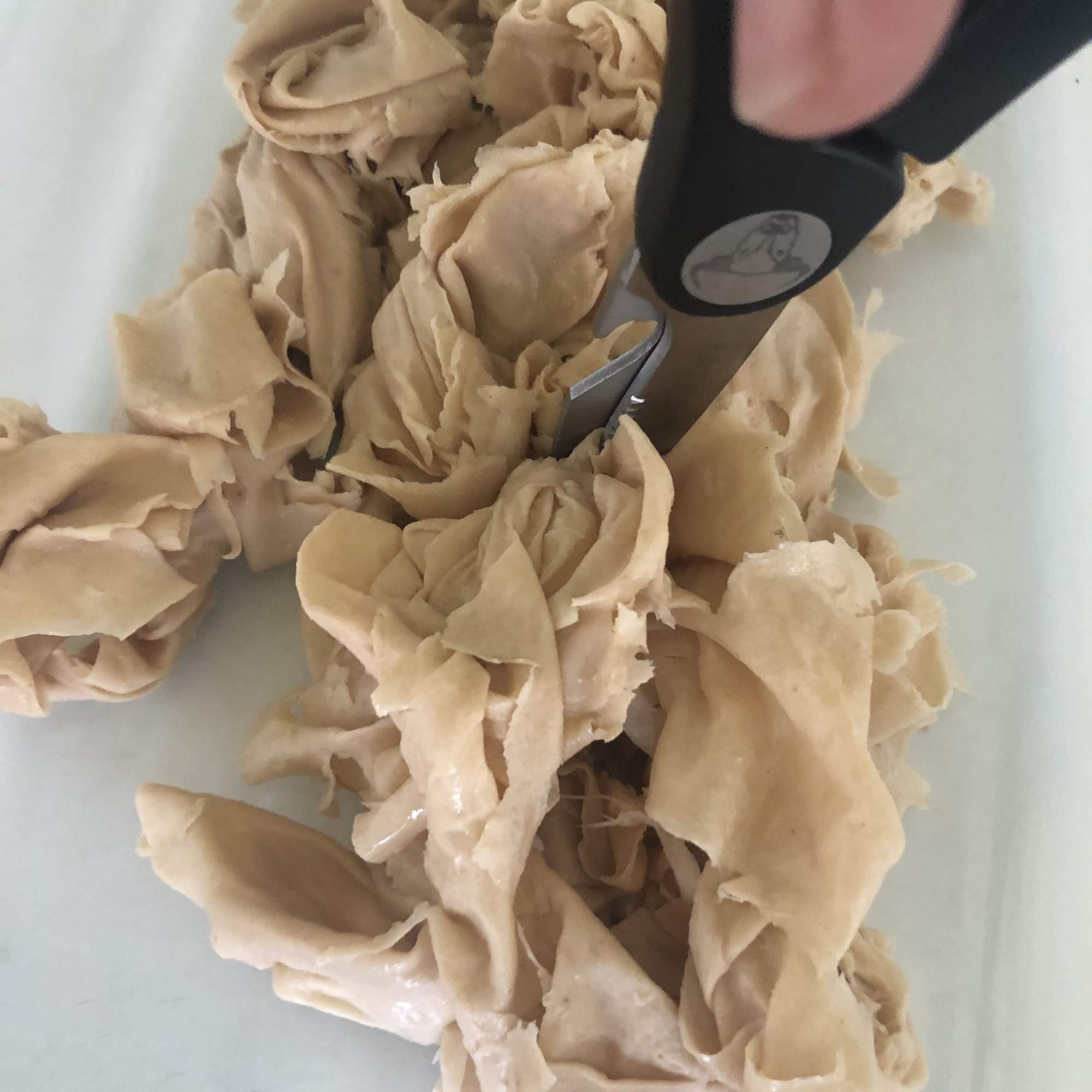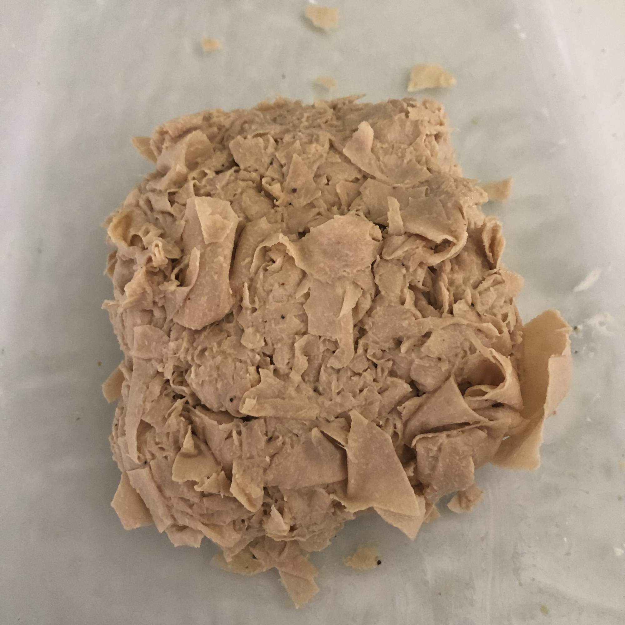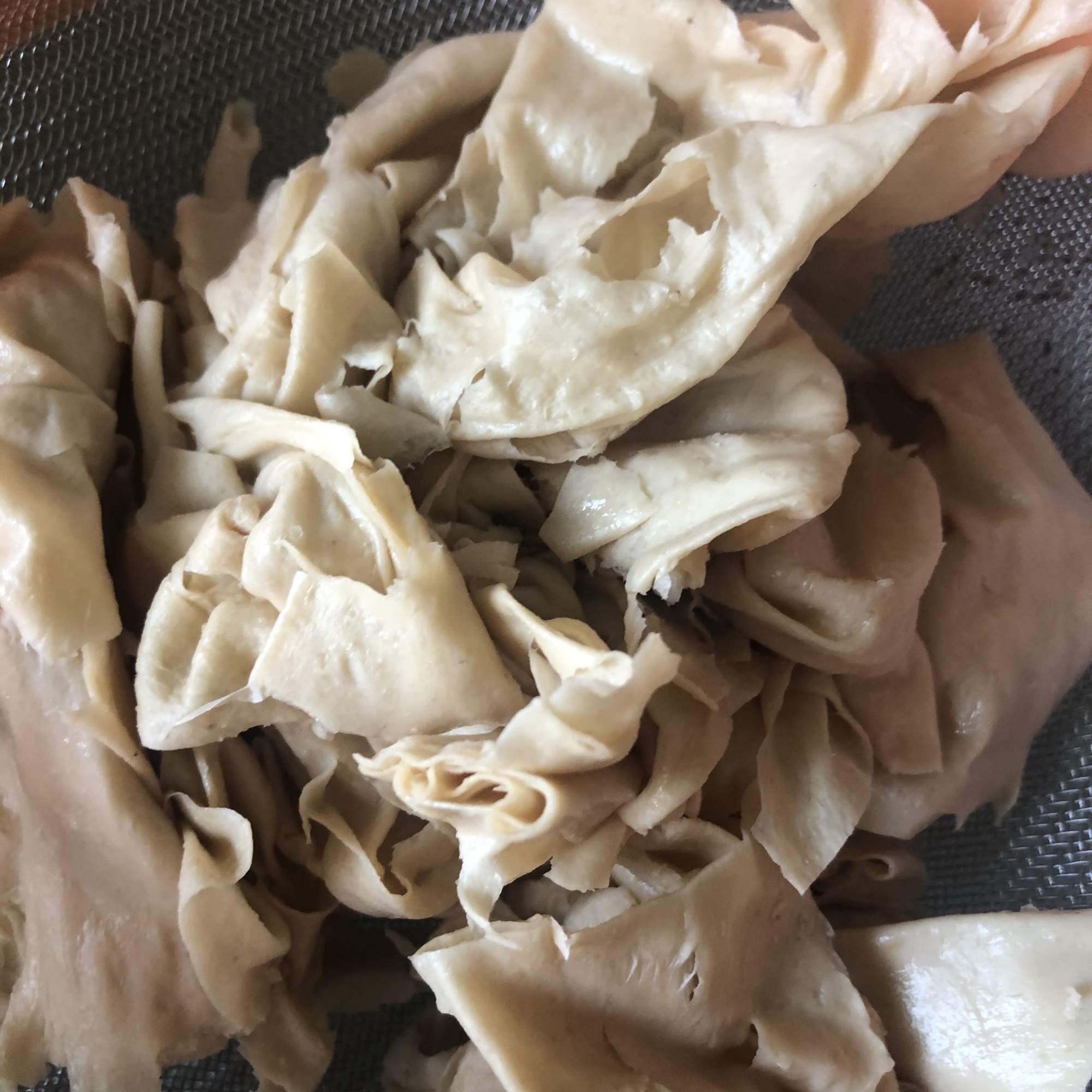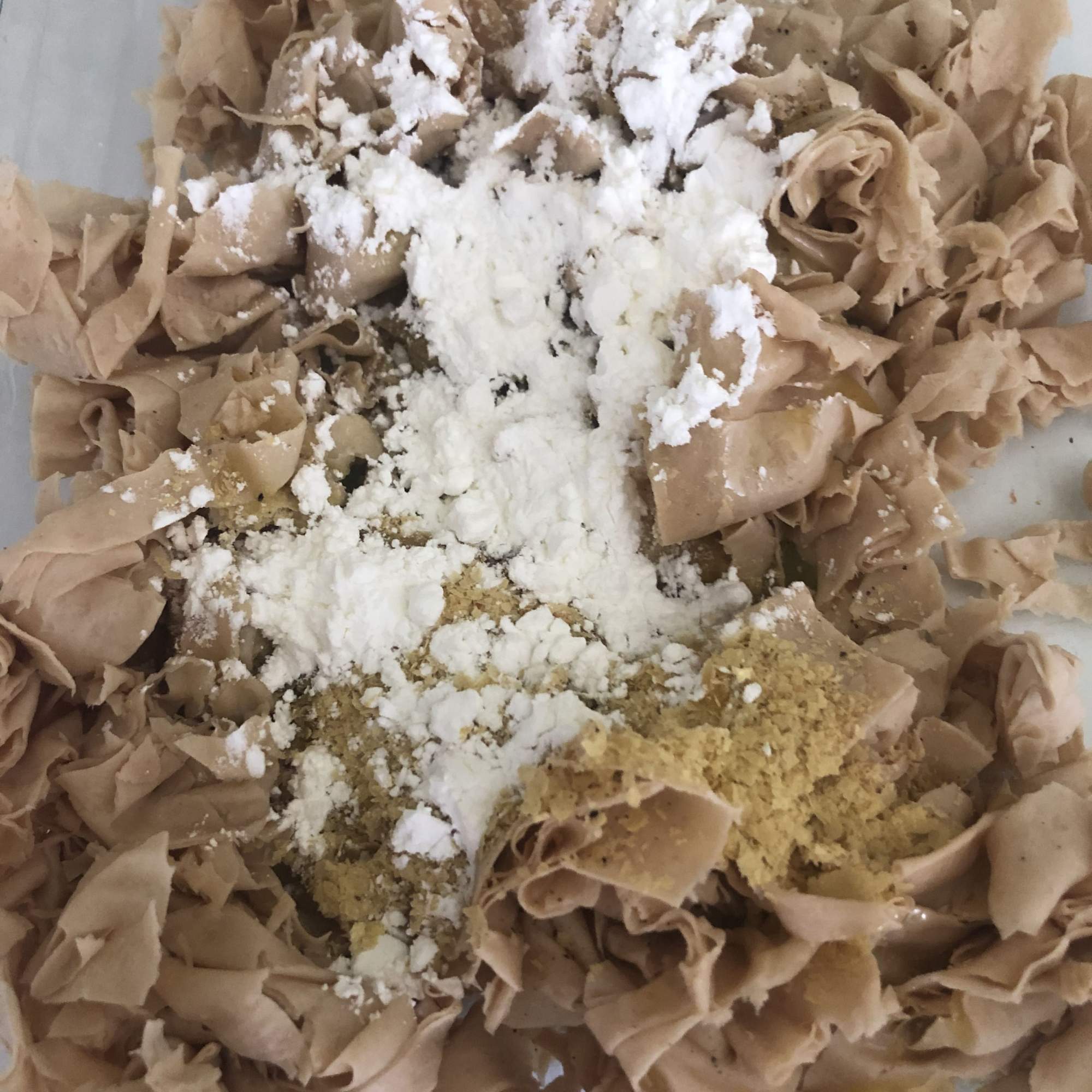 Coloca la yuba en un recipiente grande y corta con una tijera en trozos más o menos pequeños (aunque si está bien cocida, se va a deshacer al eliminar el agua). Añade la sal, la levadura nutricional, el ajo en polvo, la maicena y el aceite de oliva y mezcla con las manos. Debe quedar una masa compacta (ajusta la cantidad de maicena si es necesario).