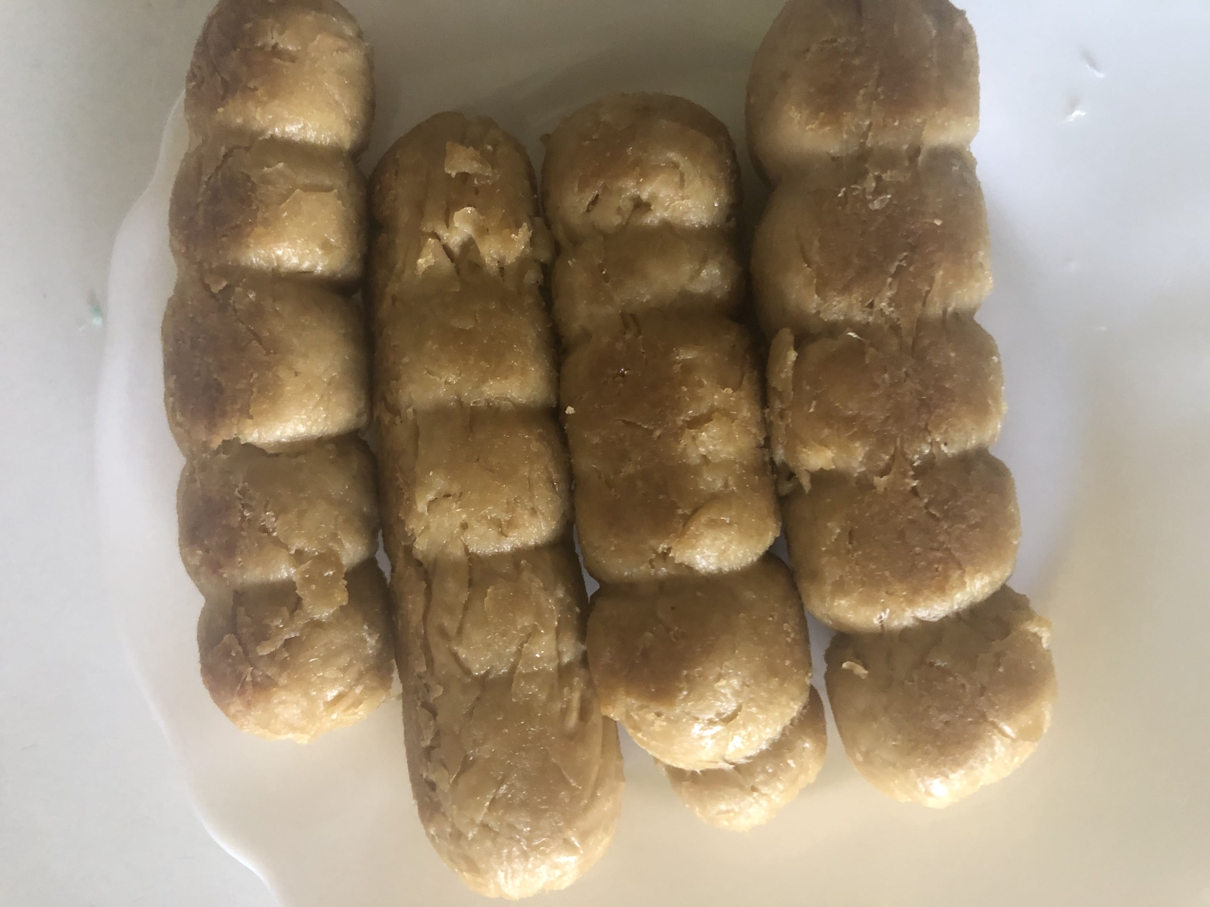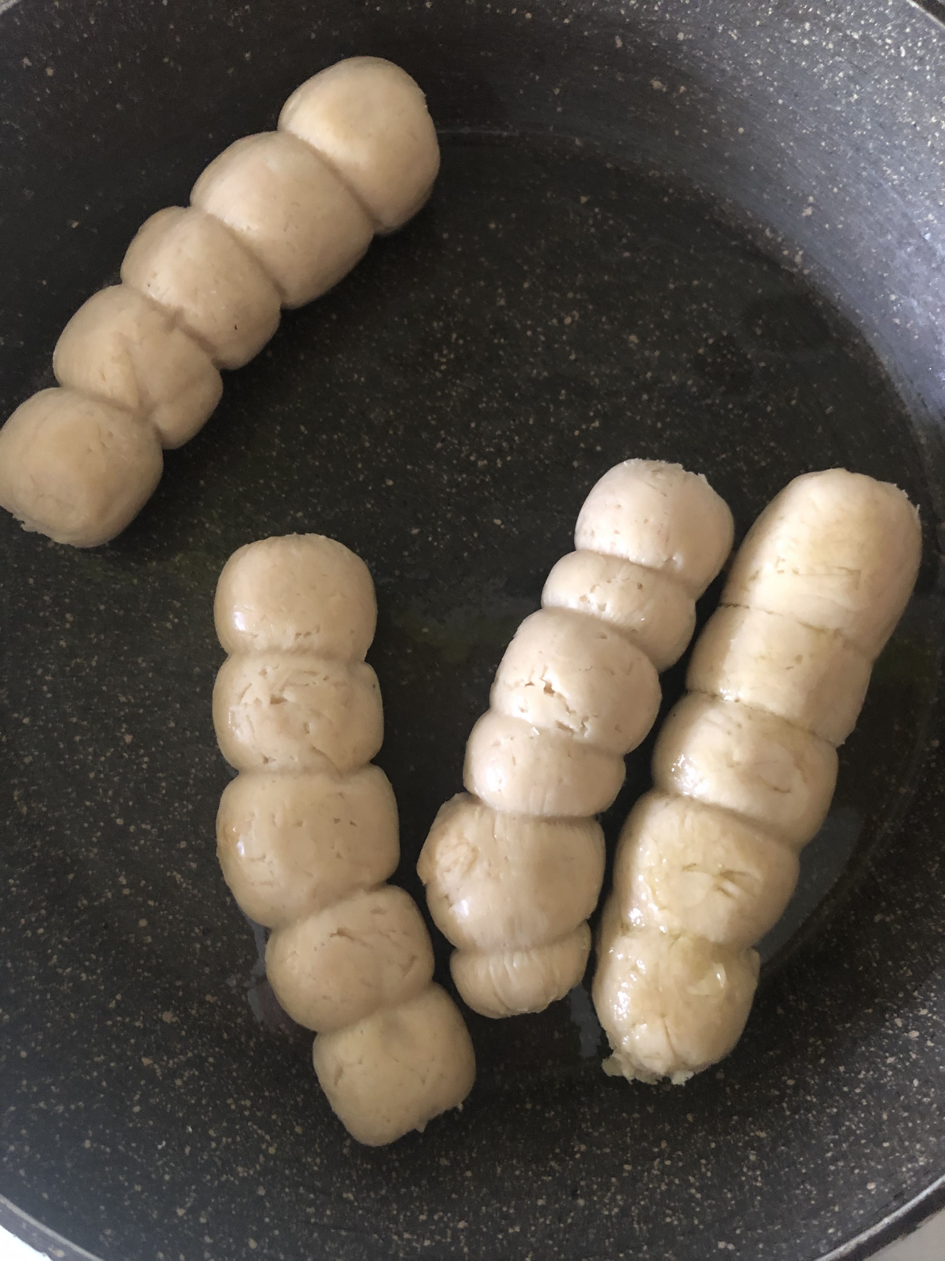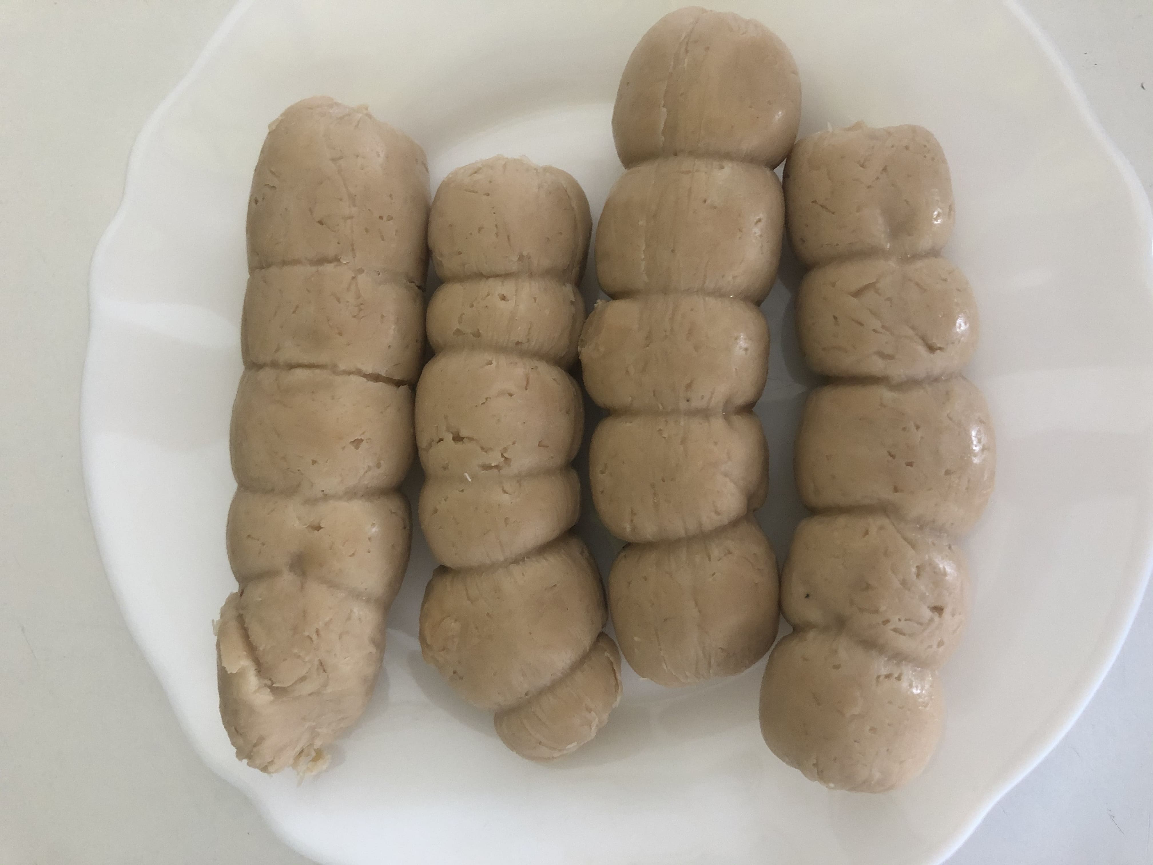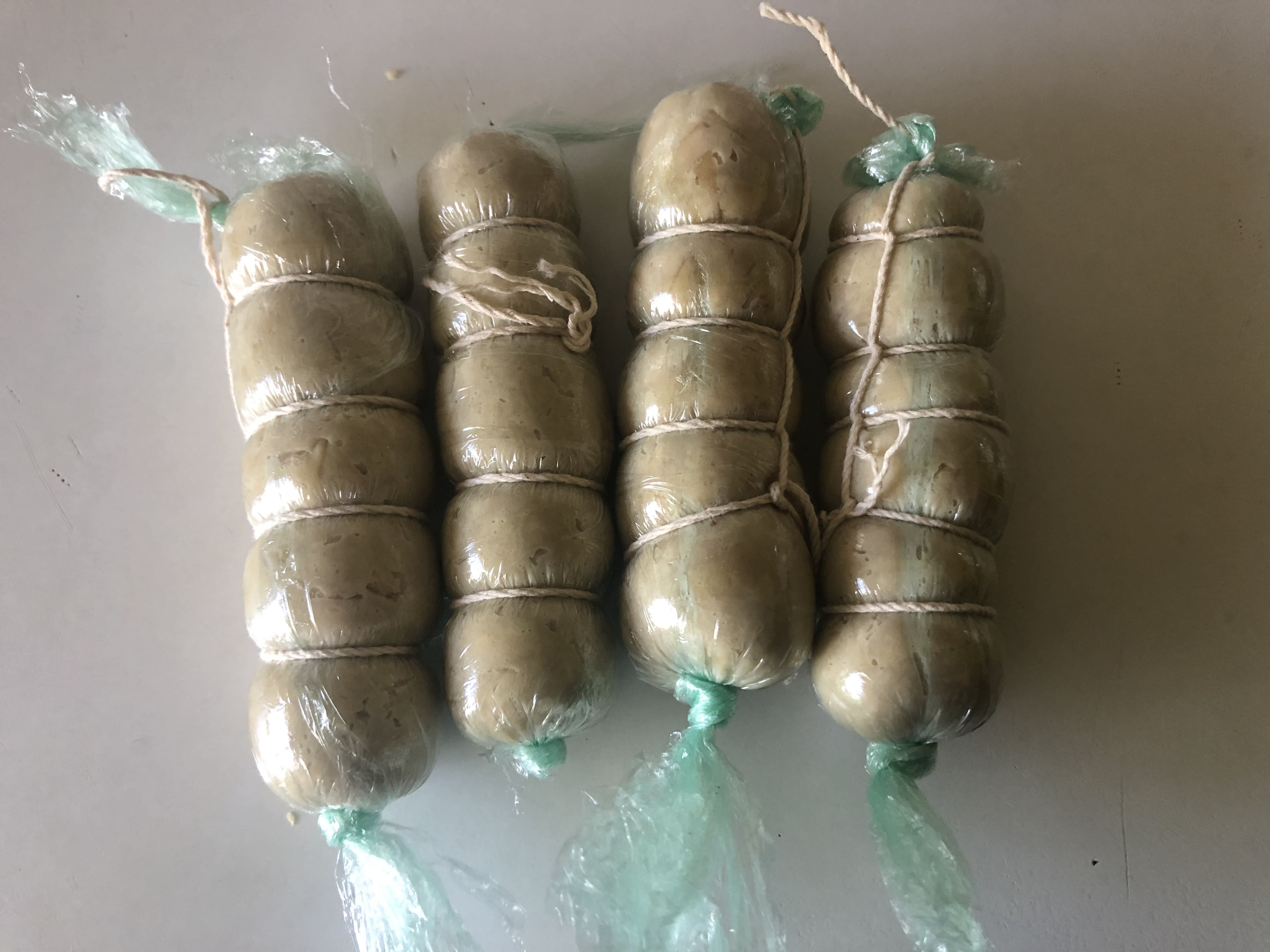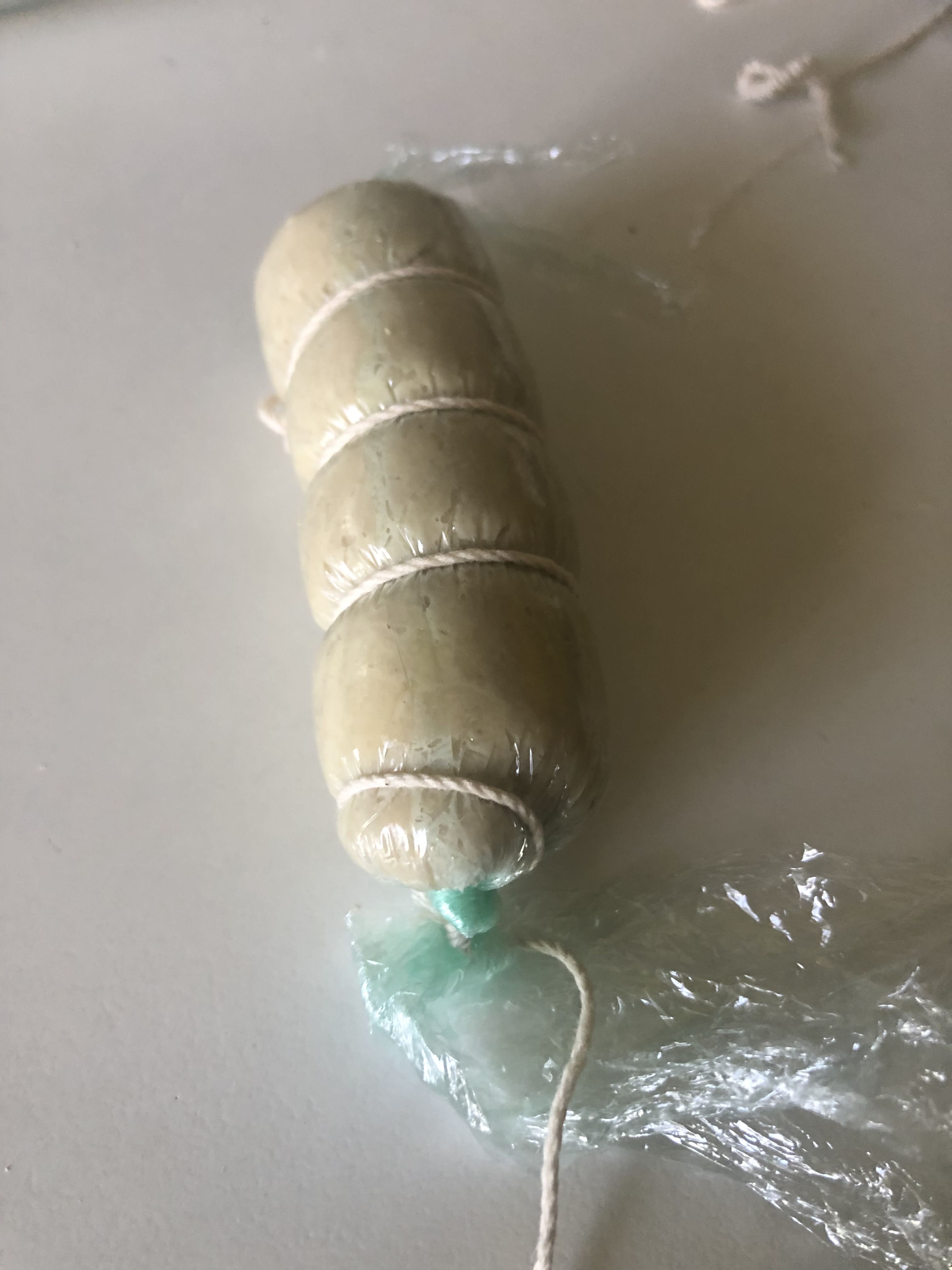 Divide en porciones. Corta un trozo de papel film y coloca una porción de masa. Envuelve haciendo un churrito, intentando que quede compacto. Anuda ambos extremos y ata con hilo de cocina (el proceso es el mismo que cuando haces un solomillo relleno). Hierve durante 5 minutos y deja enfriar.