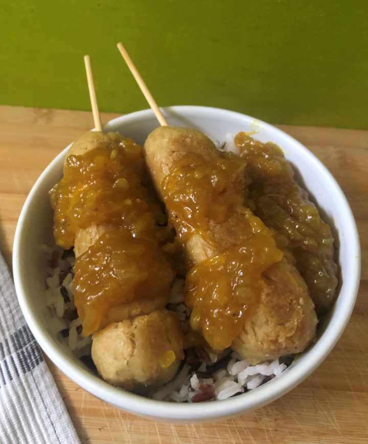 Sirve las brochetas calentitas, acompañadas de arroz y chutney de mango y disfruta.