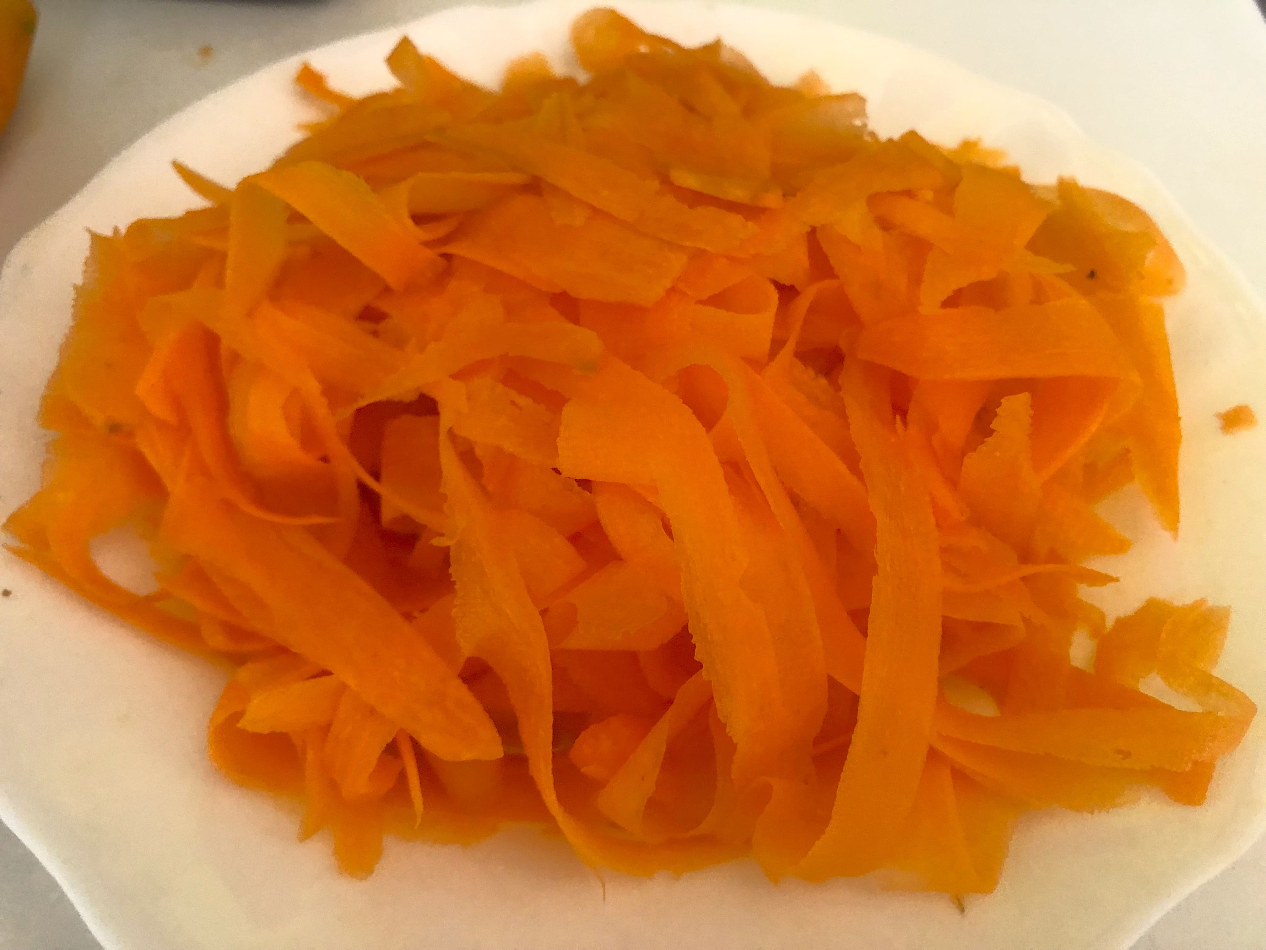 Pelas las zanahorias y ralla con un rallador o mandolina, haciendo tiras más o menos anchas según prefieras. Coloca en un bol.