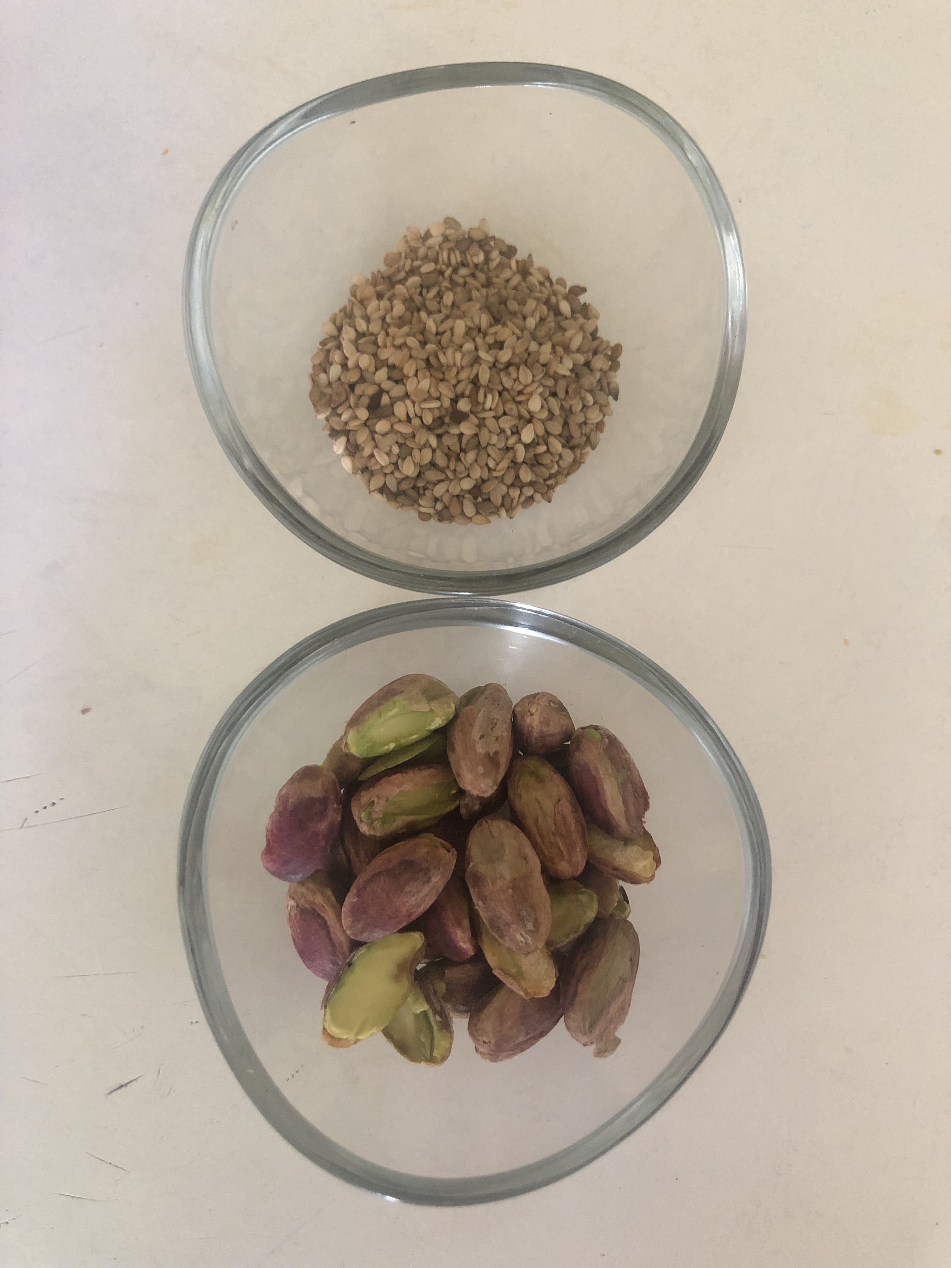 Pela los pistachos y tritura con un mortero (no demasiado fino) y añade al bol.