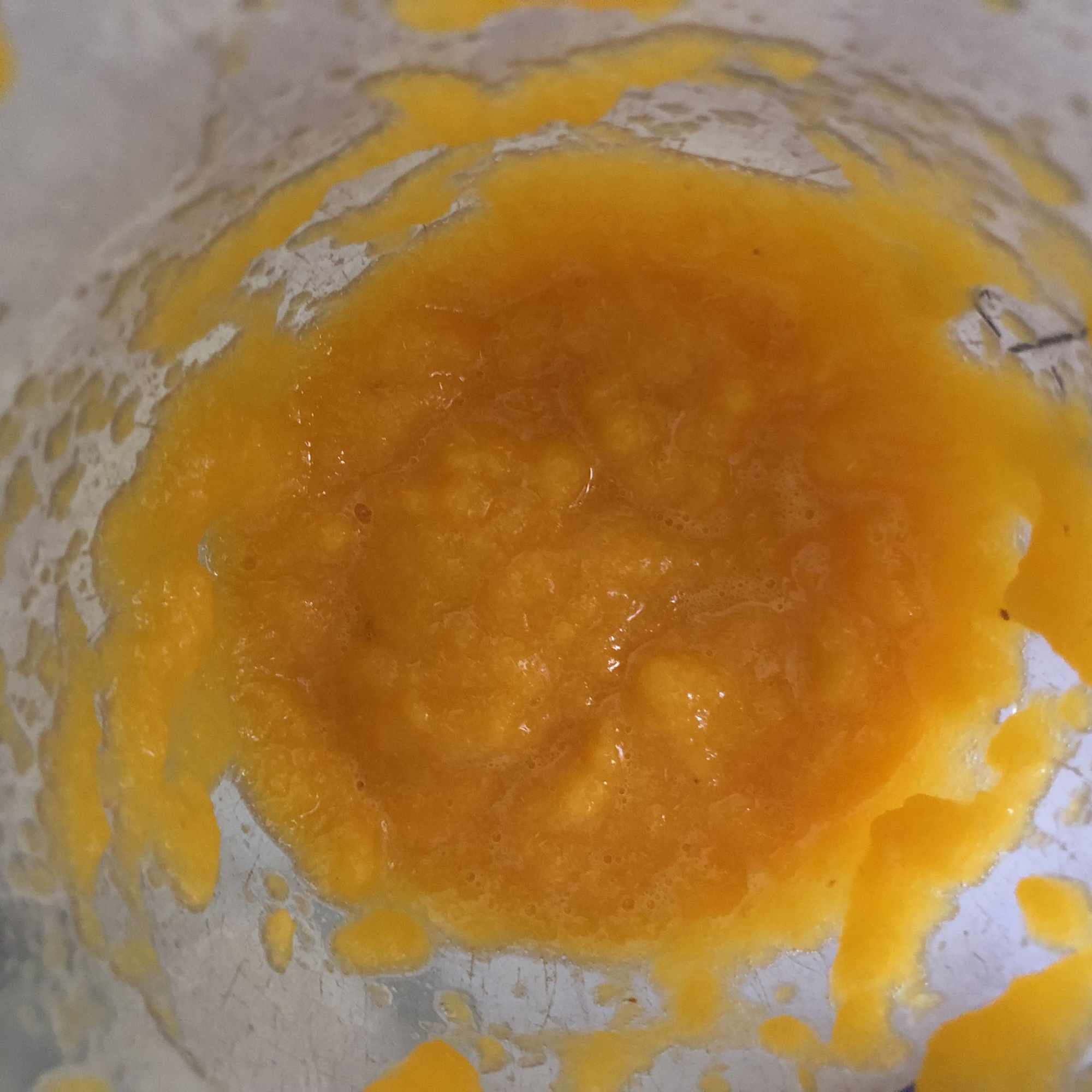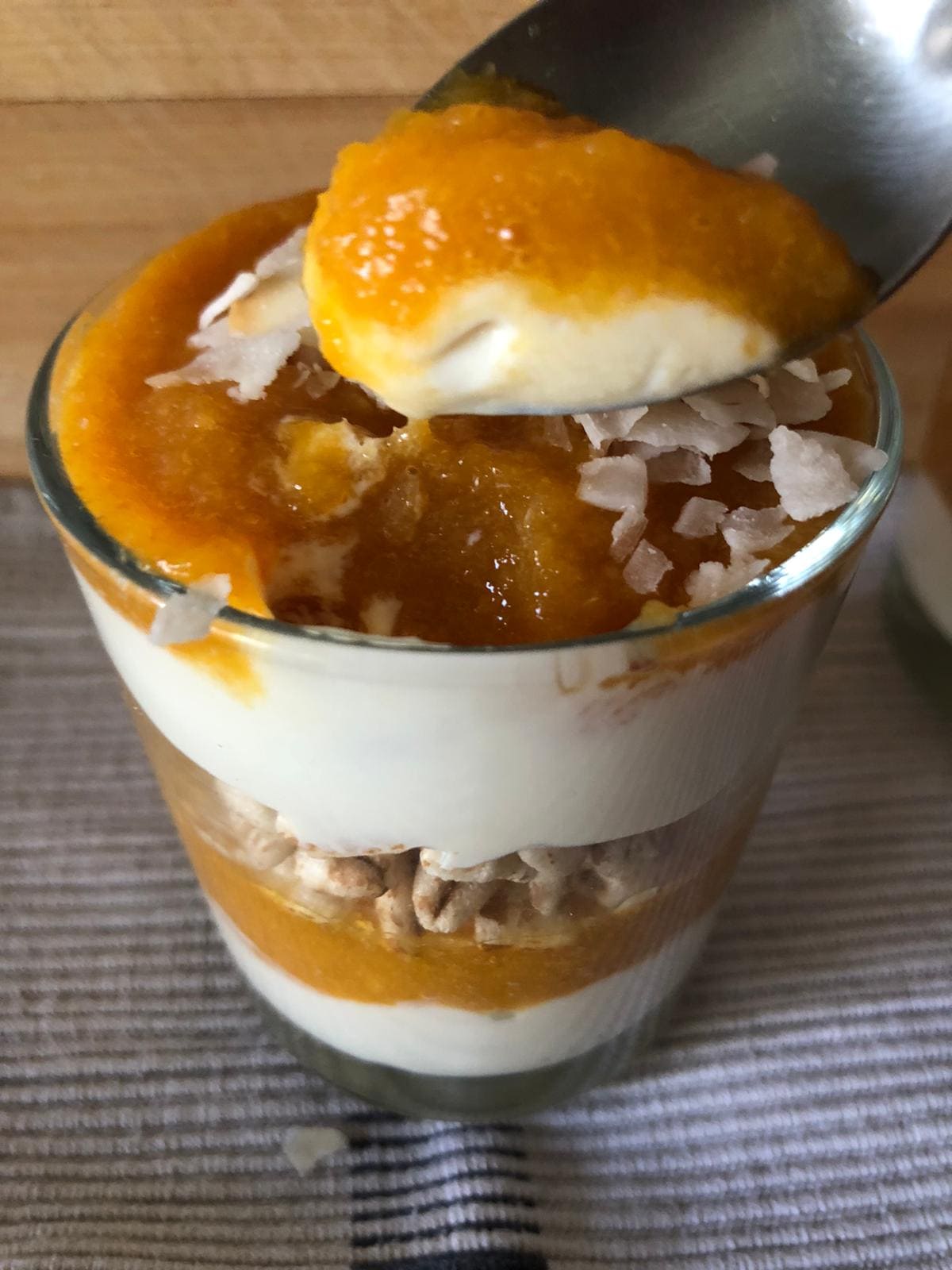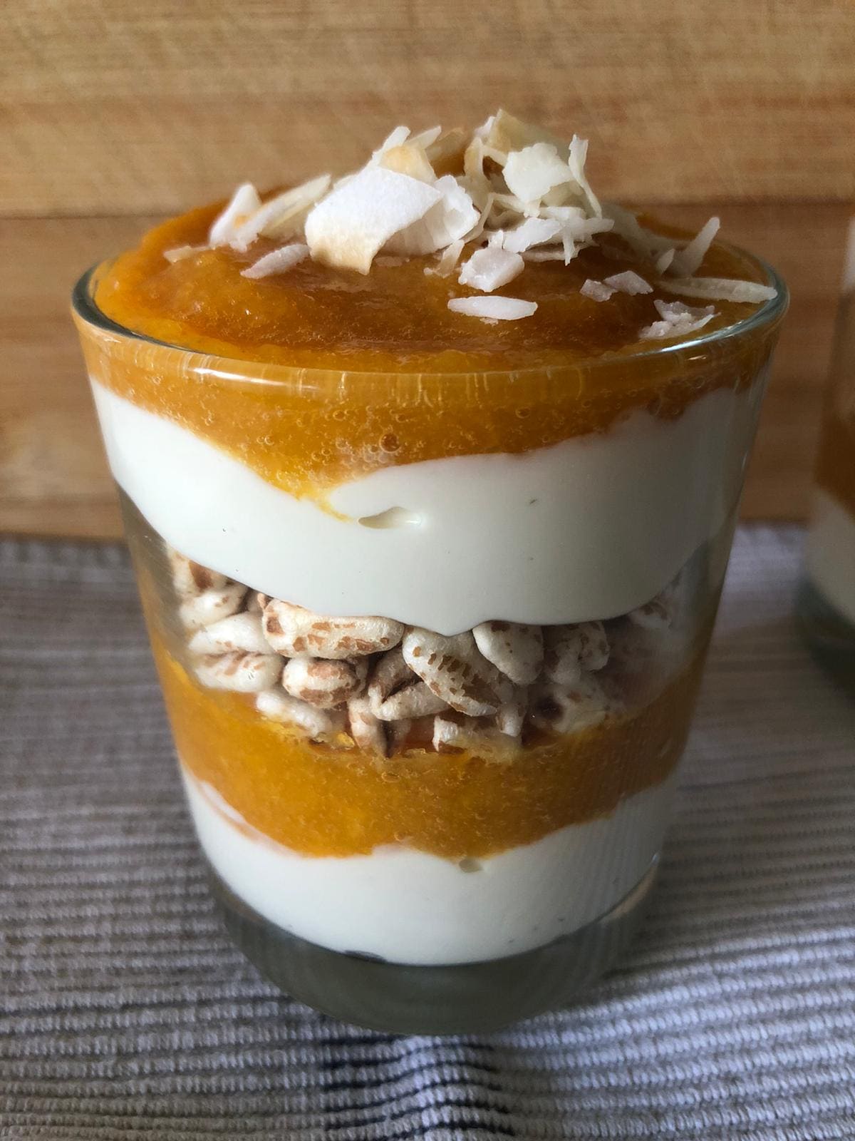 En un vasito o tarro forma capas alternas de yogur, puré de melocotón y espelta. Decora con coco deshidratado y sirve en el momento para que la fruta no se oxide.