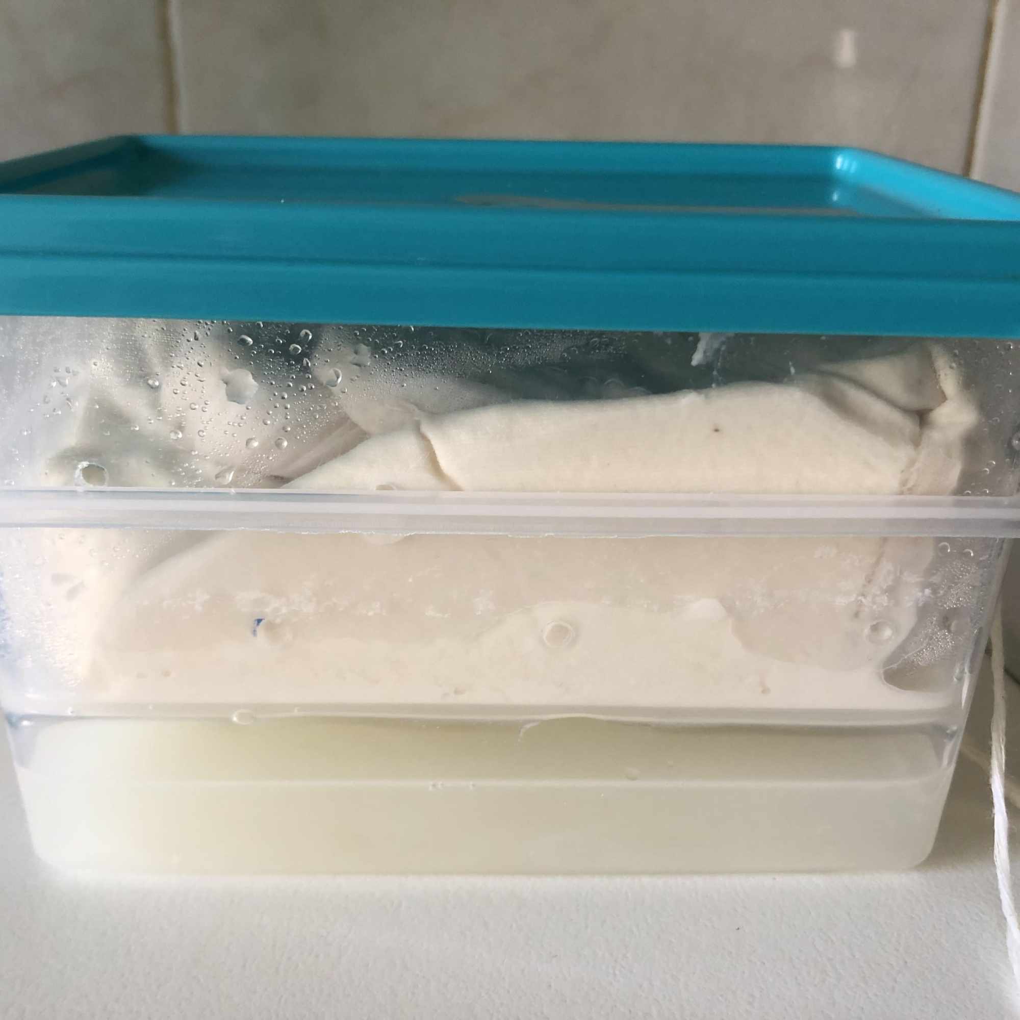 Para que el yogur tenga esa textura tan cremosa, similar al yogur griego, lo he drenado durante la noche, como si fuera a hacer queso. El procedimiento es muy sencillo: vierte el yogur en una tela de algodón de las que se utilizan para las leches veganas, coloca sobre un escurridor y éste sobre otro recipiente para recoger el suero. Yo he utilizado mi «herramienta casera» para hacer tofu. El resultado ha sido espectacular, un yogur cremoso y consistente para dar el cuerpo necesario a esta receta. Qué te parece?